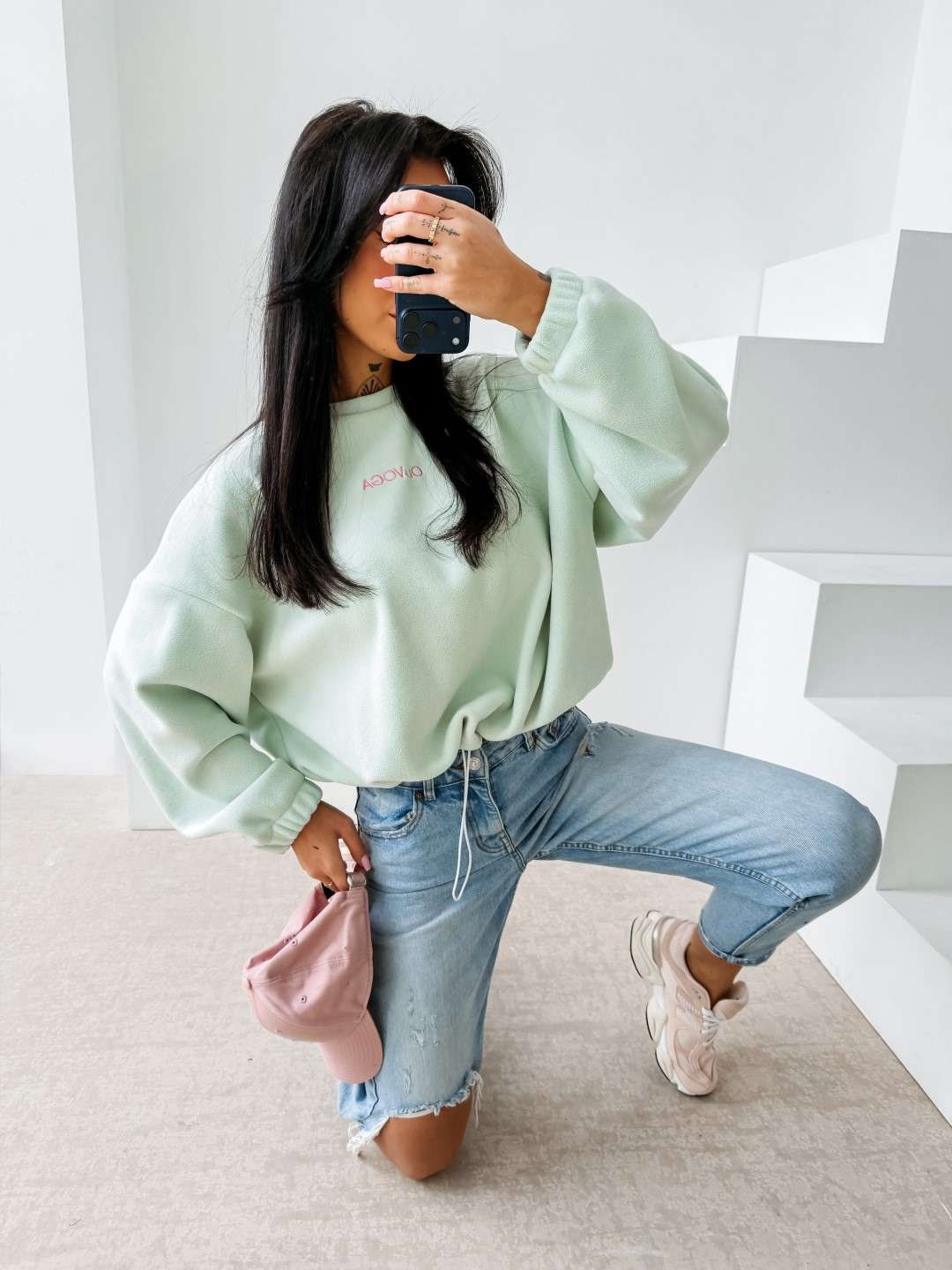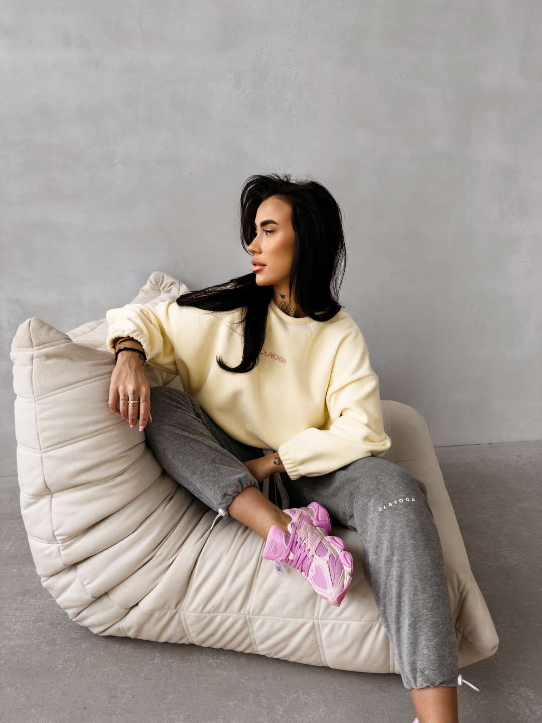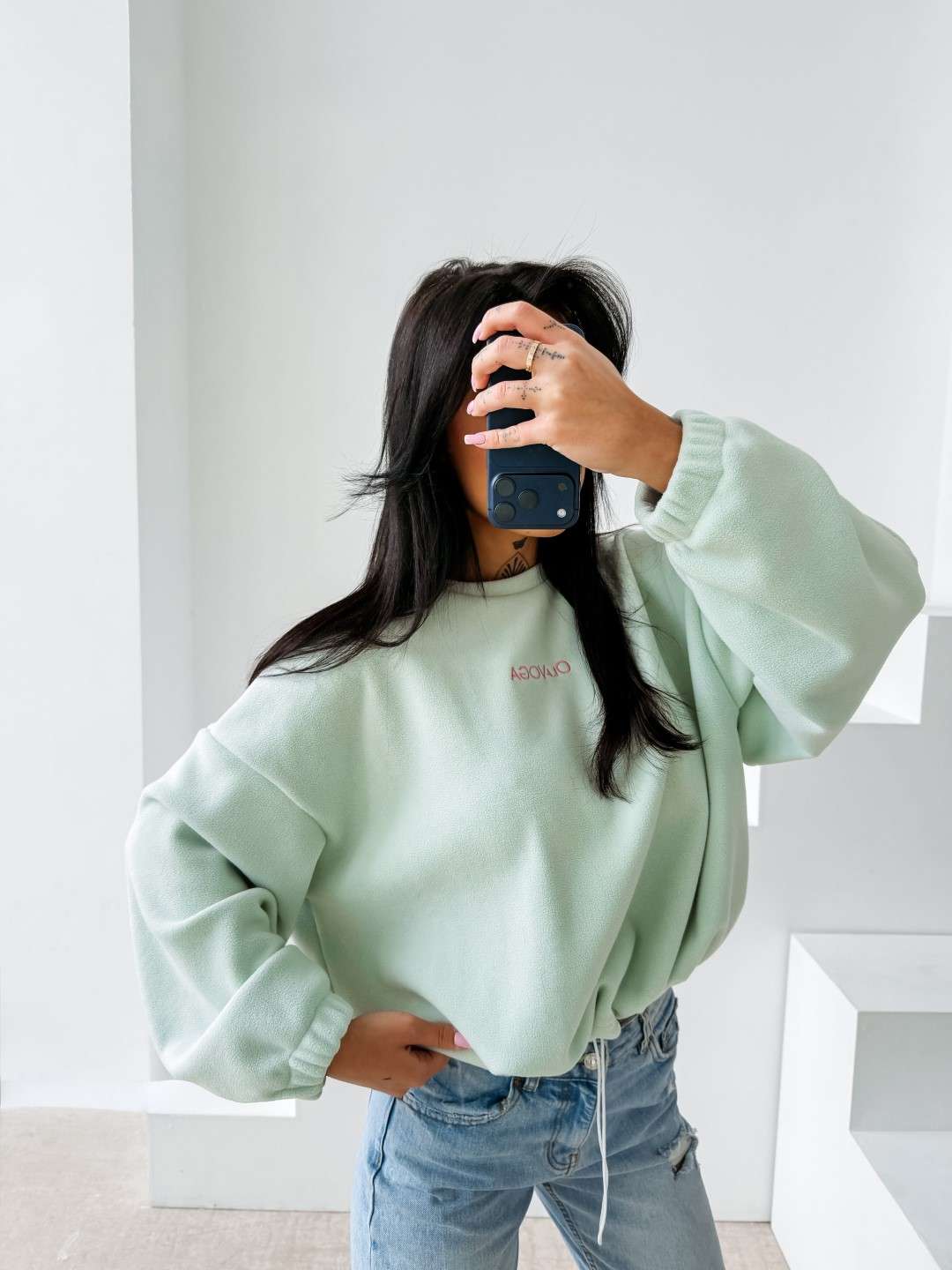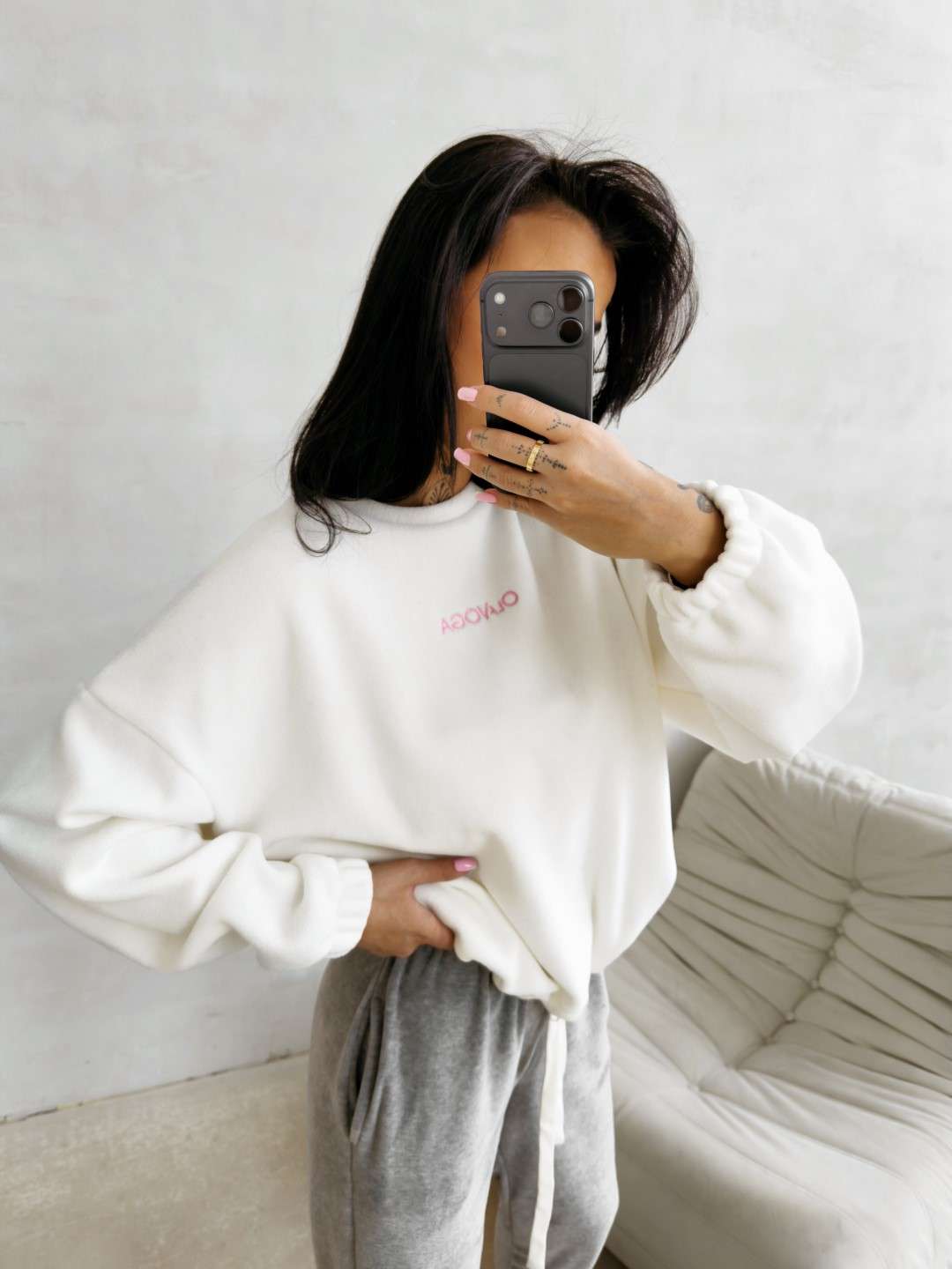 Bluza o luźnym, oversize’owym kroju wykonana z miękkiej, przyjemnej w dotyku dzianiny o delikatnej strukturze. Model z obniżoną linią ramion i szerokimi rękawami zakończonymi elastycznym ściągaczem. Dół regulowany subtelnym troczkiem. Na plecach efektowne logo marki OLAVOGA z hasłem „essence of comfort”. Z przodu minimalistyczny branding w postaci delikatnego haftu.