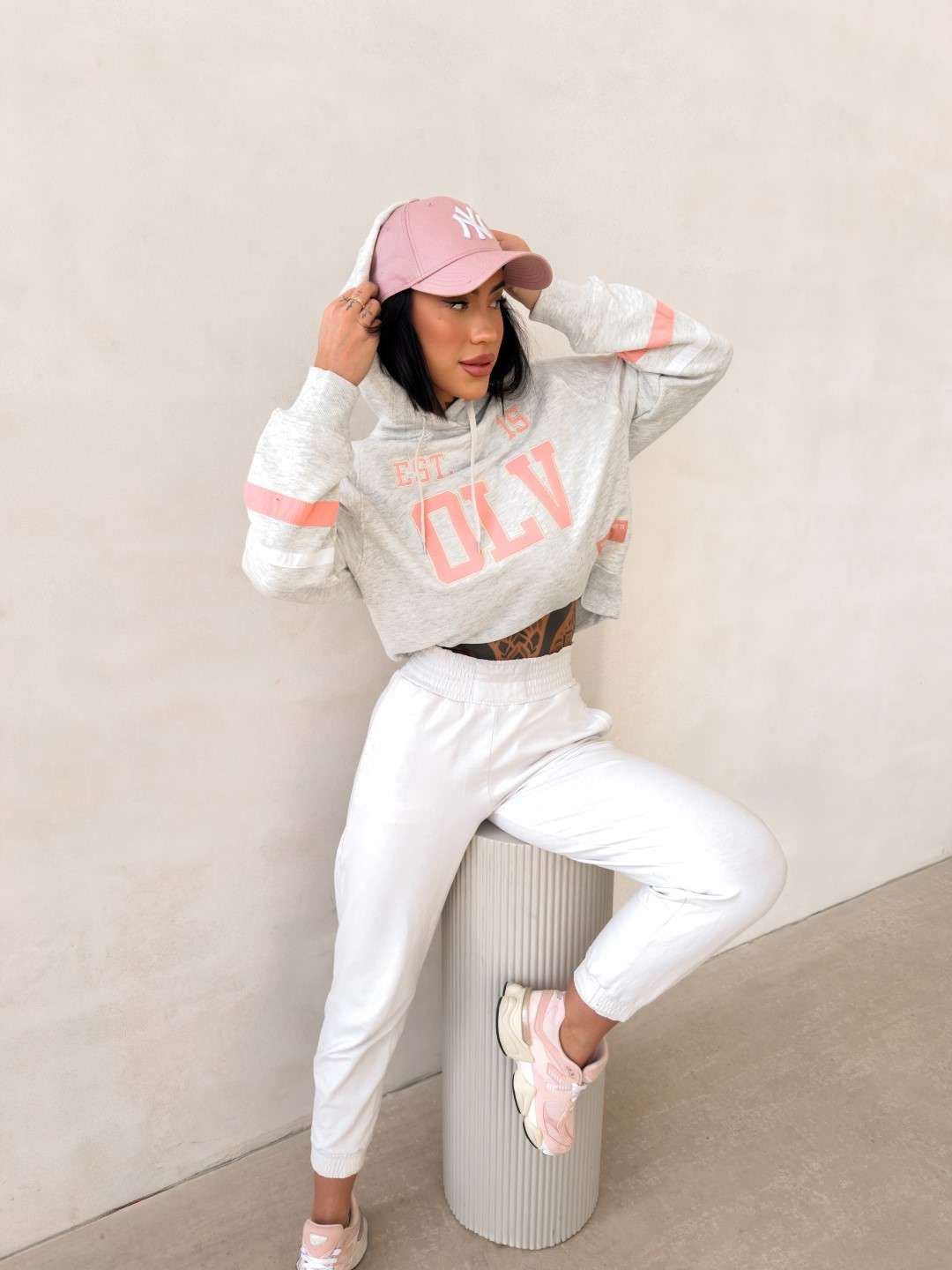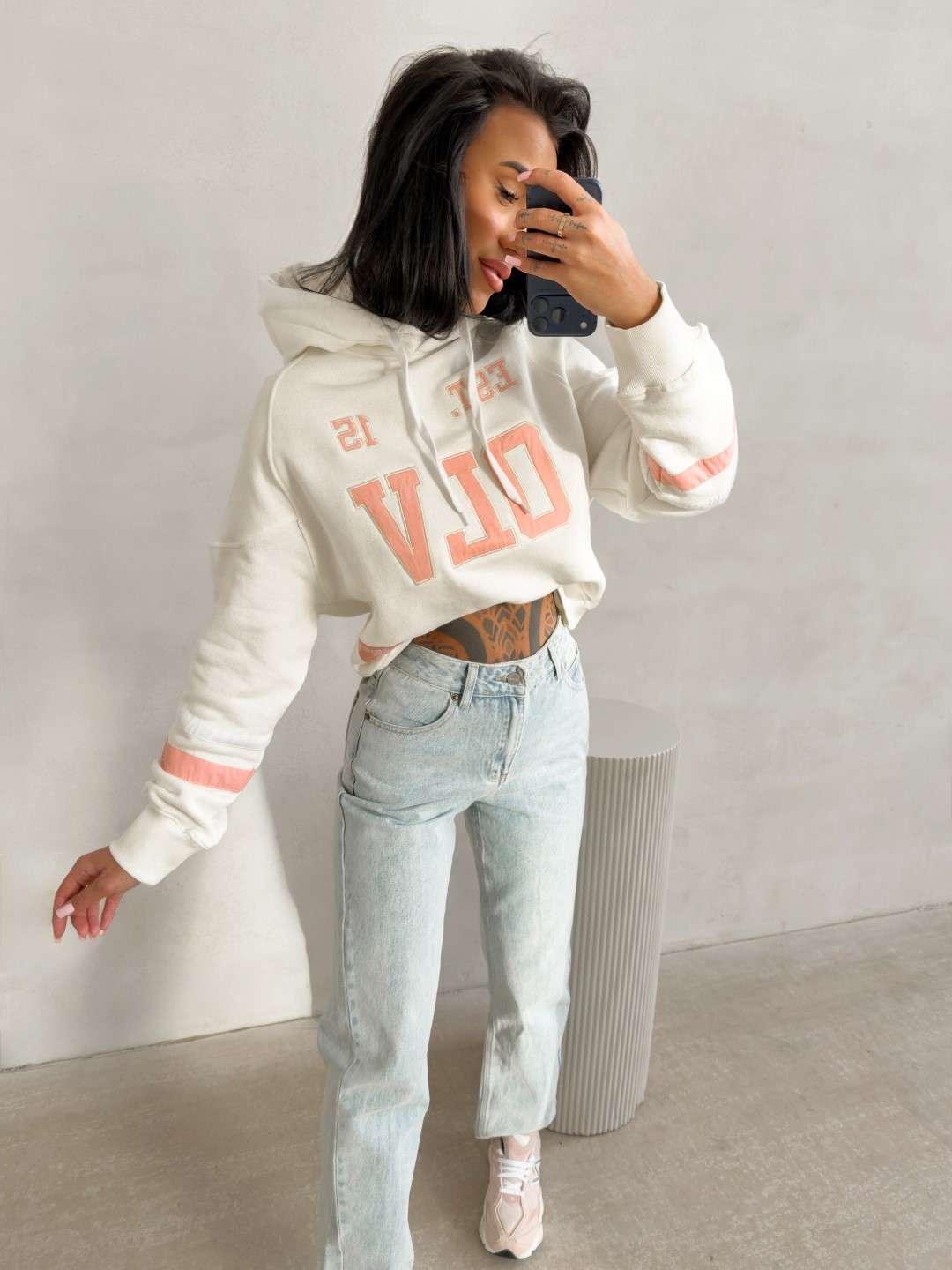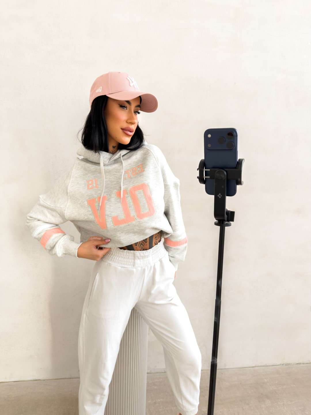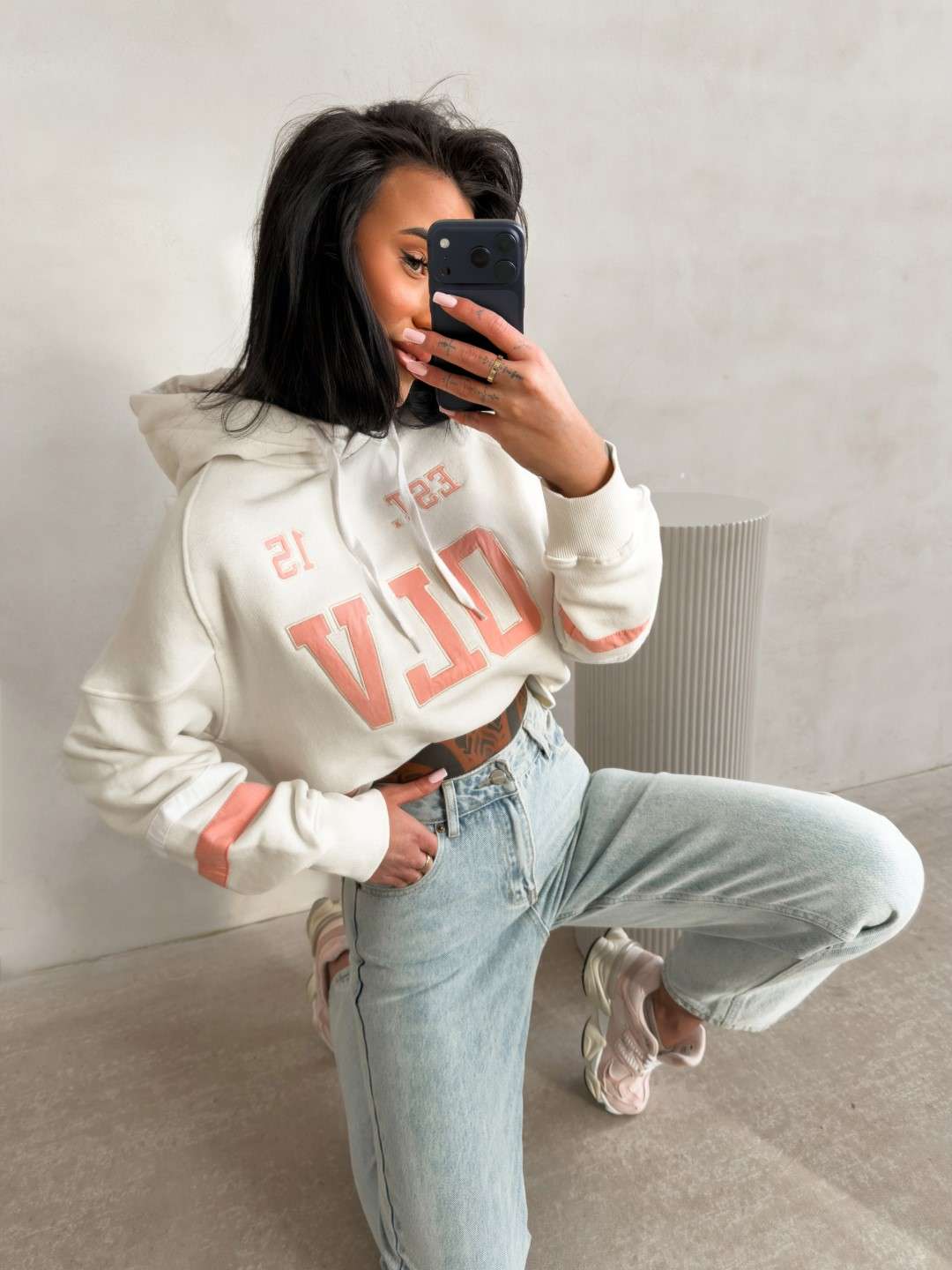 Klasyczna bluza z kapturem. Wykonana z wysokiej jakości materiału bawełnianego. Na brzegach prążkowane ściągacze. Na przodzie obszerna naszywka z OLV oraz EST. 2015, jak i również logowana, minimalistyczna naszywka. Na rękawach poziome lampasy. Kaptur regulowany poprzez sznurek. Produkt posiada przeszycia. Na tyle obszerne logo brandu.
