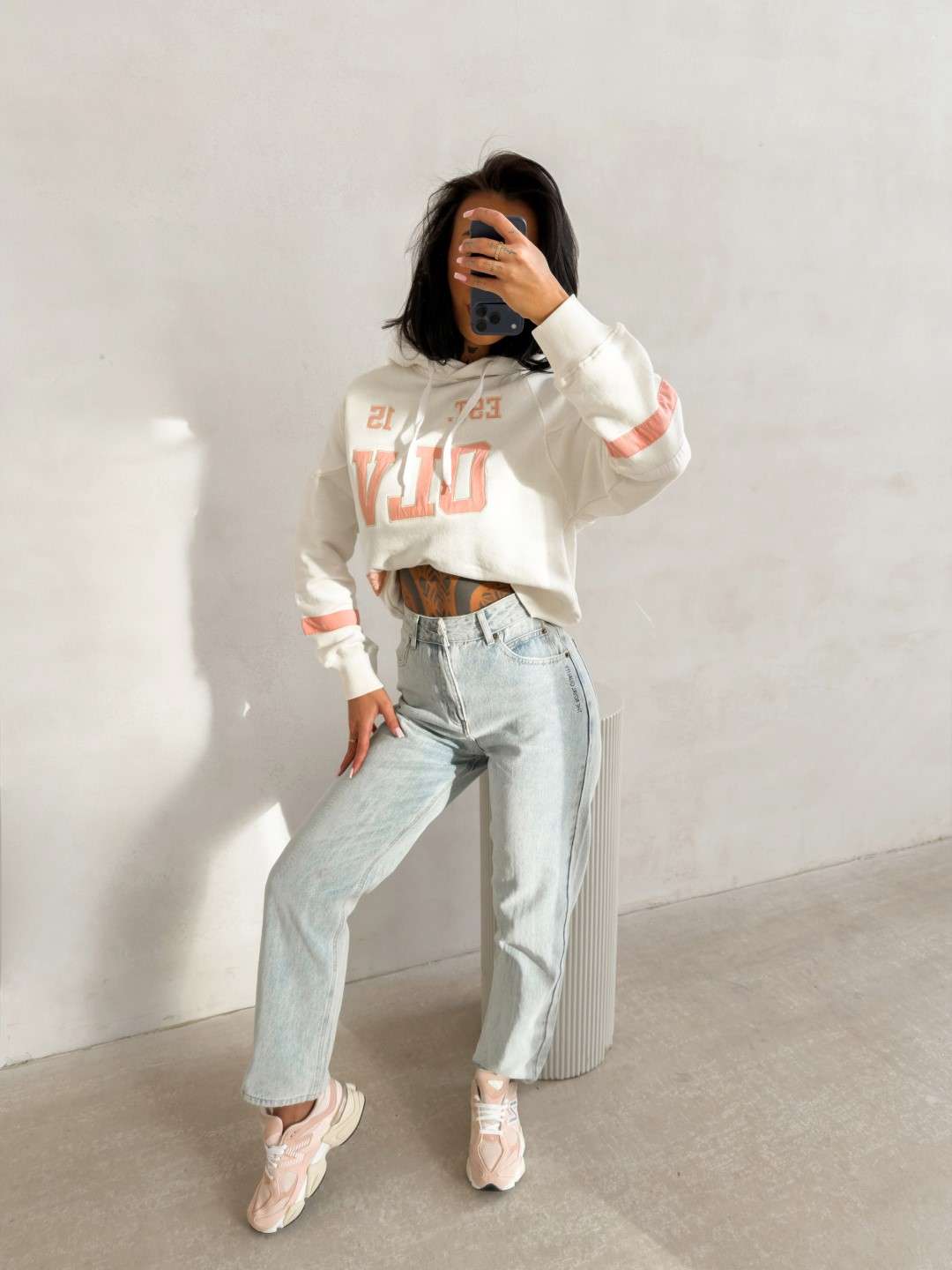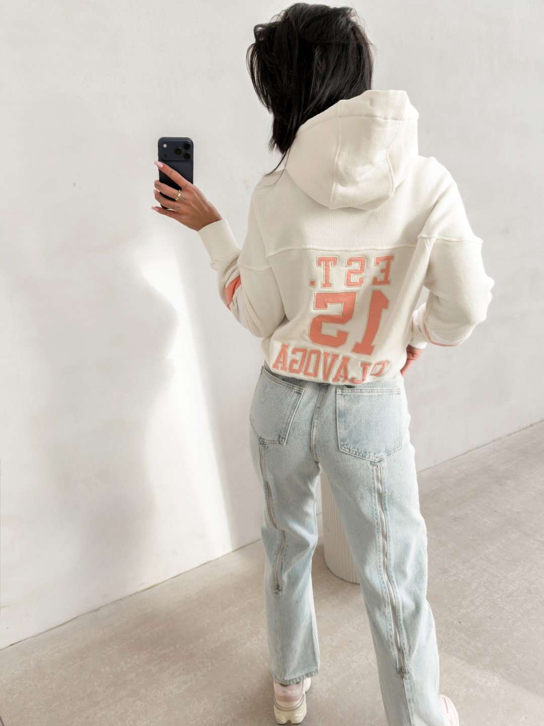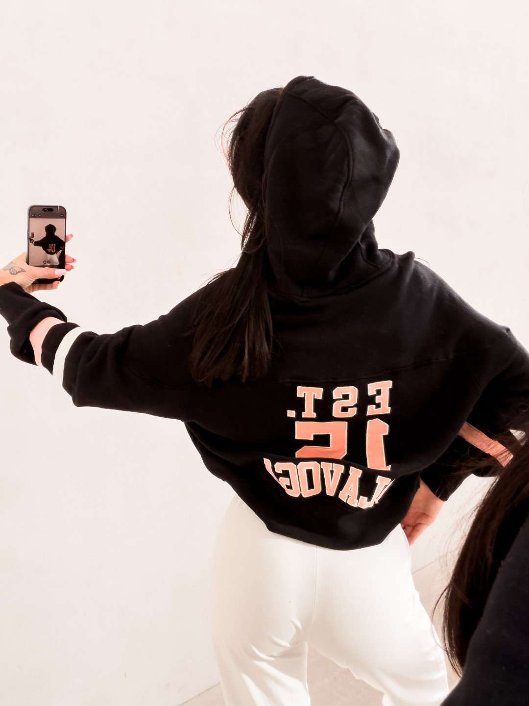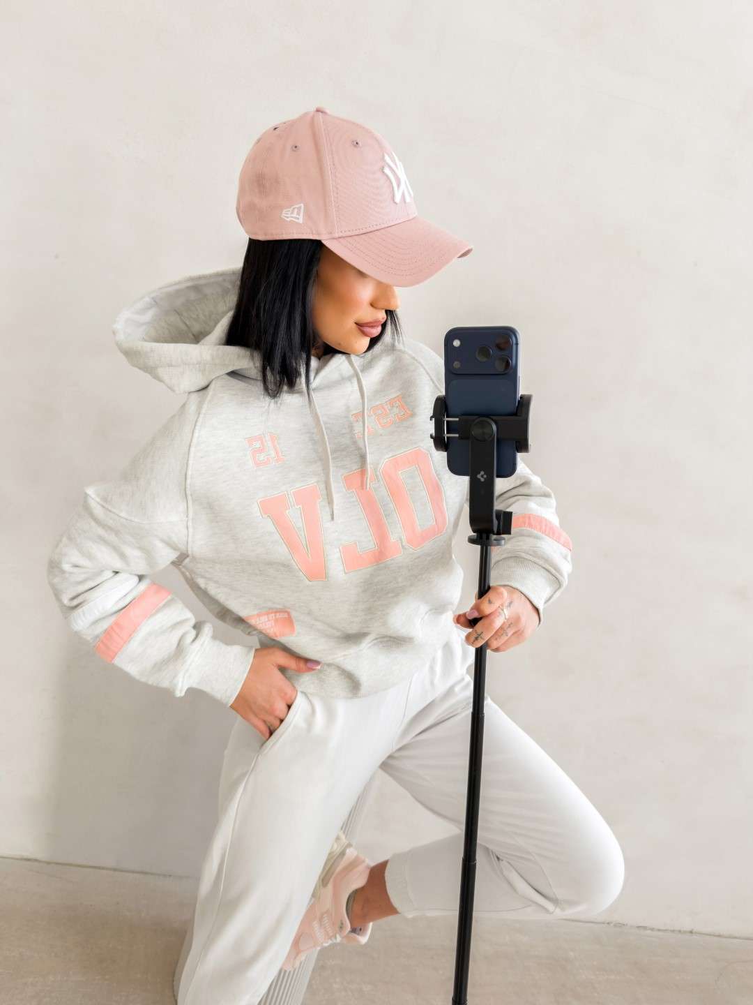Klasyczna bluza z kapturem. Wykonana z wysokiej jakości materiału bawełnianego. Na brzegach prążkowane ściągacze. Na przodzie obszerna naszywka z OLV oraz EST. 2015, jak i również logowana, minimalistyczna naszywka. Na rękawach poziome lampasy. Kaptur regulowany poprzez sznurek. Produkt posiada przeszycia. Na tyle obszerne logo brandu.
