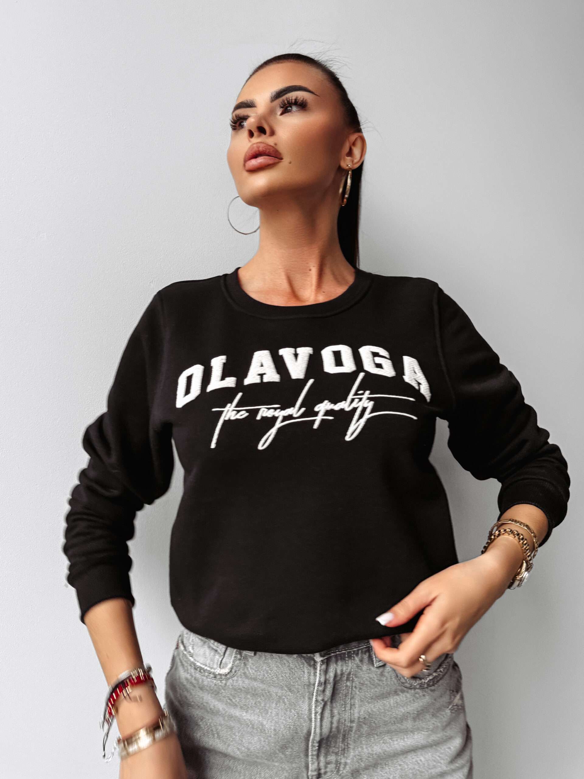 Delikatnie oversiz’owa bluza o krótszym kroju. Wykonana z wysokiej jakości bawełnianego materiału. Na brzegach prążkowane ściągacze. Na przodzie logo marki OLAVOGA oraz minimalistyczny napis w ciekawej grafice THE ROYAL QUALITY.