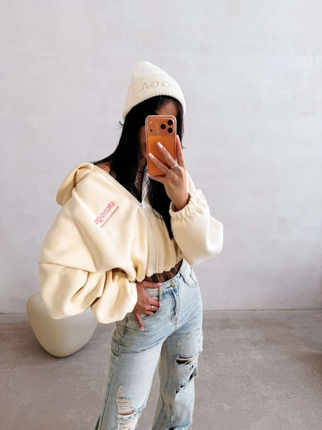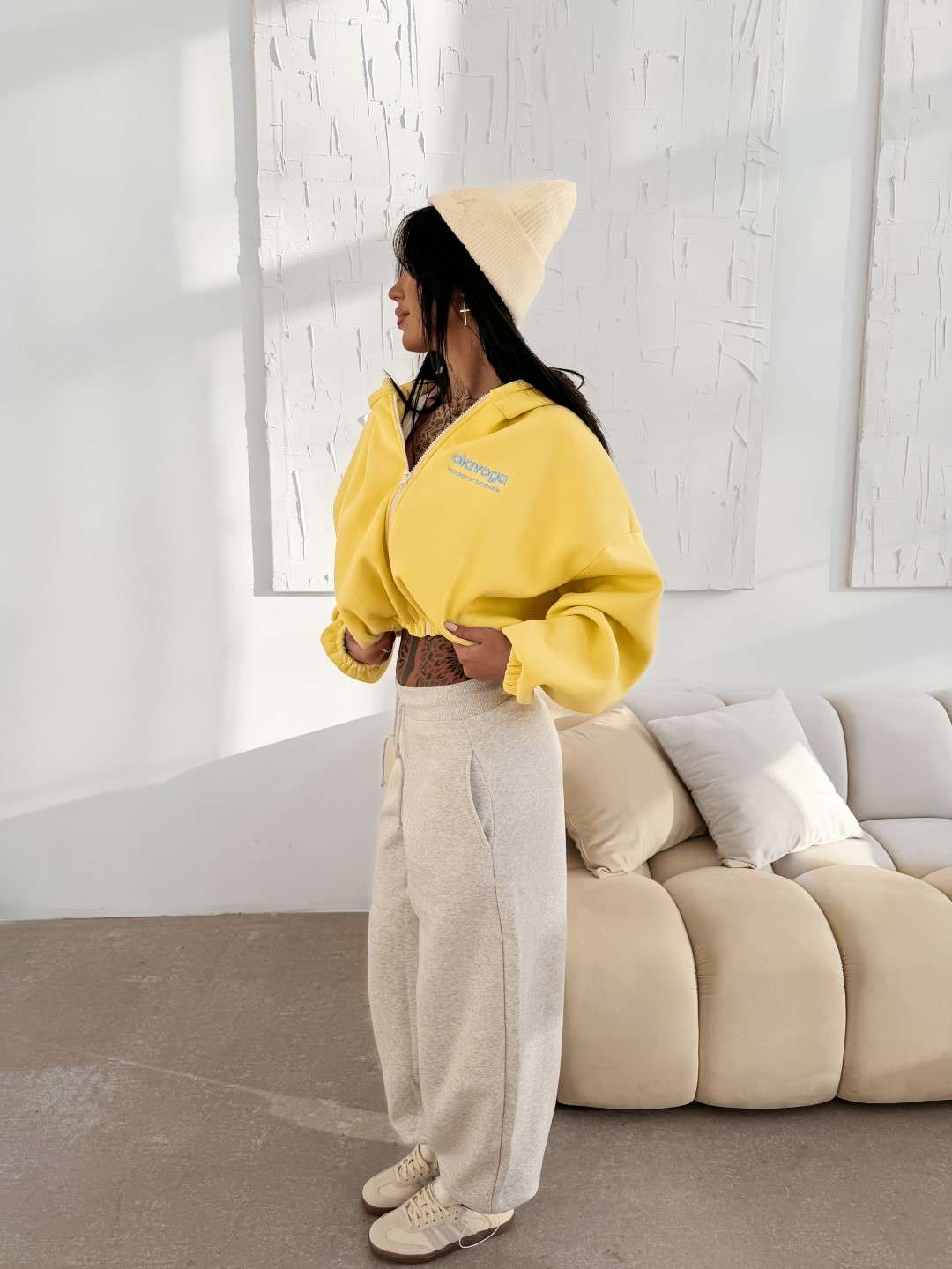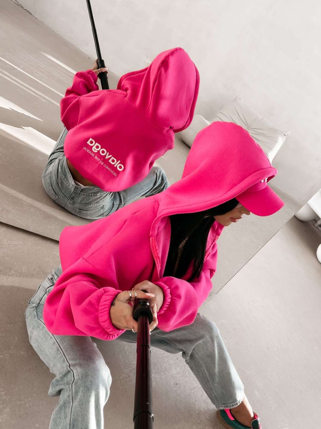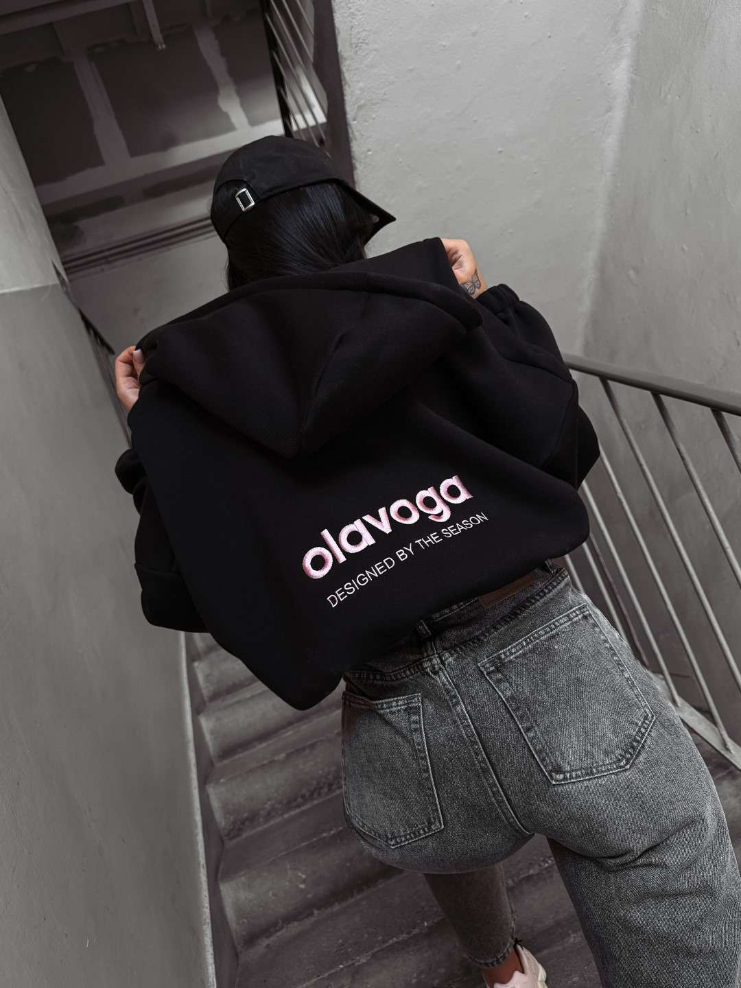 Oversize’owa, rozpinana bluza z kapturem o krótszym kroju. Wykonana z wysokiej jakości bawełny. Elastyczne ściągacze na brzegach. Przód zdobi minimalistyczny haft z logo OLAVOGA, natomiast tył wyróżnia obszerny haft brandu.
