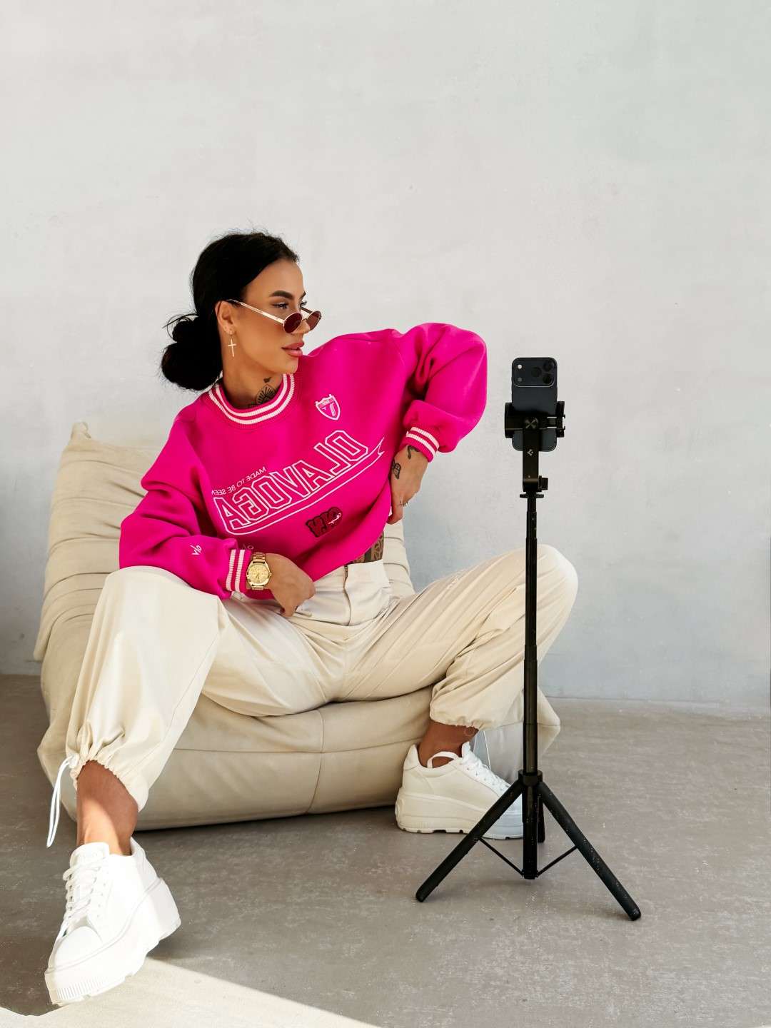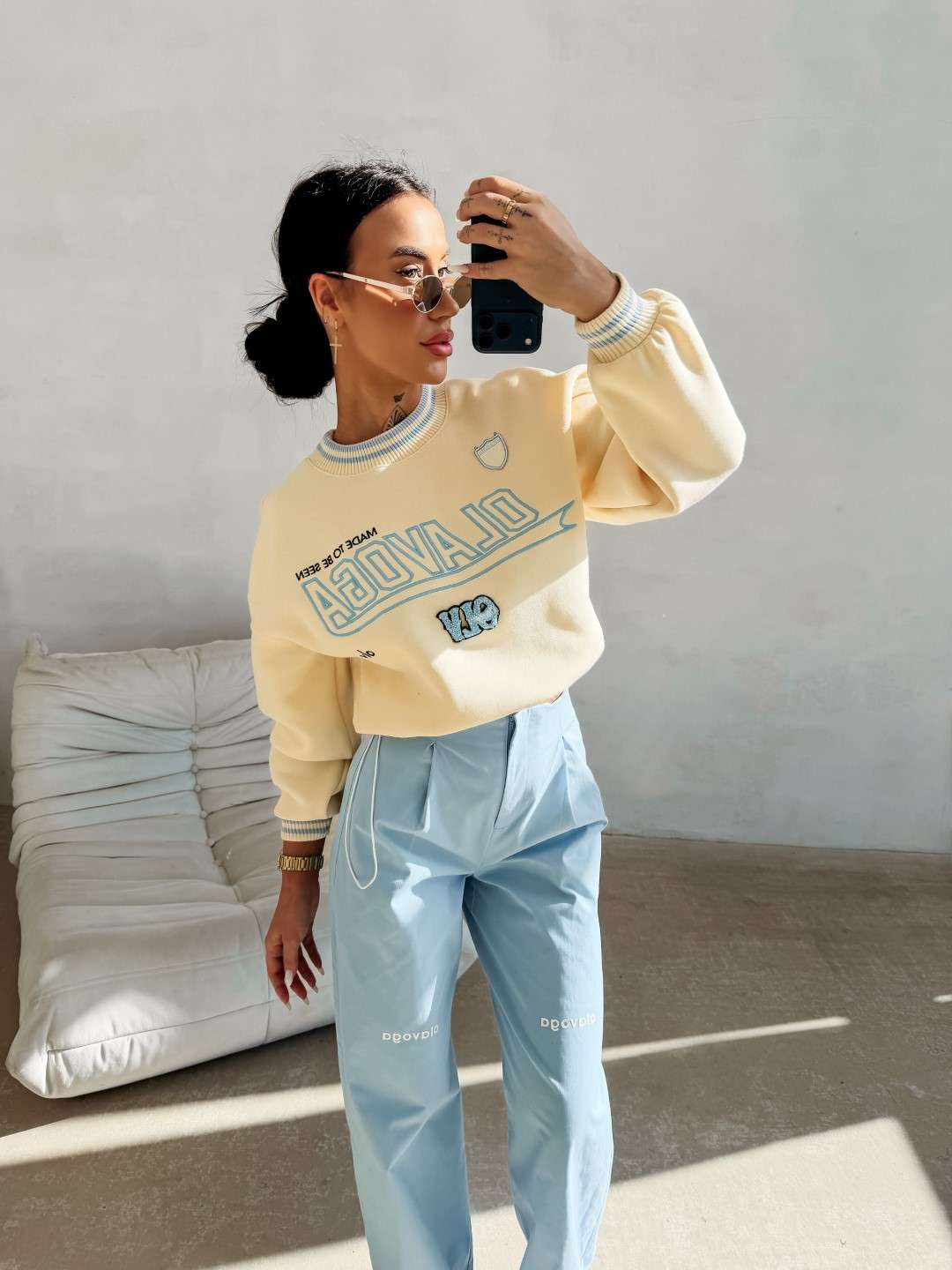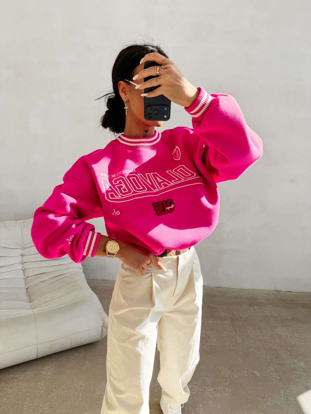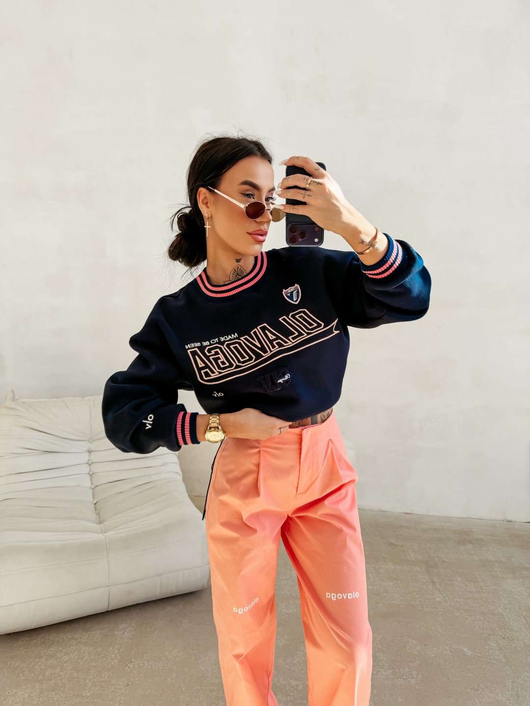 Bluza o swobodnym kroju z długim rękawem i klasycznym, okrągłym dekoltem. Model wykonany z miękkiej tkaniny. Dekolt, rękawy oraz dół bluzy wykończone ściągaczem z kontrastowymi pasami. Z przodu duże logowanie OLAVOGA z dodatkowymi detalami. Na rękawie subtelne logowanie OLV.