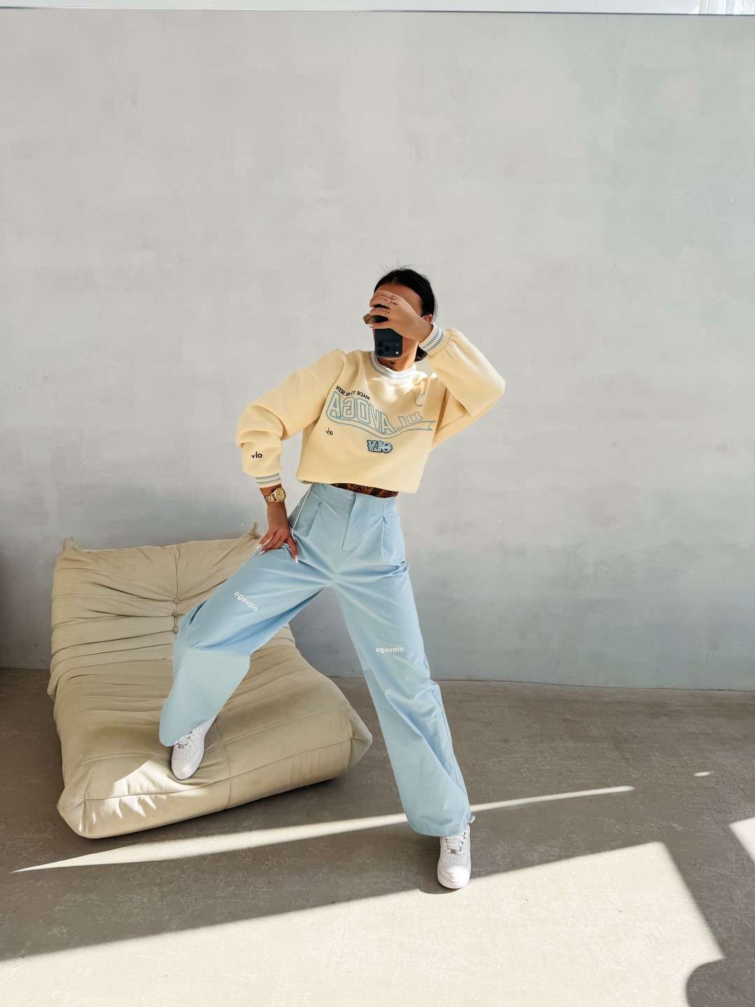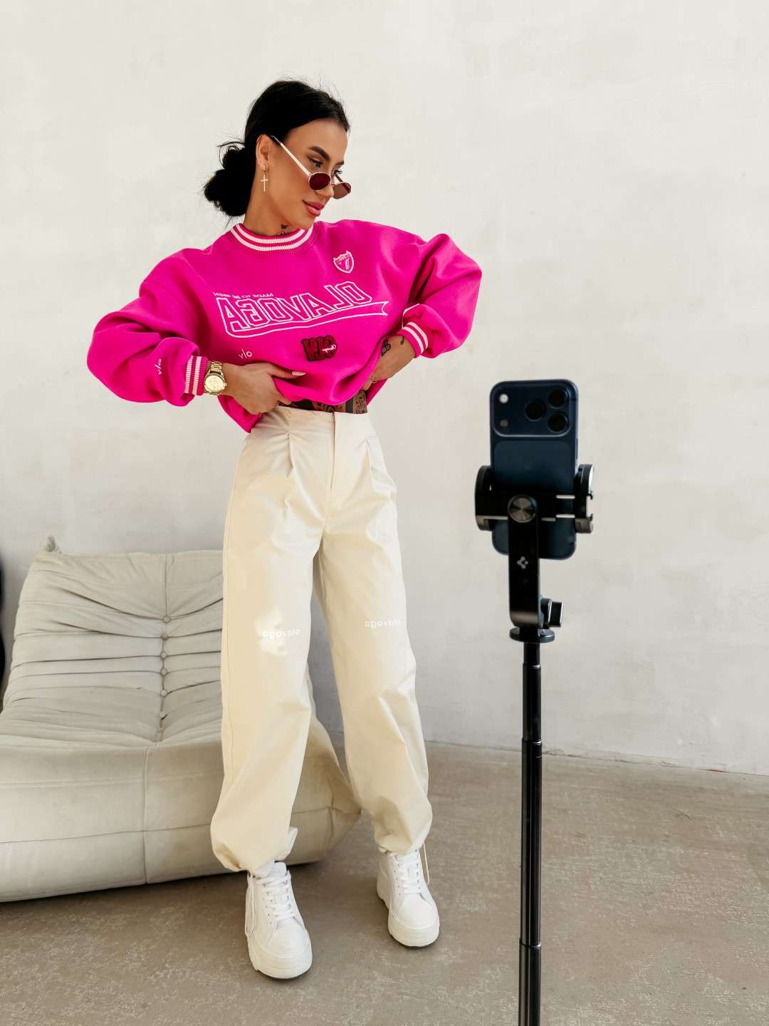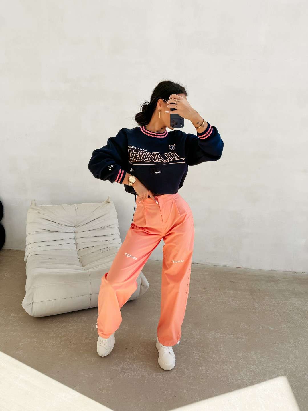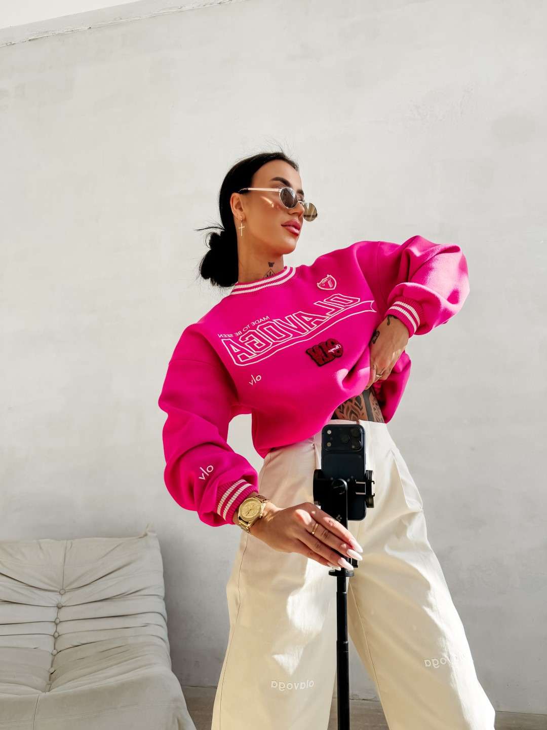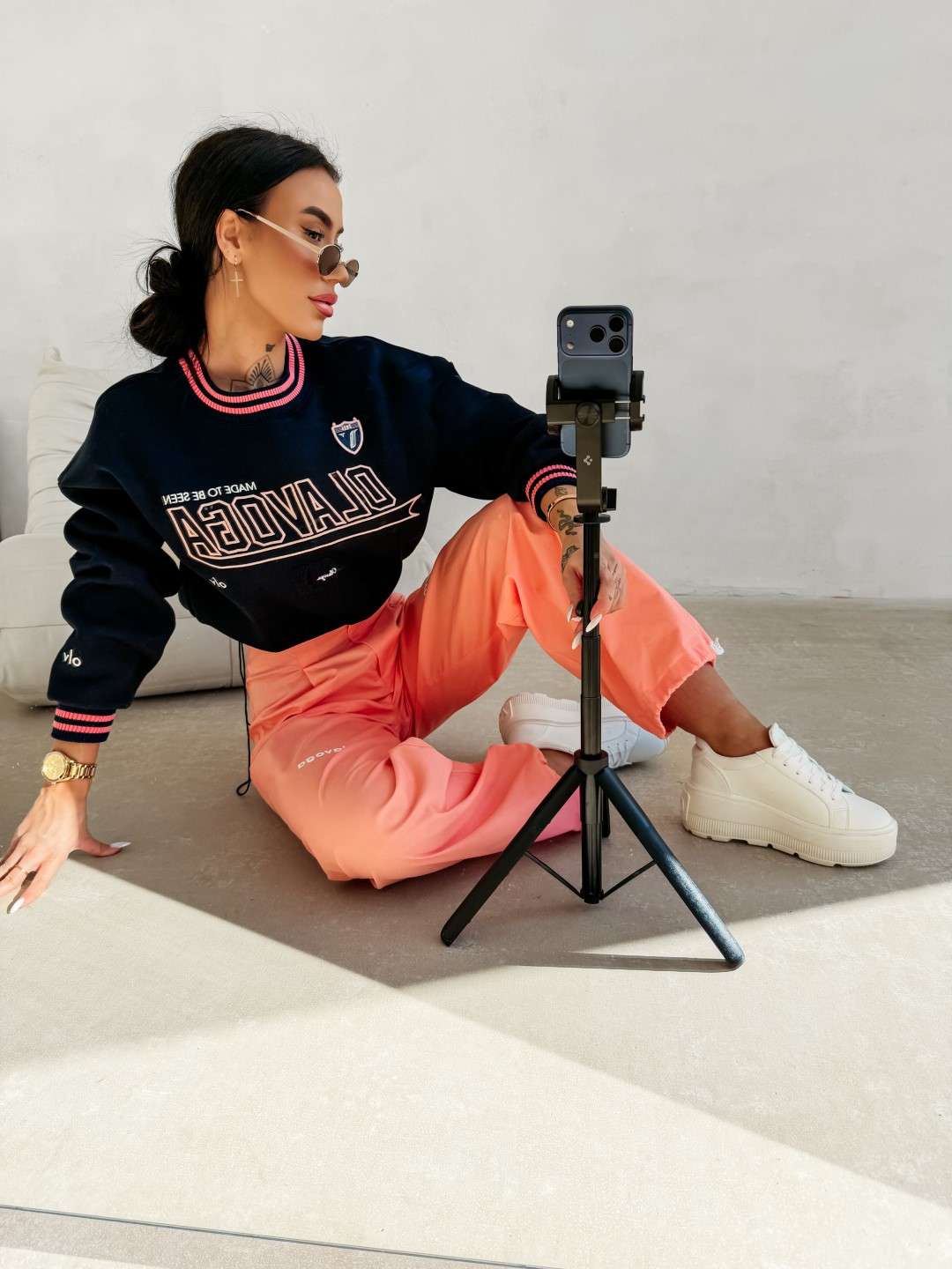 Bluza o swobodnym kroju z długim rękawem i klasycznym, okrągłym dekoltem. Model wykonany z miękkiej tkaniny. Dekolt, rękawy oraz dół bluzy wykończone ściągaczem z kontrastowymi pasami. Z przodu duże logowanie OLAVOGA z dodatkowymi detalami. Na rękawie subtelne logowanie OLV.