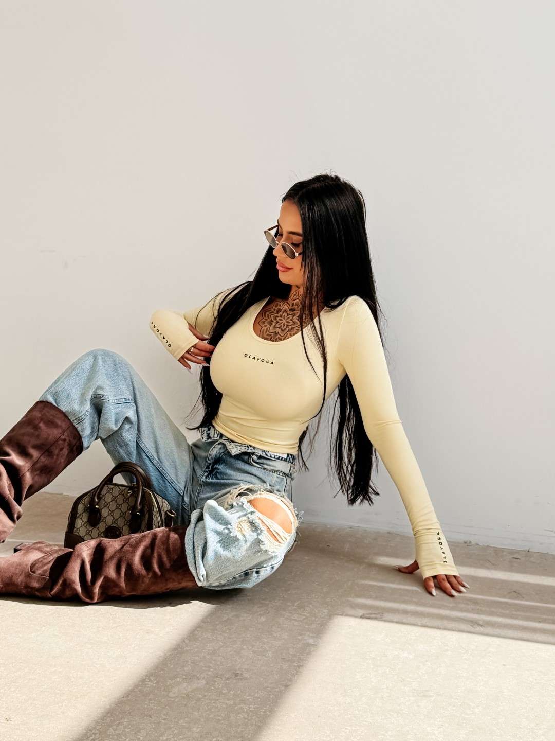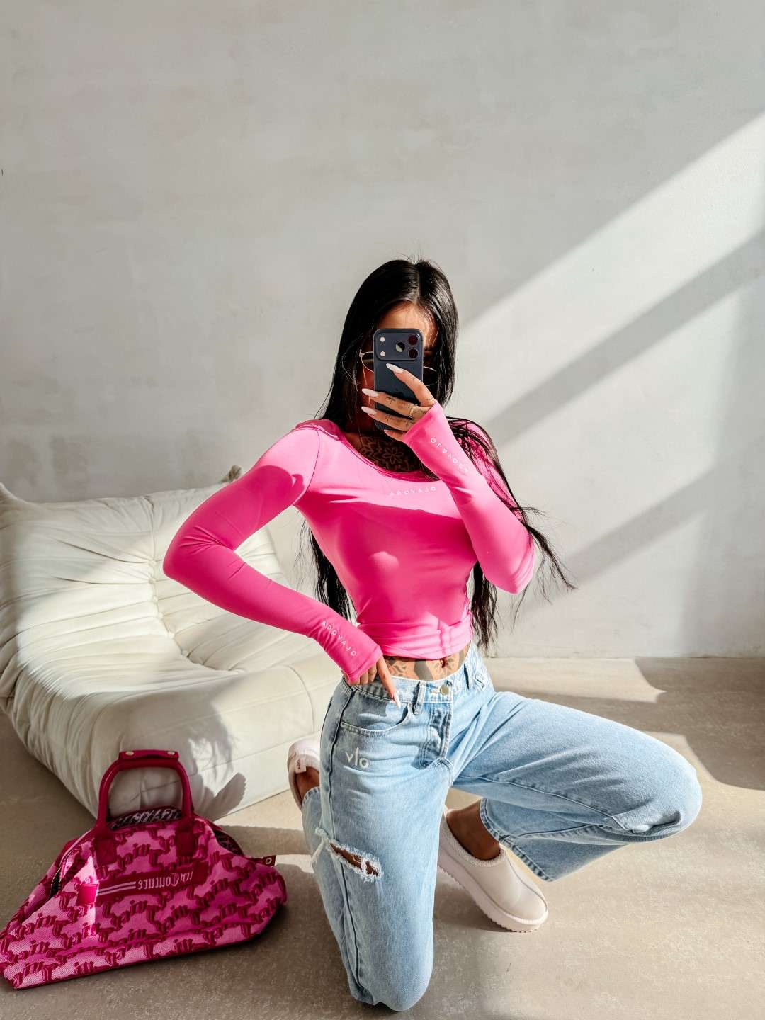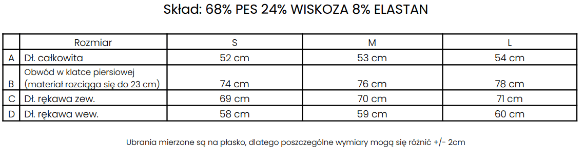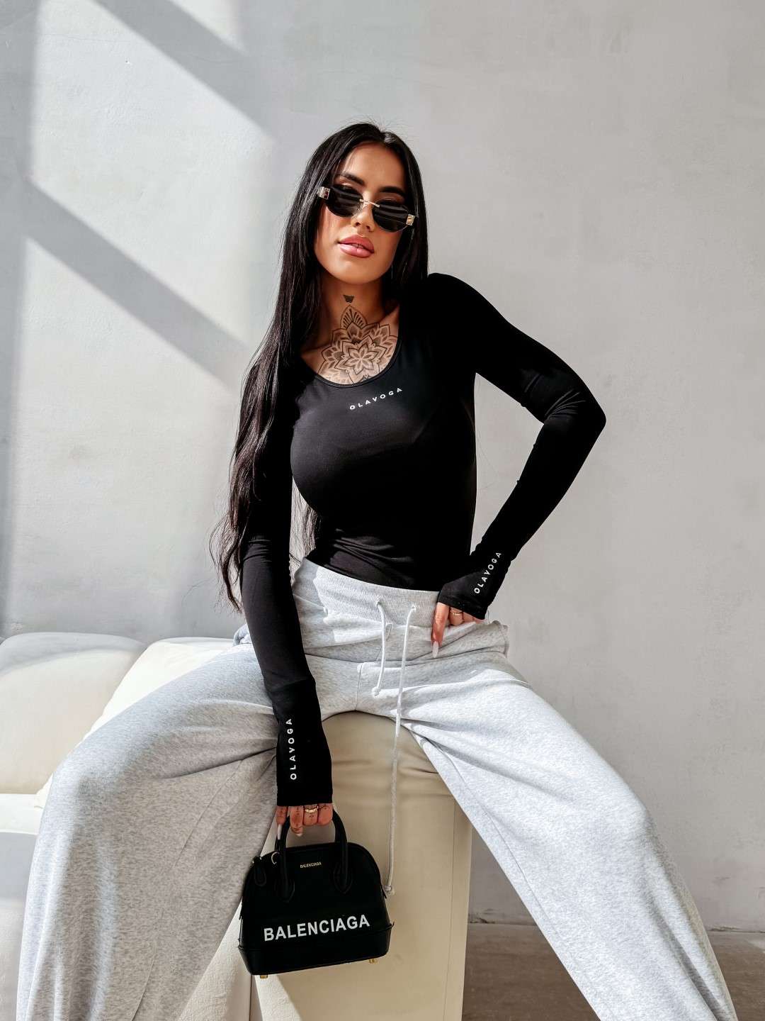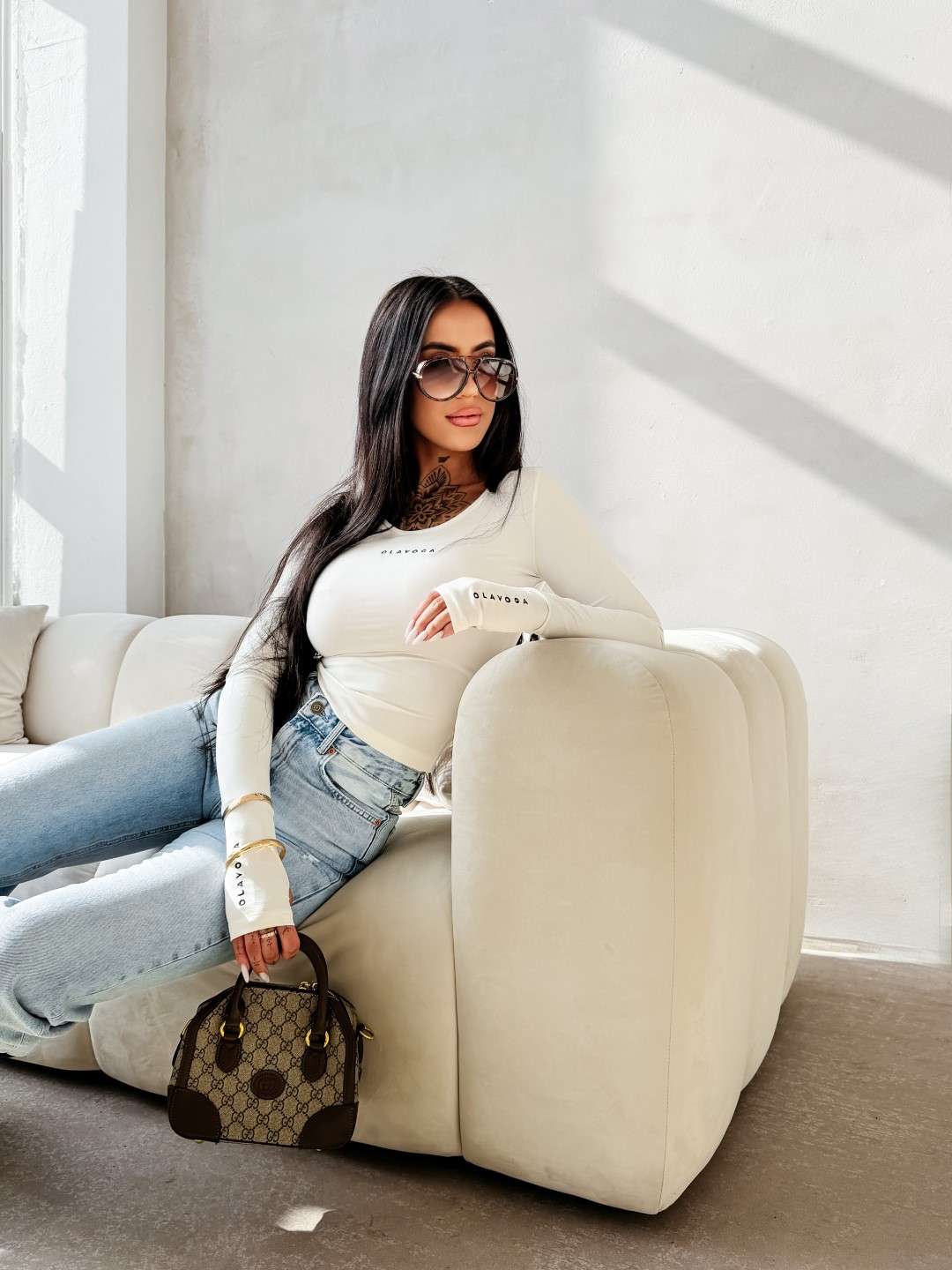 Dopasowana bluzka z długim rękawem. Głęboki okrągły dekolt. Rękawy zakończone otworem na palec. Subtelne logowanie z przodu oraz na rękawach.