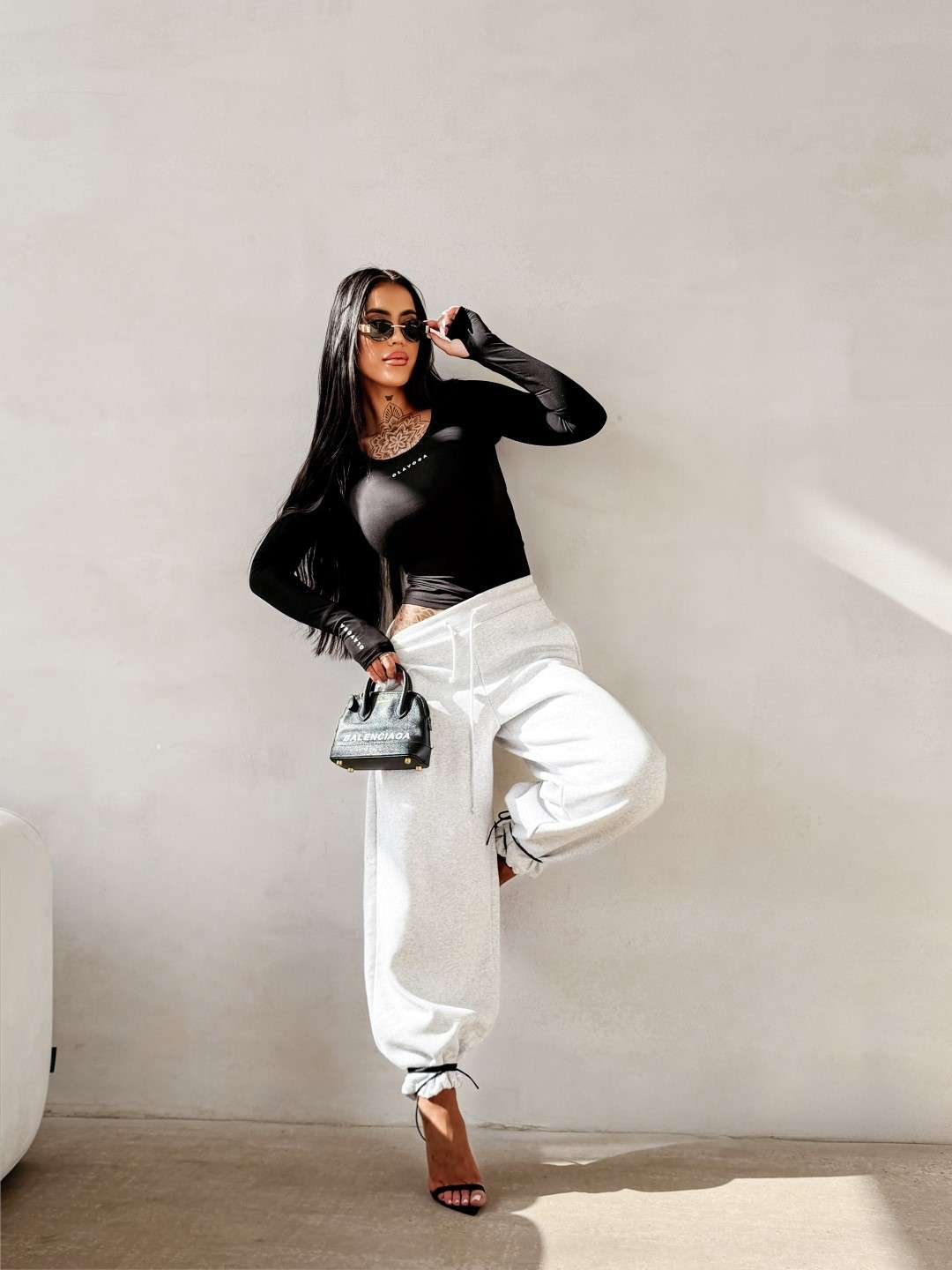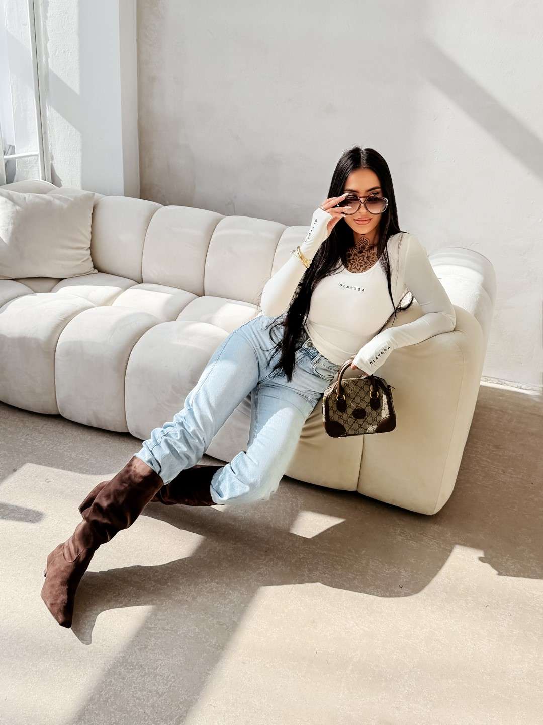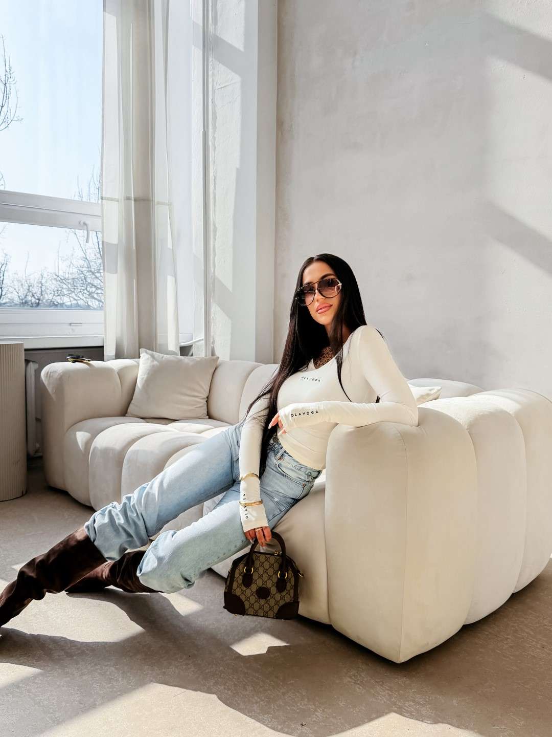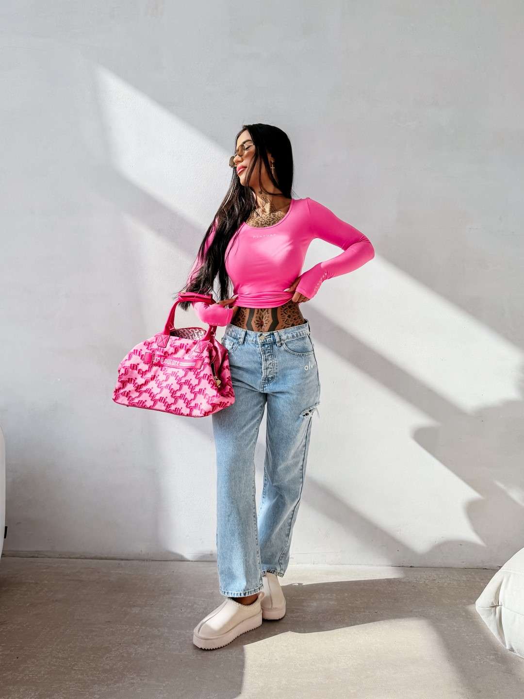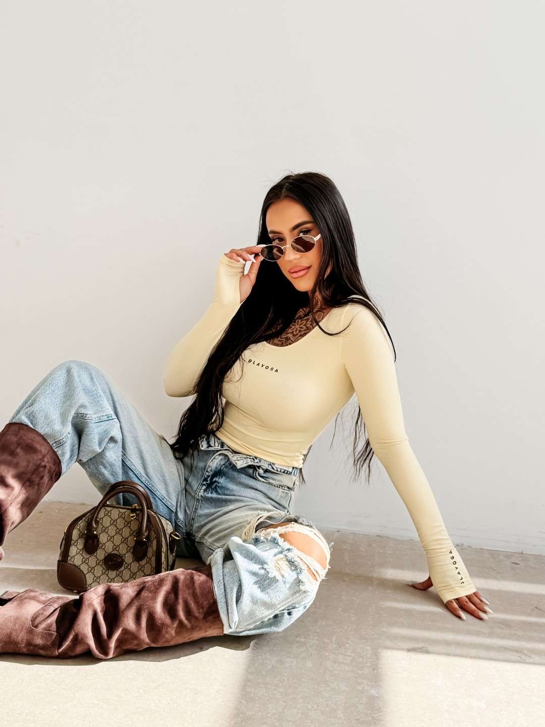 Dopasowana bluzka z długim rękawem. Głęboki okrągły dekolt. Rękawy zakończone otworem na palec. Subtelne logowanie z przodu oraz na rękawach.