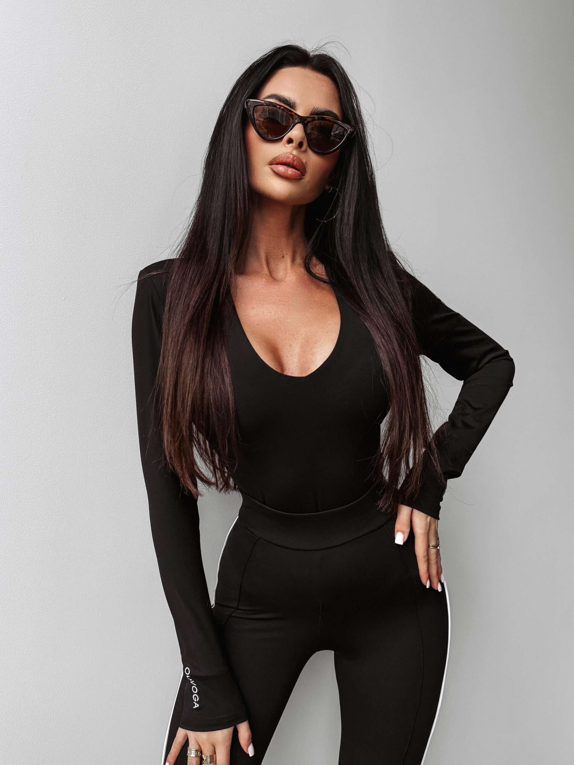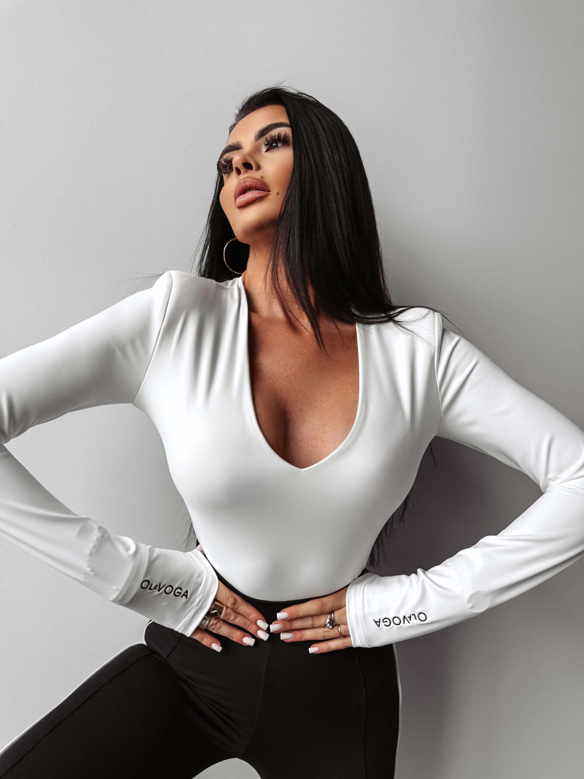 Klasyczne body damskie z długim rękawem z obszernym dekoltem. Wykonane z wysokiej jakości elastycznego materiału. Ramiona posiadają poduszki, dodające klasy. Na rękawachminimalistyczny haft z logo marki OLAVOGA.
