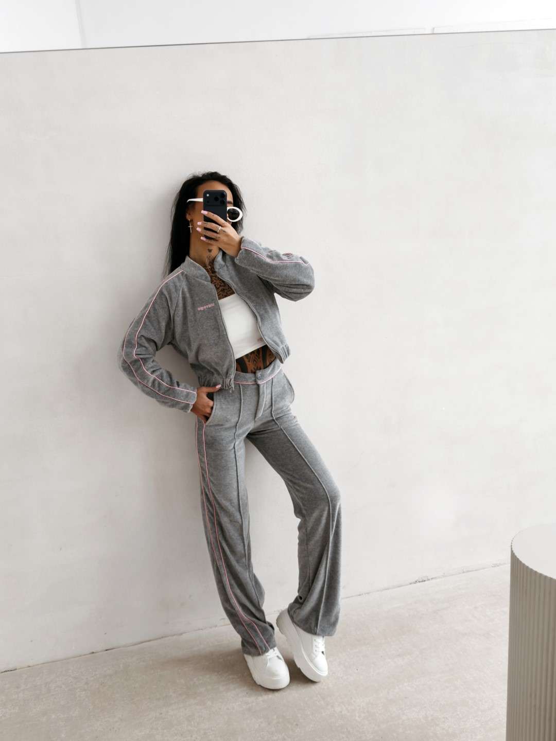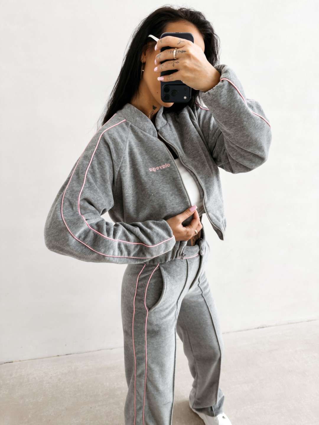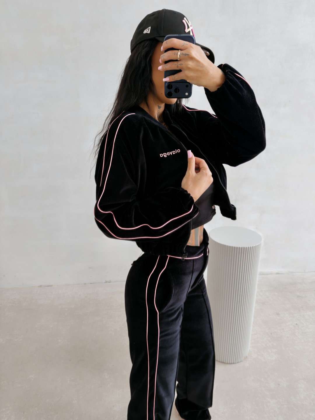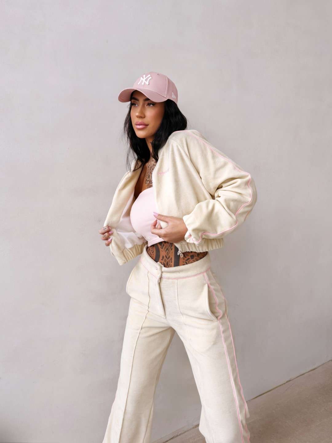 Krótka bomberka wykonana z miękkiego, przyjemnego w dotyku materiału typu velvet. Model zapinany na suwak, z długim rękawem i elastycznym wykończeniem przy mankietach oraz u dołu. Wzdłuż rękawów kontrastowe lampasy. Na przodzie subtelny haft z logo marki OLAVOGA. Tworzy idealny komplet z topem LEYA oraz spodniami VELIN.