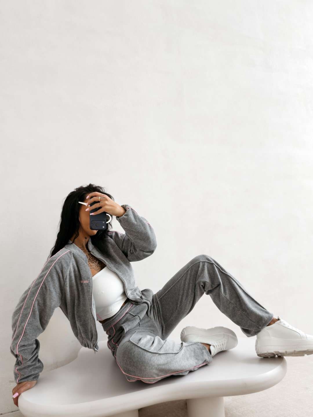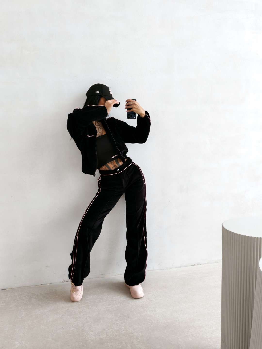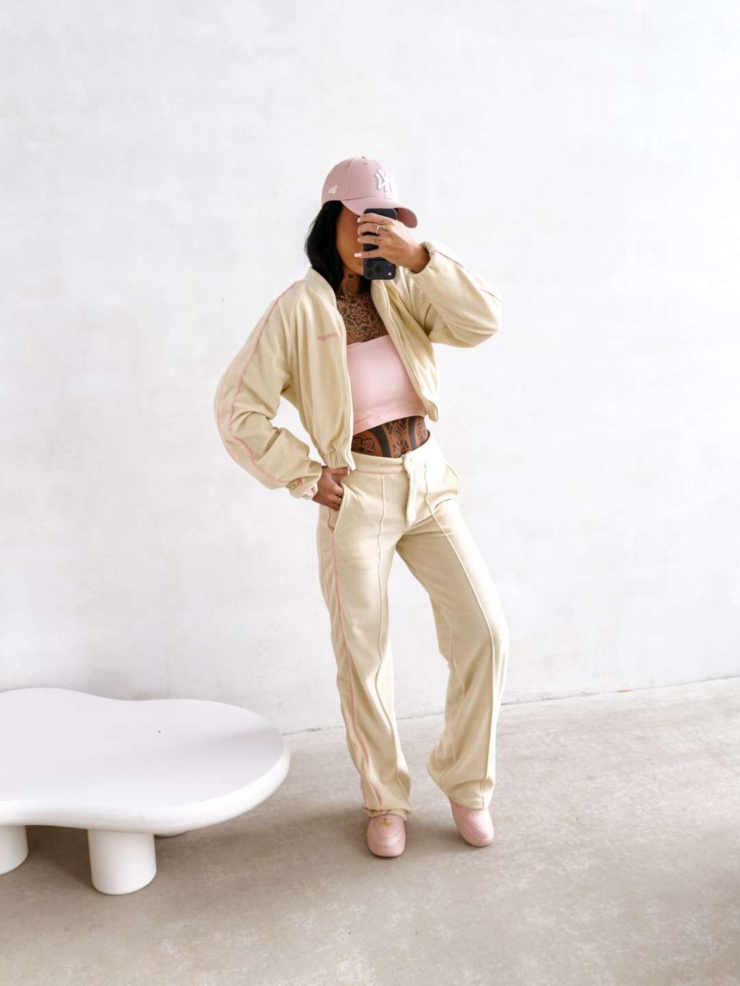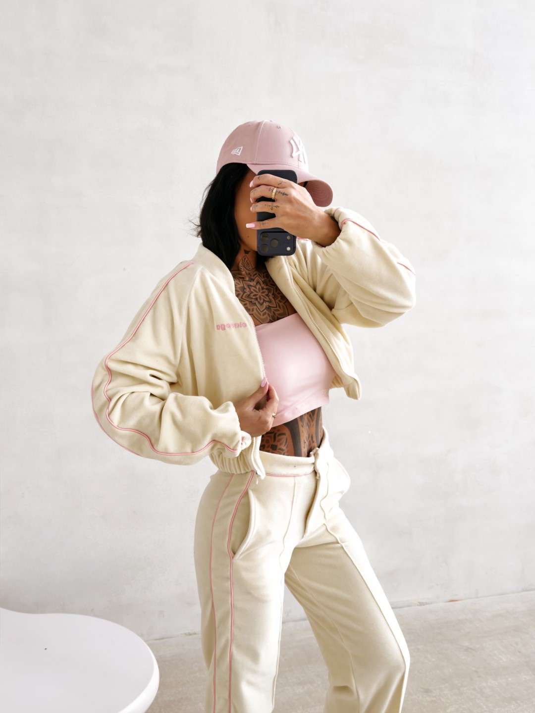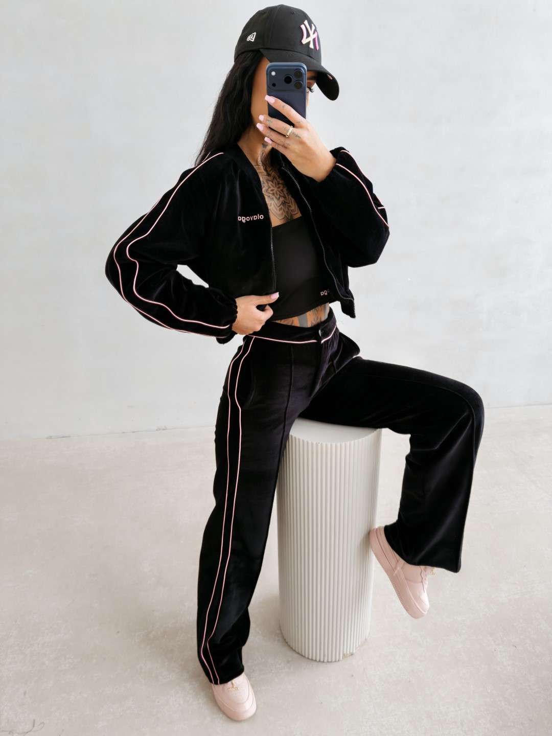Krótka bomberka wykonana z miękkiego, przyjemnego w dotyku materiału typu velvet. Model zapinany na suwak, z długim rękawem i elastycznym wykończeniem przy mankietach oraz u dołu. Wzdłuż rękawów kontrastowe lampasy. Na przodzie subtelny haft z logo marki OLAVOGA. Tworzy idealny komplet z topem LEYA oraz spodniami VELIN.