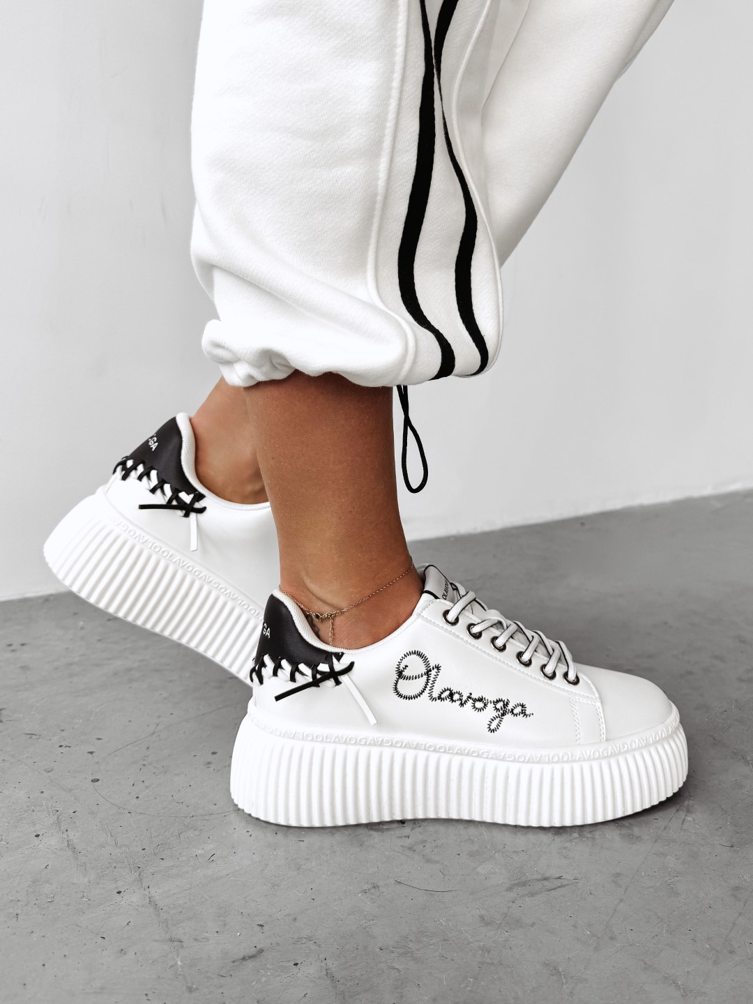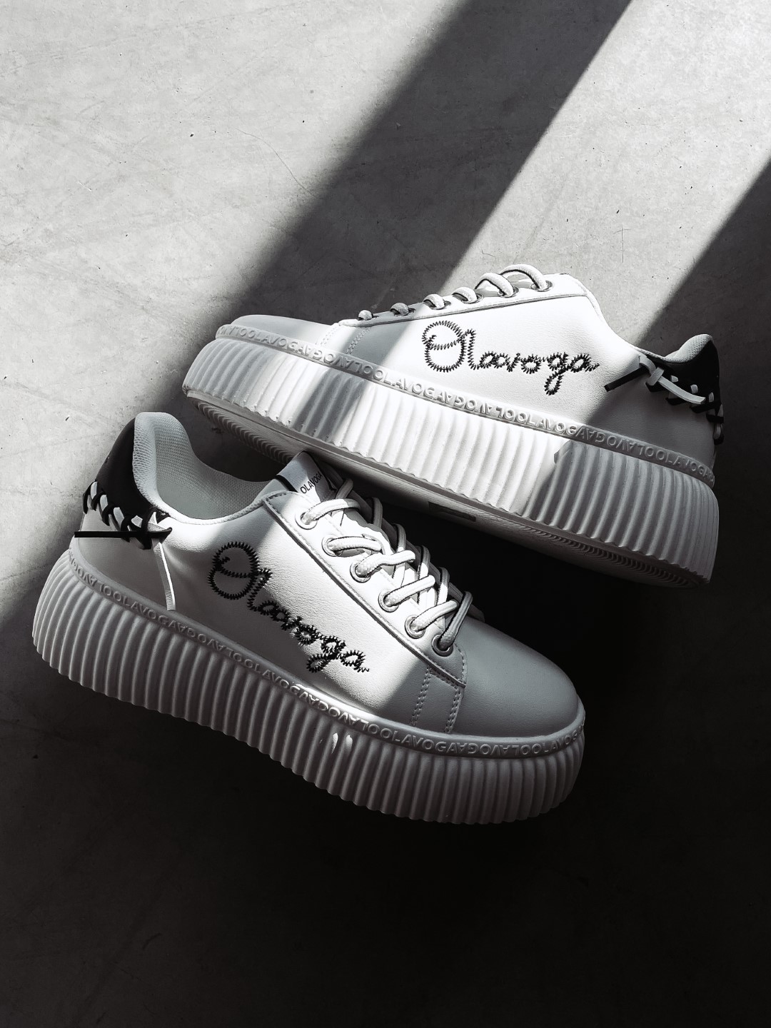 Idealne na wiosnę buty sportowe. Dostępne w jednym odcieniu kolorystycznym. Kultowy model sneakersów na podwyższonej platformie. Po boku logo marki OLAVOGA w ciekawym princie. Na języku logowana metka. Tyl posiada ciekawe zdobienie – efekt szycia – oraz logo brandu.