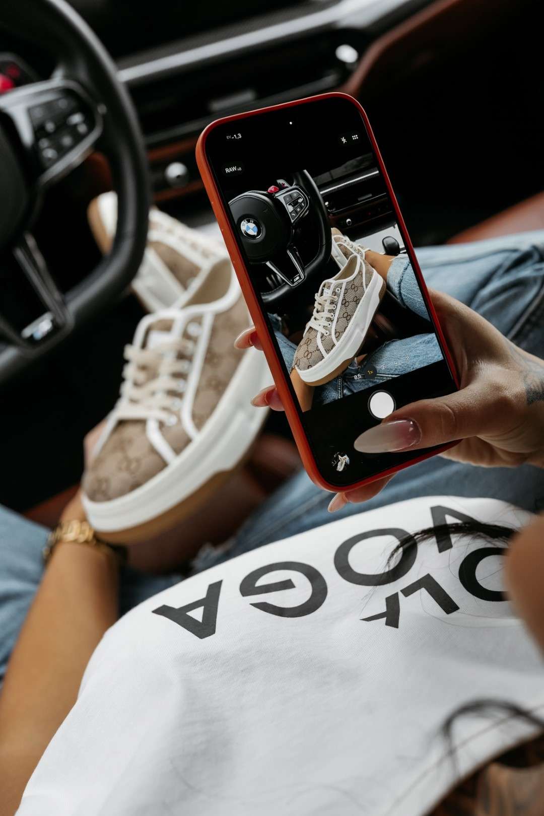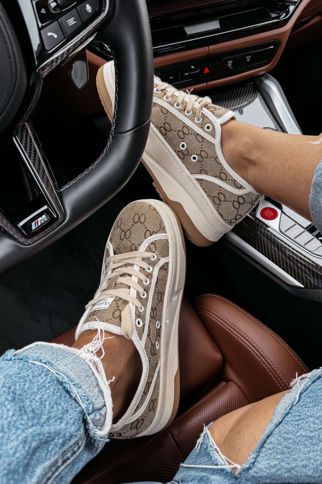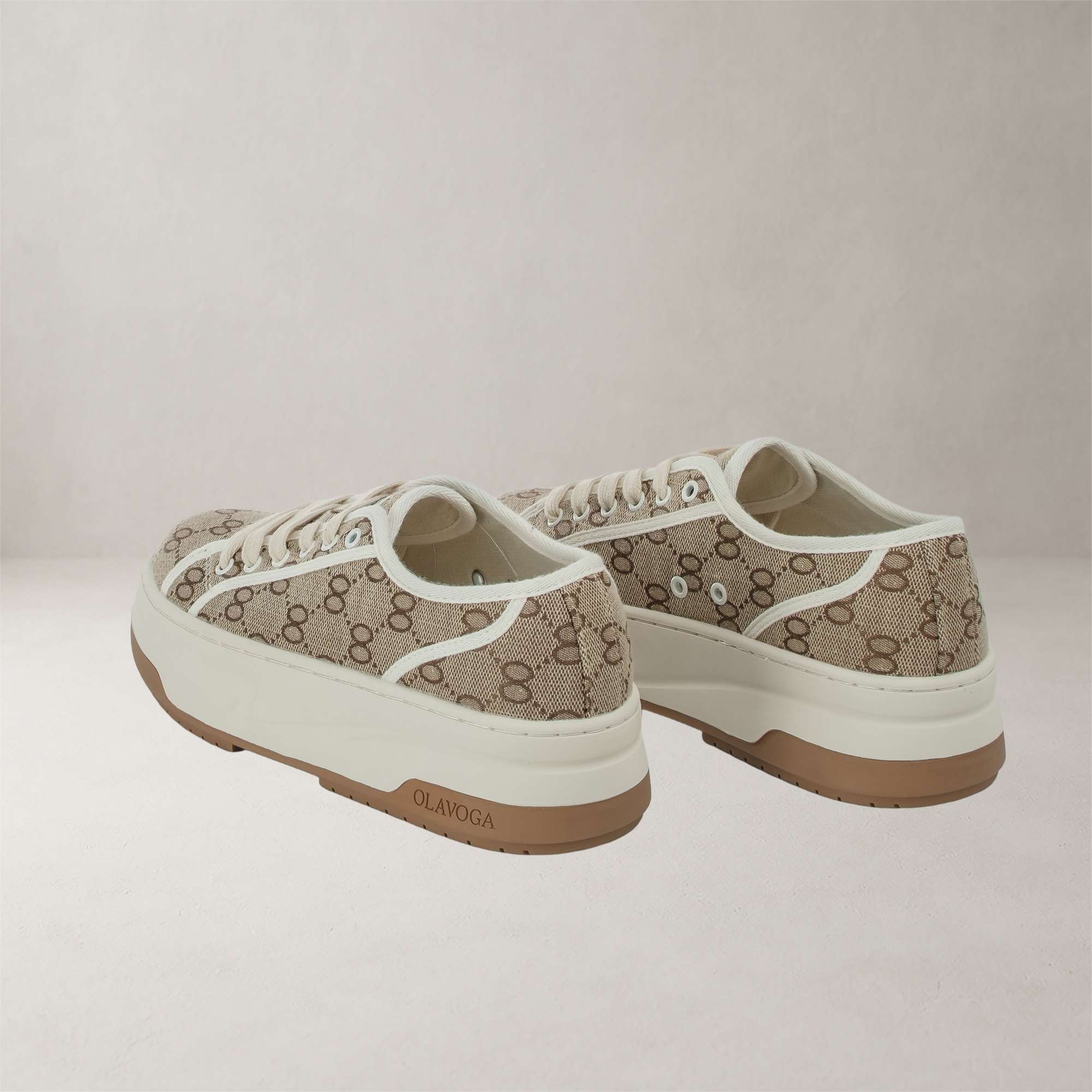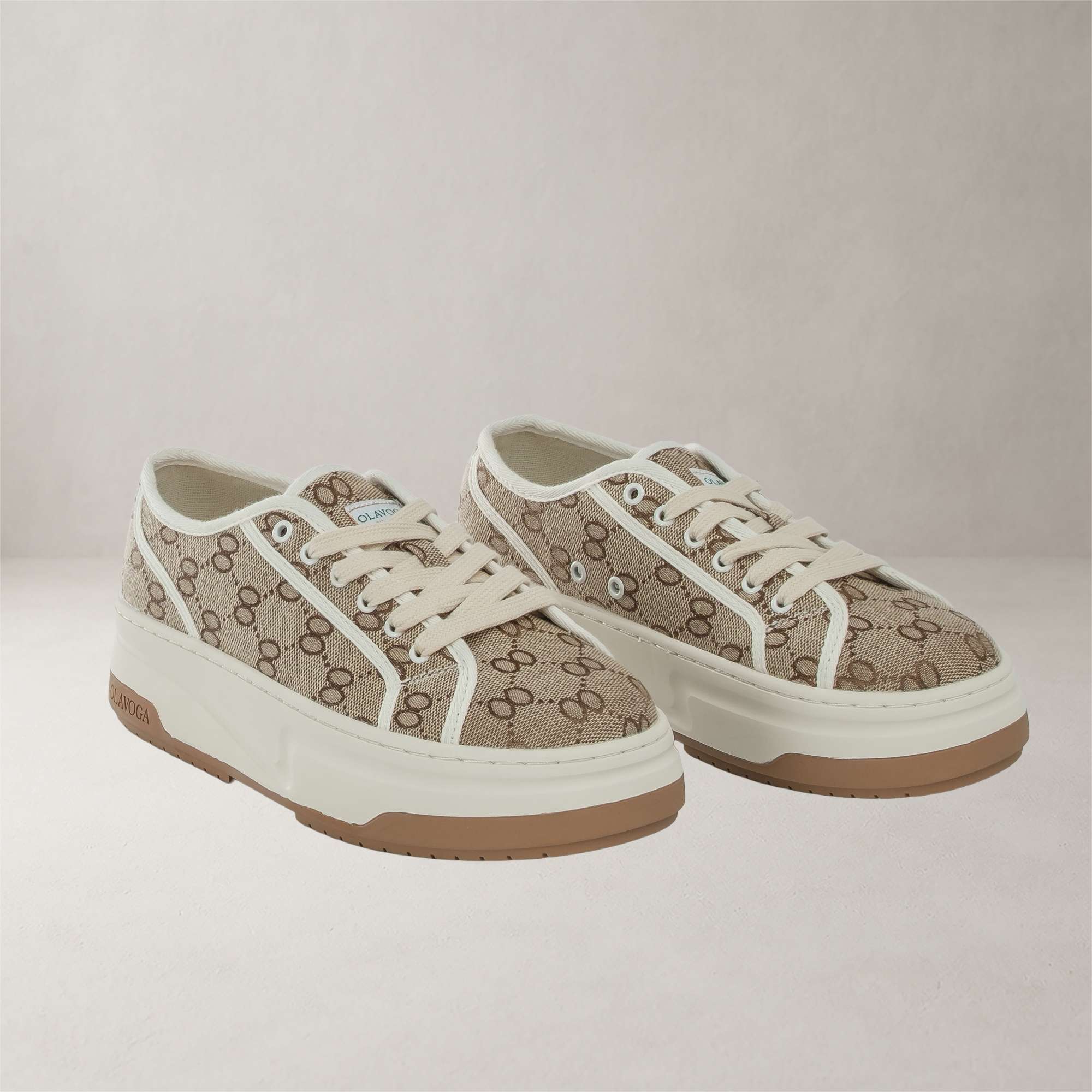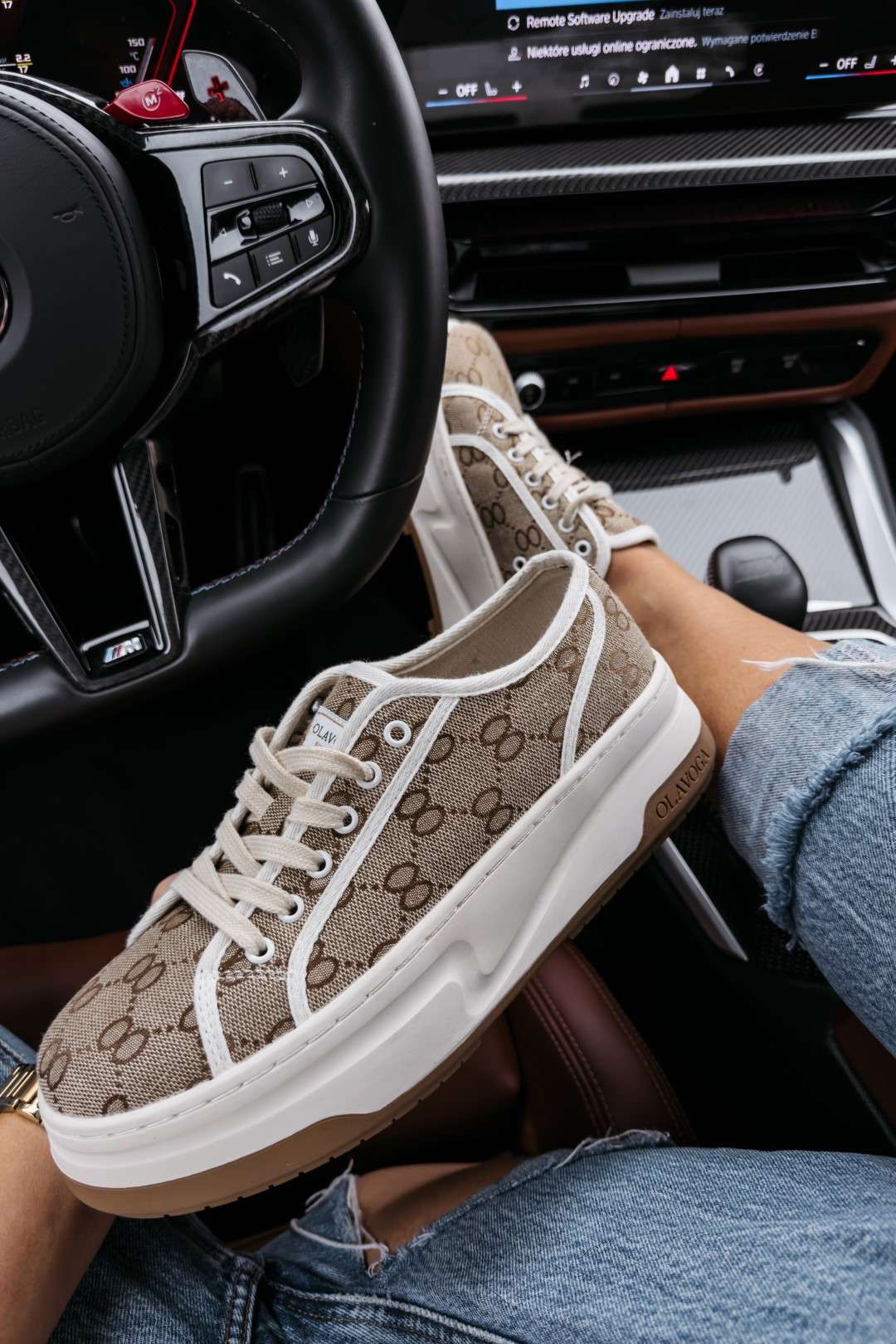 Buty wykonane z materiału z monogramem. Sznurowane, z zaokrąglonym noskiem. Gruba, profilowana podeszwa. Kontrastowe wykończenia i detale. Logo na języku i podeszwie.