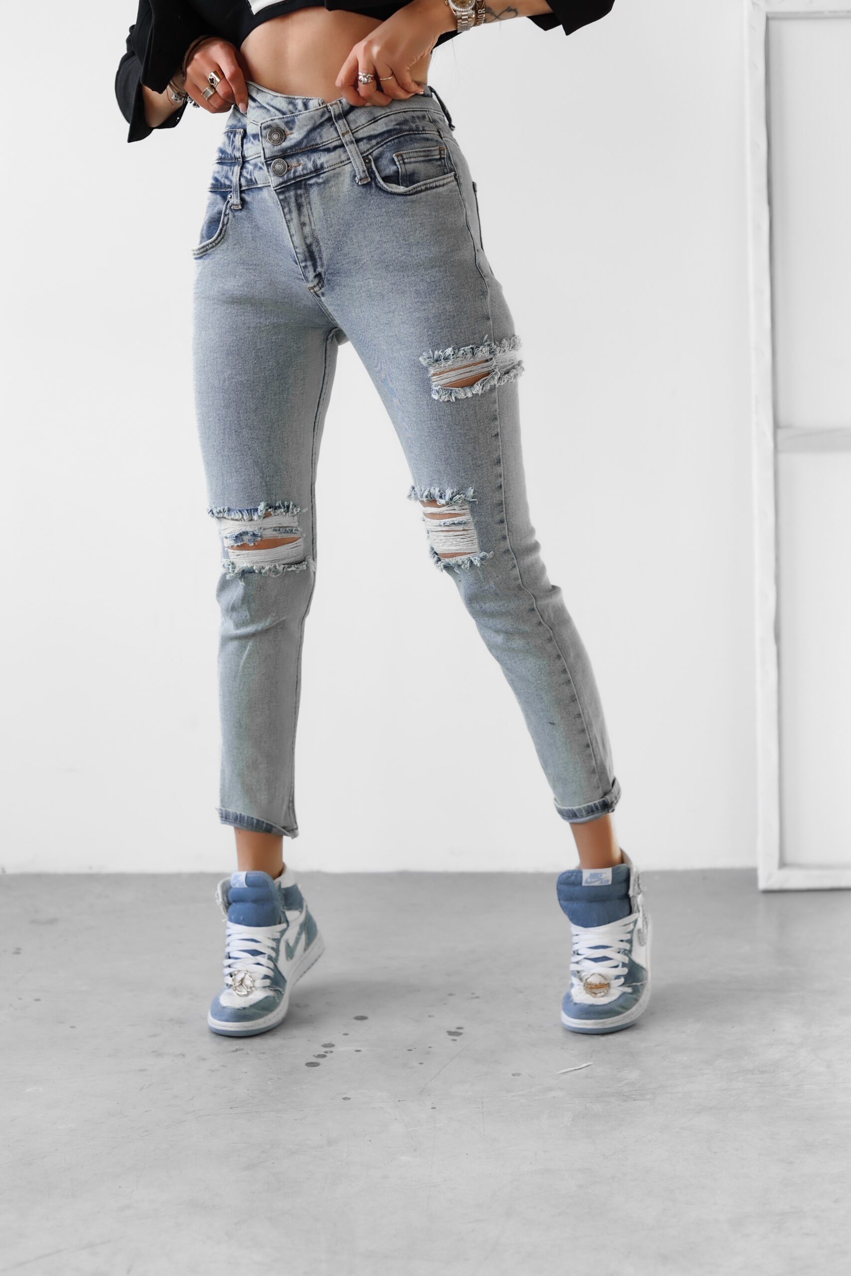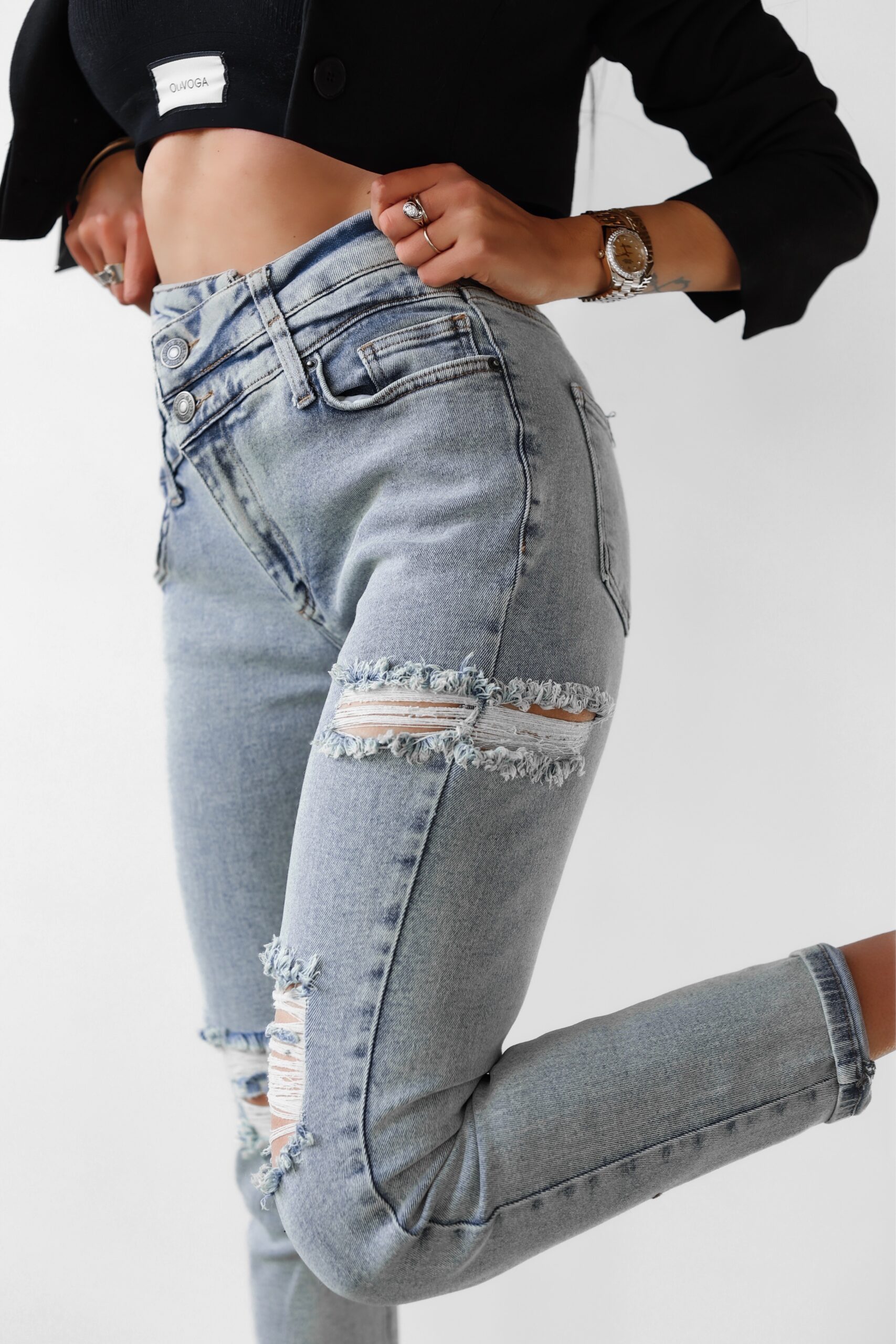 Idealnie przylegające jeansy. Wykonane z wysokiej jakości elastycznego, bawełnianego materiału. Z przodu jak i z tylu kieszenie. Logowany guzik. Skórzana naszywka na tyle produktu z logo marki OLAVOGA. Produkt posiada przetarcia. Przy pasie dodatkowy materiał.