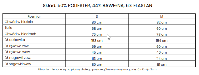 Góra – imitacja marynarki. Po bokach kieszenie. Nogawki rozszerzane ku dołowi. Na rękawach guziki. Na jednym z nich minimalistyczny haft 3D