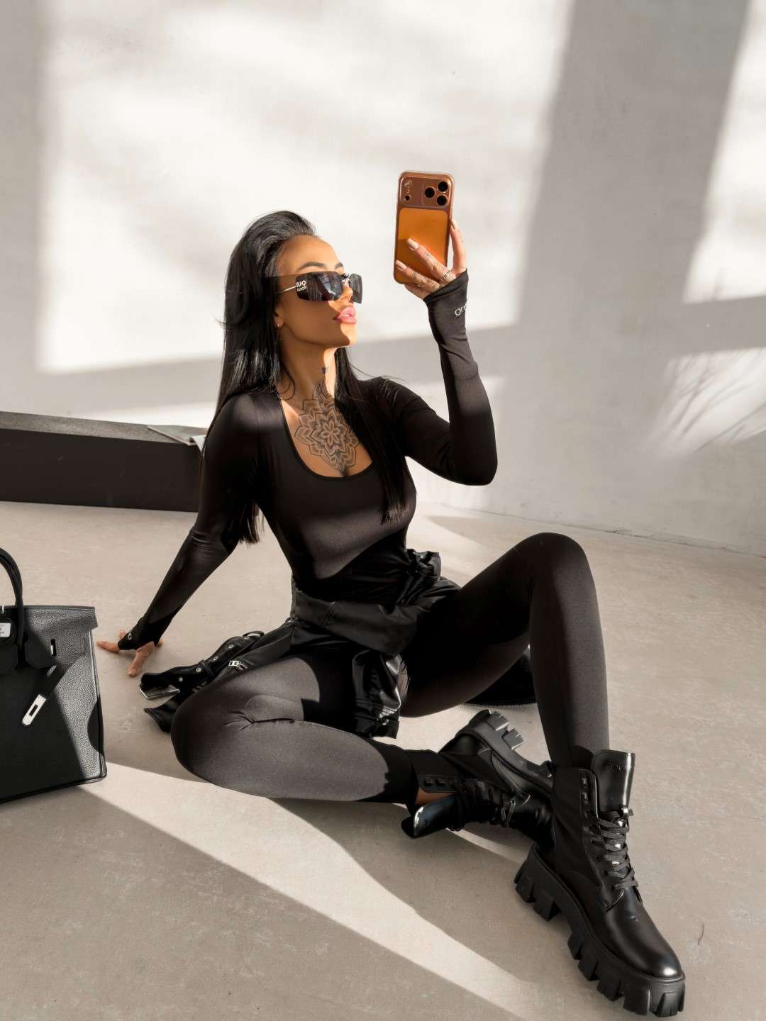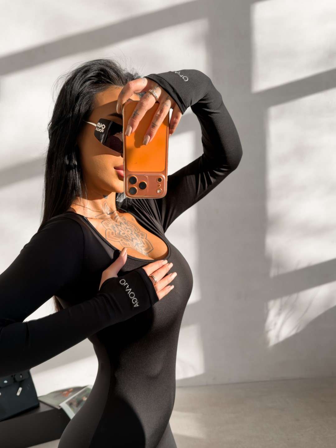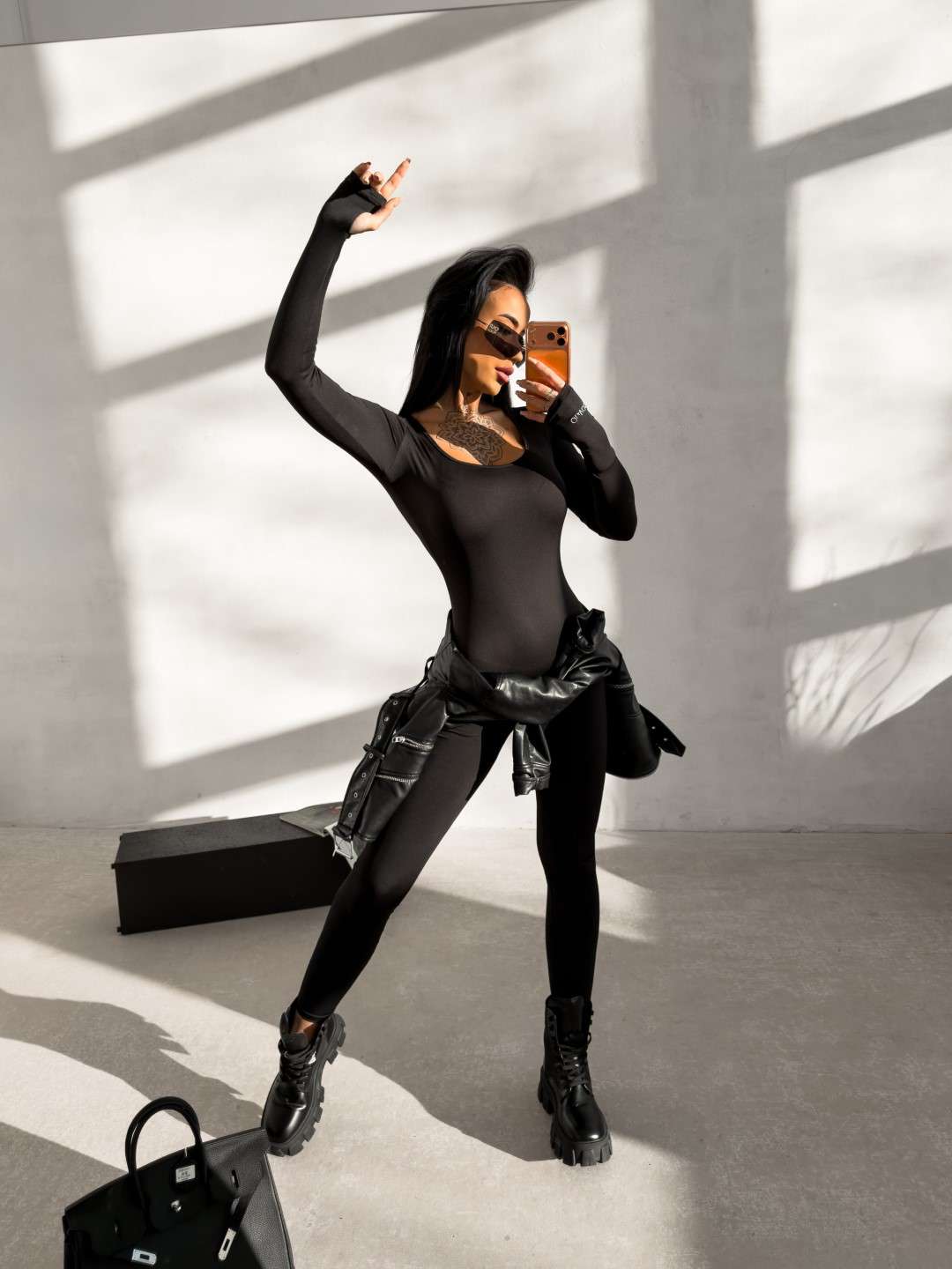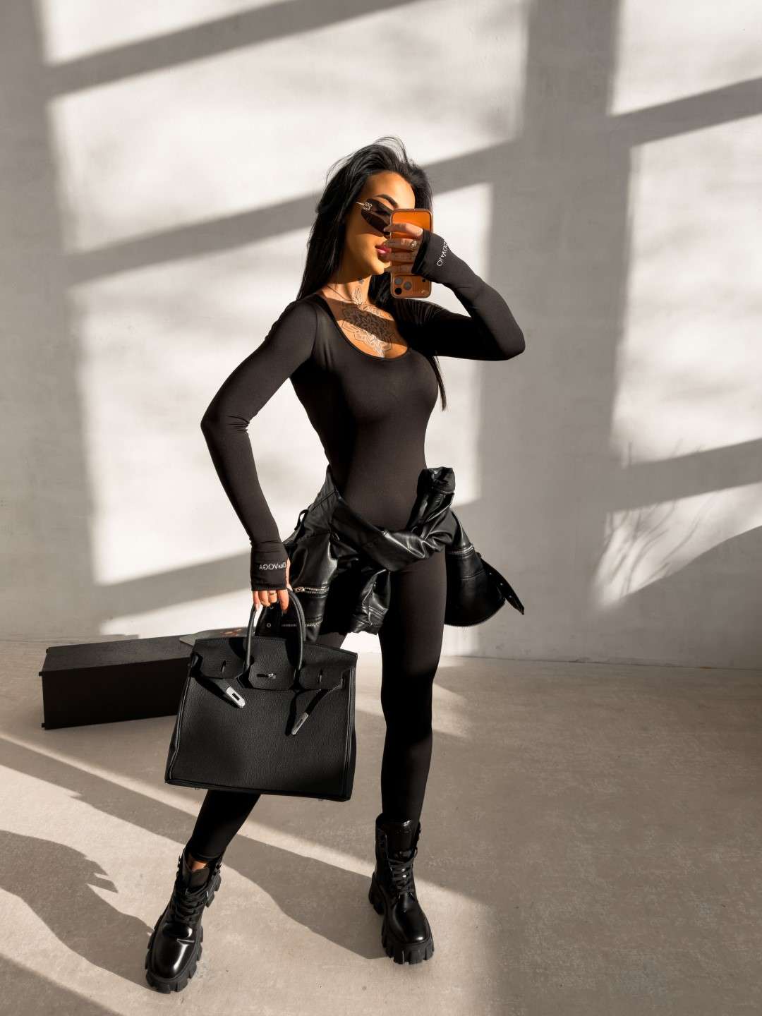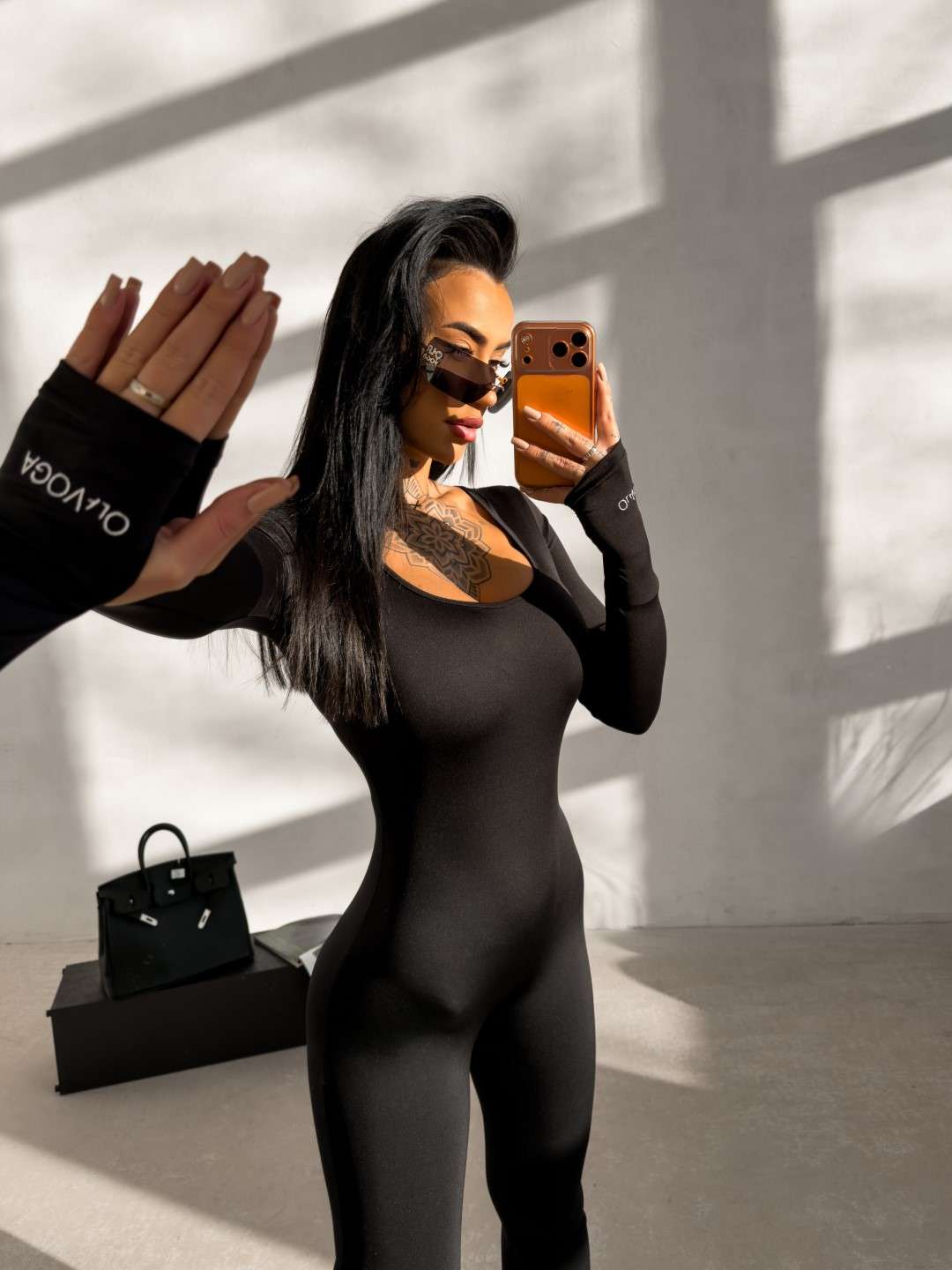 Idealnie dopasowany kombinezon z głębokim dekoltem. Wykonany z wysokiej jakości elastycznego materiału. Model z długim rękawem. Rękawy zakończone subtelnym logo marki OLAVOGA oraz wycięciem na kciuk.