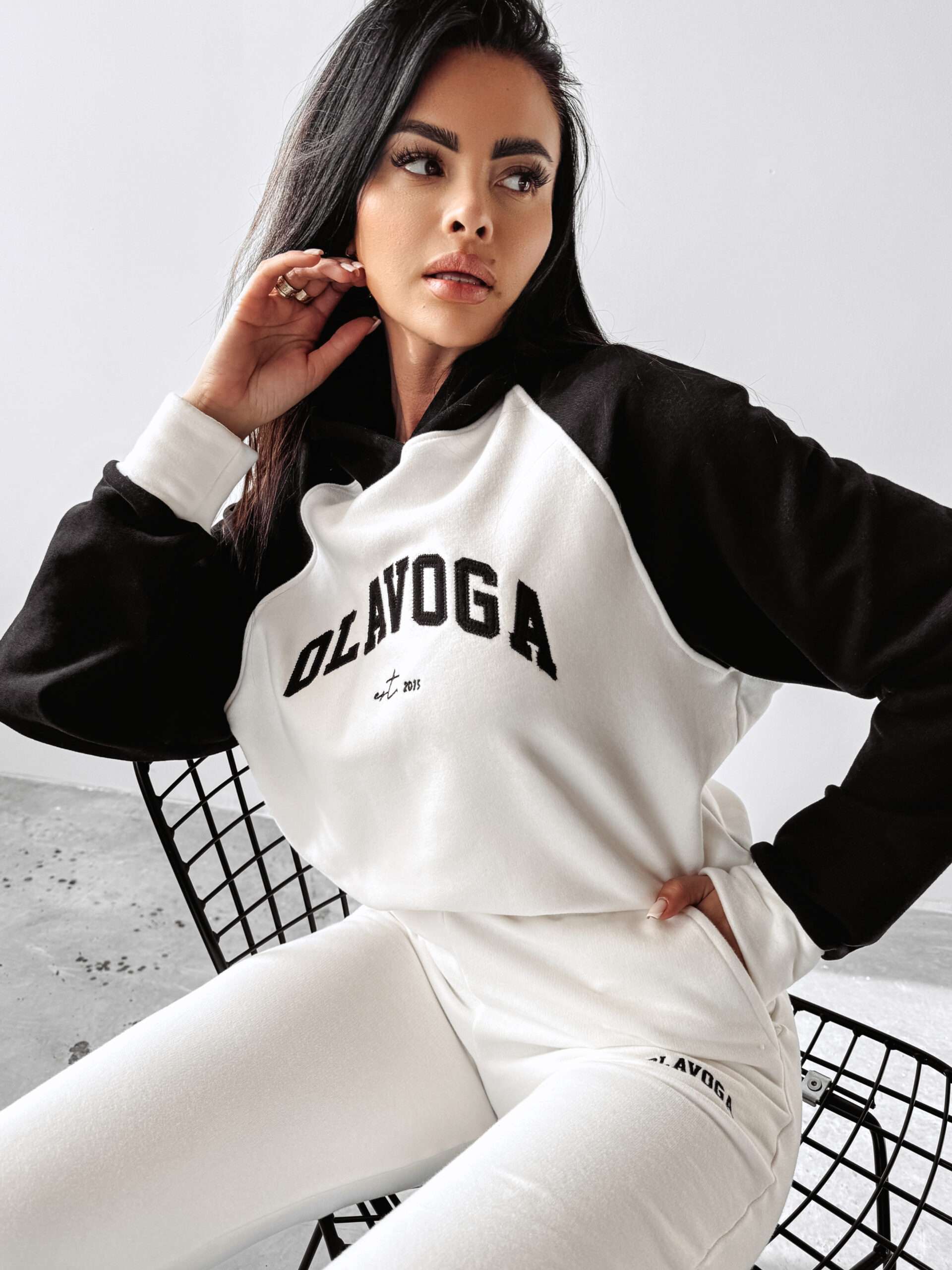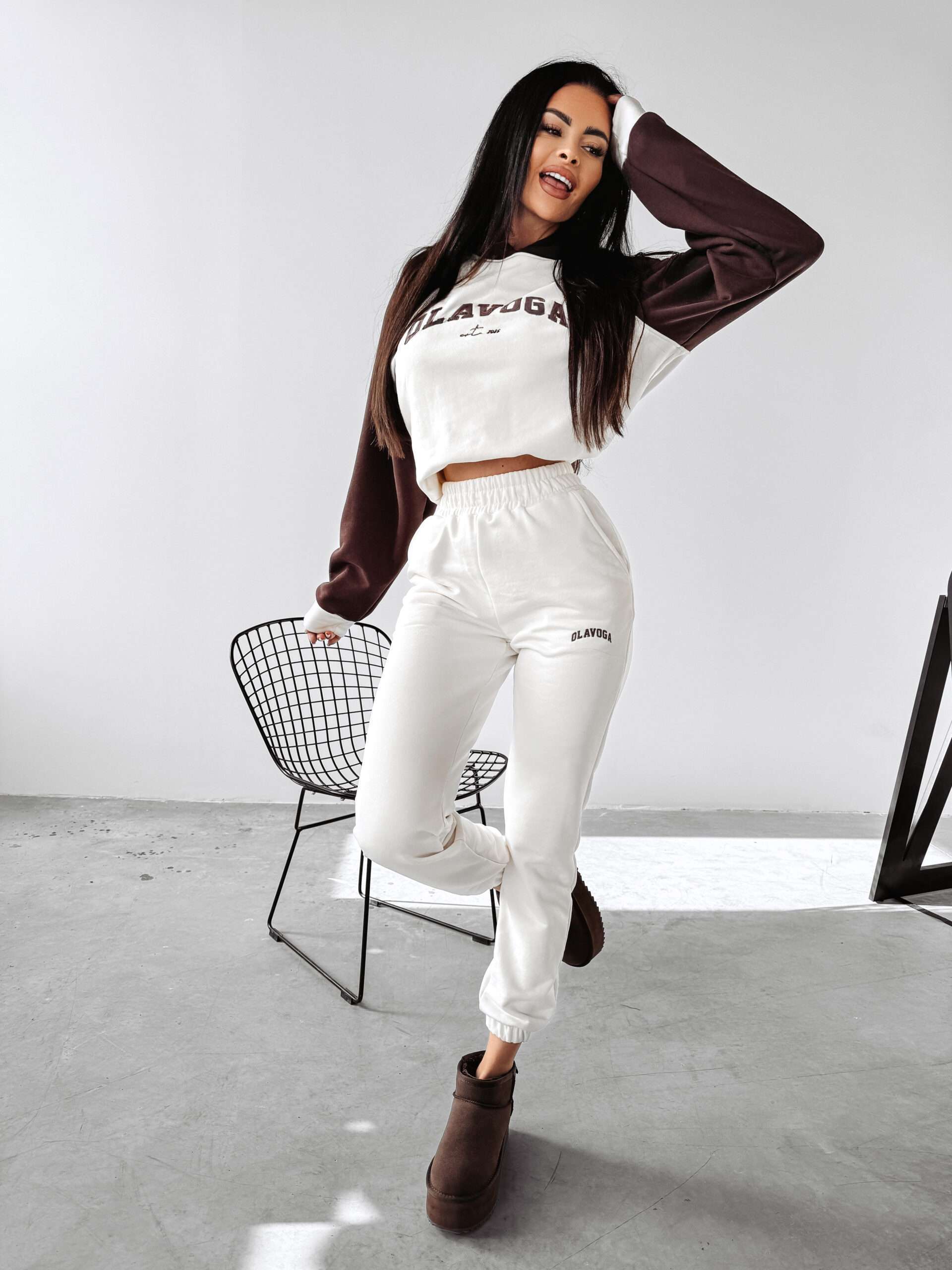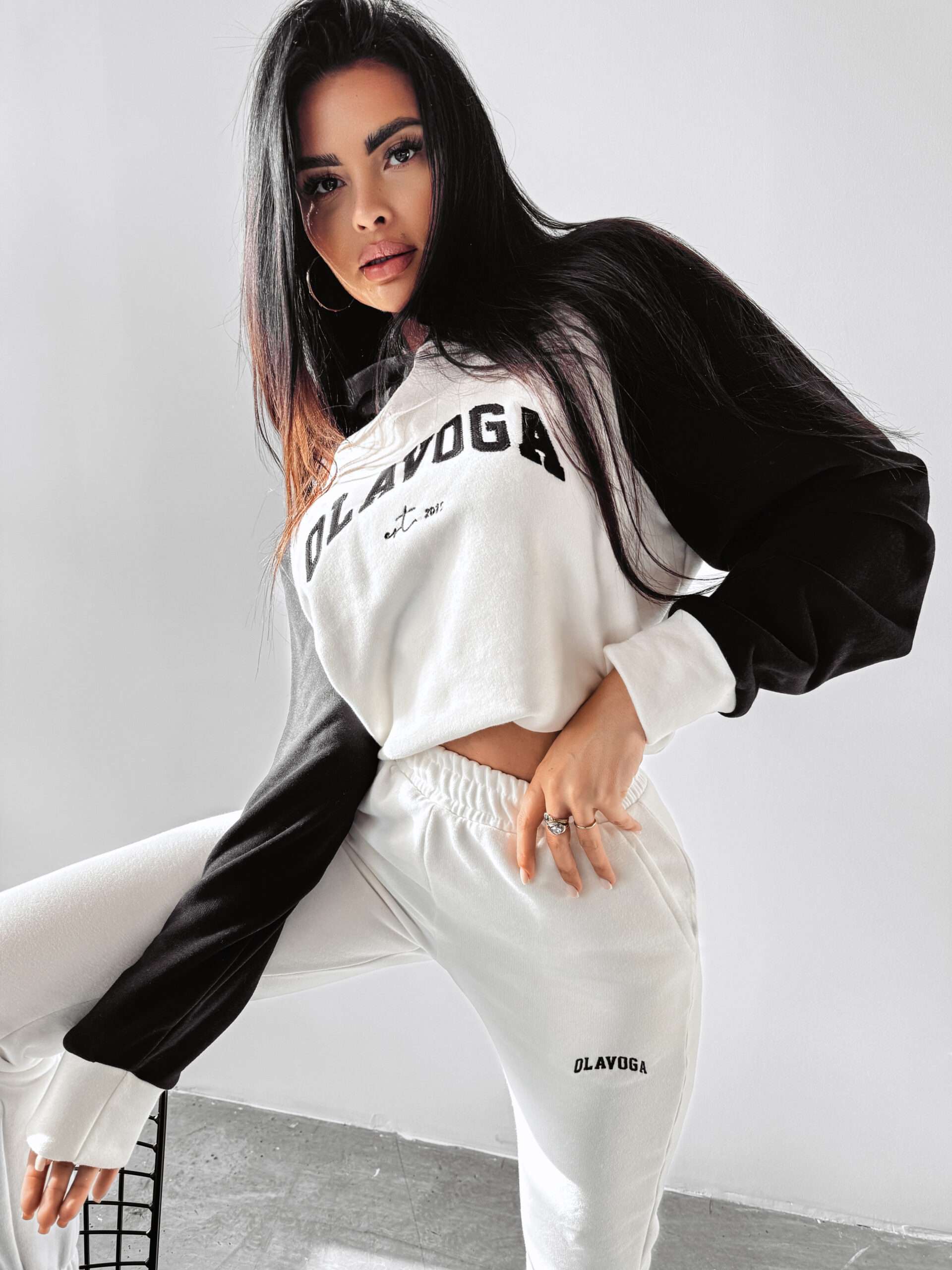 Ocieplany, sportowy komplet damski. Góra – delikatnie oversiz’owa bluza z kapturem, o delikatnie krótszym kroju. Na przodzie obszerna naszywka z logo marki OLAVOGA oraz minimalistycznym EST 2015. Bluza posiada ciekawe zdobienie. Dół – sportowe spodnie z kieszeniami. Na brzegach ściągacze. Na przodzie minimalistyczny haft z logo brandu zgrany kolorystycznie z górą kompletu.