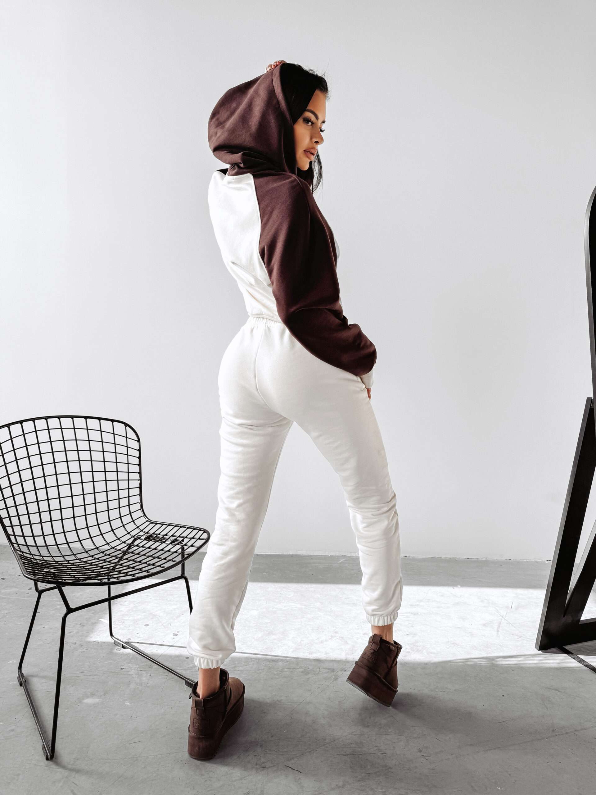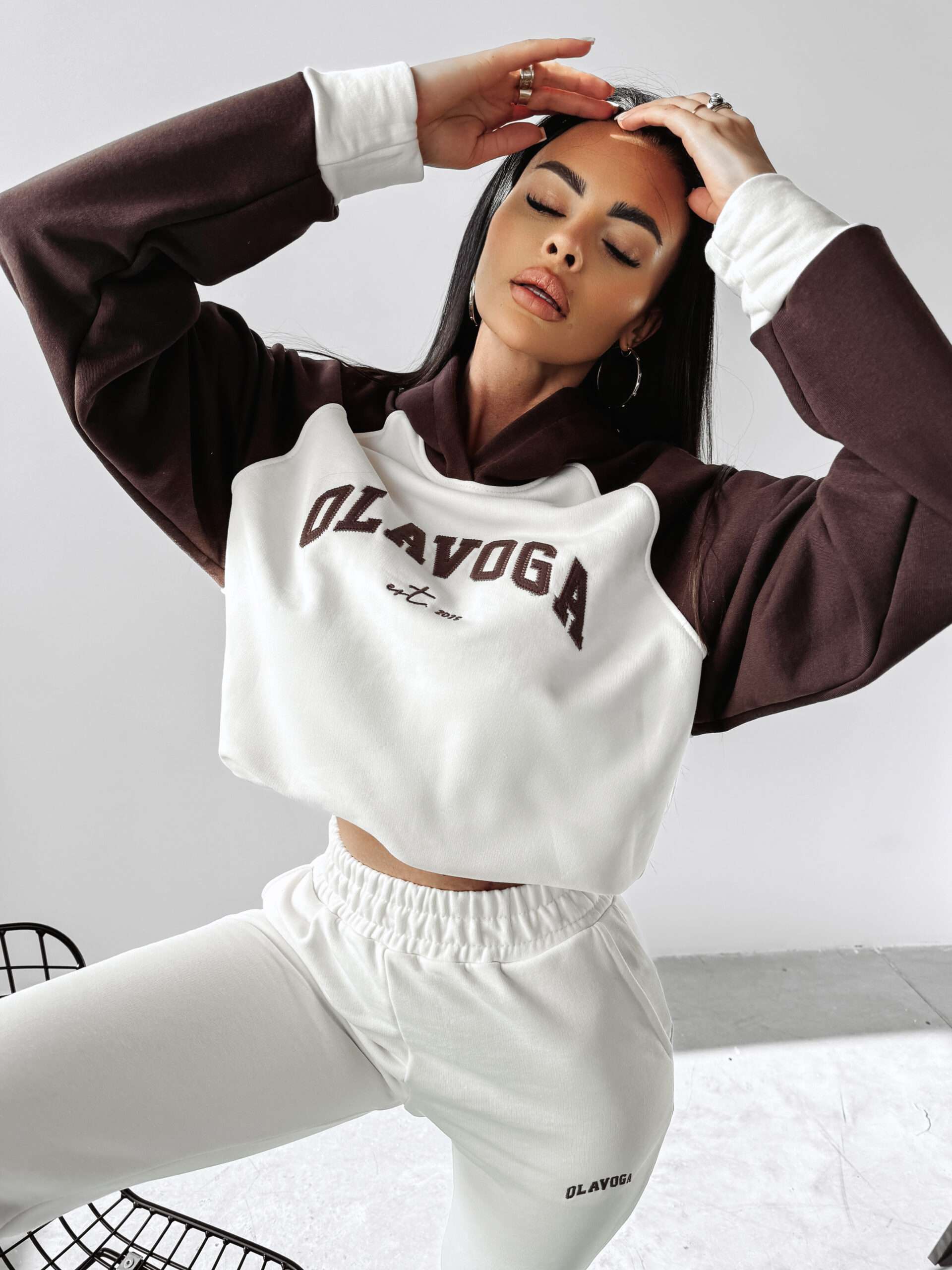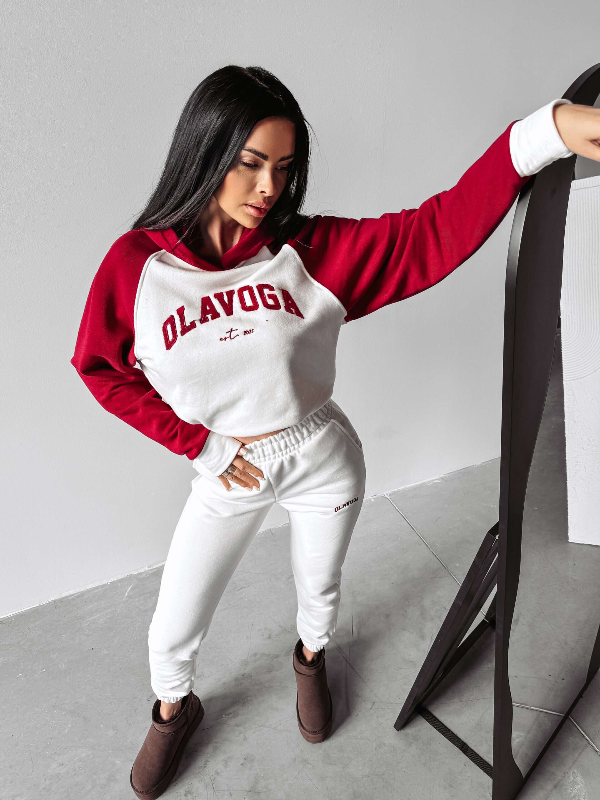 Ocieplany, sportowy komplet damski. Góra – delikatnie oversiz’owa bluza z kapturem, o delikatnie krótszym kroju. Na przodzie obszerna naszywka z logo marki OLAVOGA oraz minimalistycznym EST 2015. Bluza posiada ciekawe zdobienie. Dół – sportowe spodnie z kieszeniami. Na brzegach ściągacze. Na przodzie minimalistyczny haft z logo brandu zgrany kolorystycznie z górą kompletu.