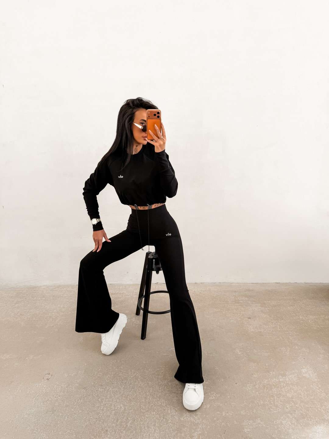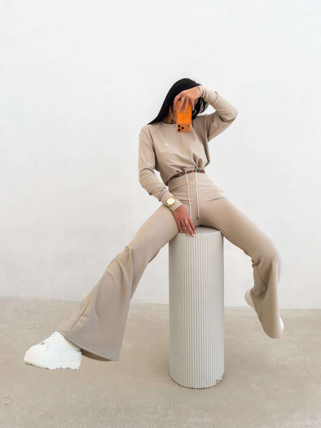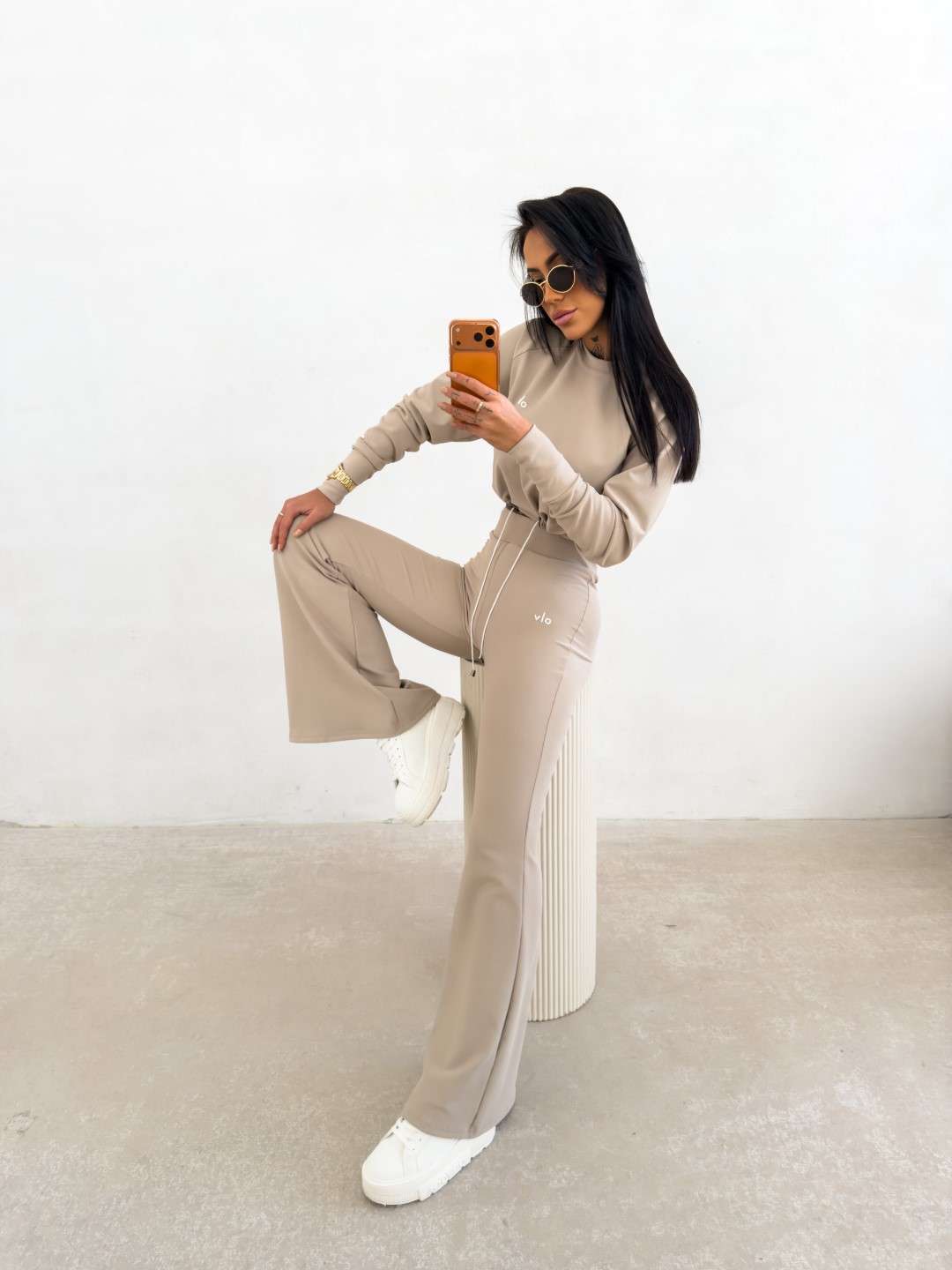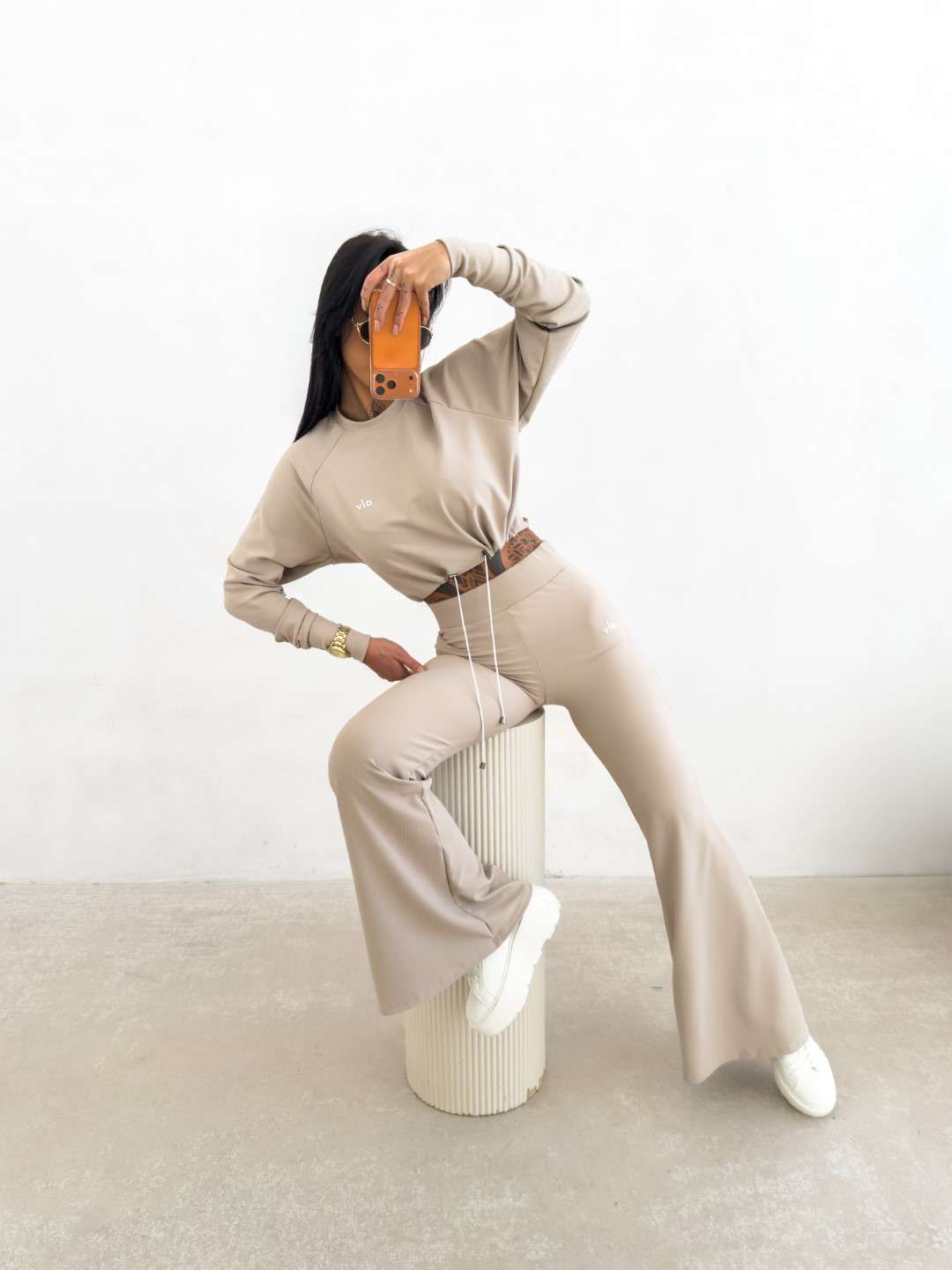 Casualowy komplet wykonany z prążkowanego, elastycznego materiału. Góra – krótka bluza o klasycznym kroju. Model z długim rękawem, wykończonym delikatnymi mankietami. Dół bluzy regulowany za pomocą cienkich troczków. Na przodzie minimalistyczne logo OLV. Dół – spodnie z wysokim stanem. Model o dopasowanym kroju. Nogawki rozszerzane ku dołowi. Na nogawce umieszczone subtelne logo OLV, spójne stylistycznie z górą.