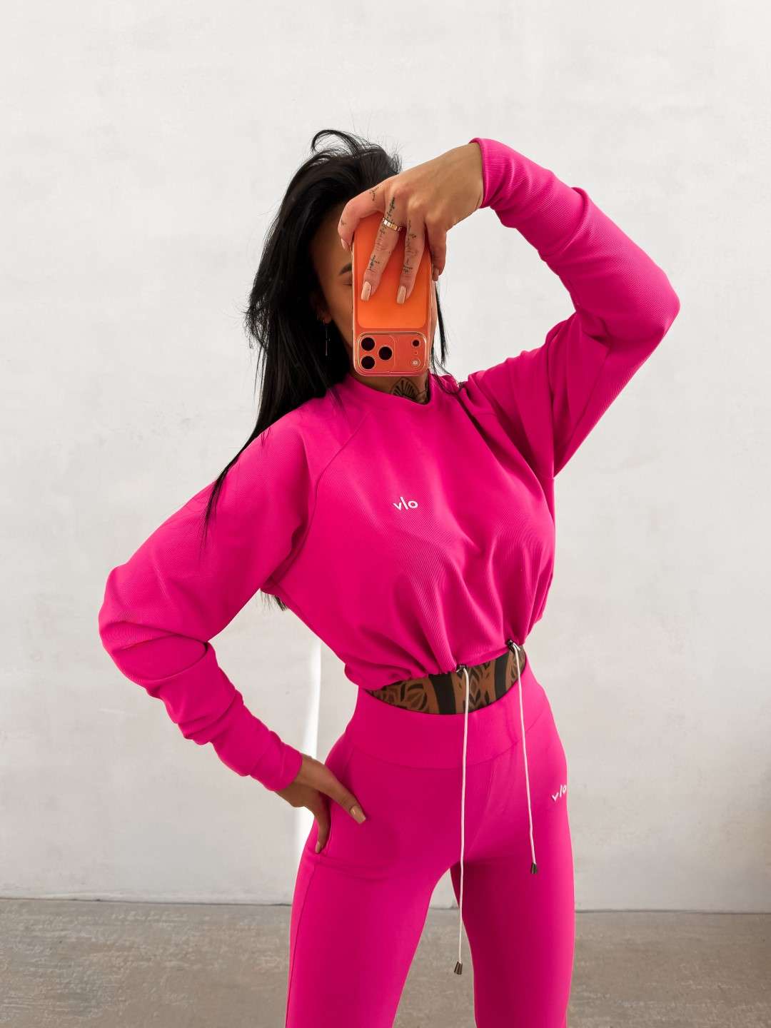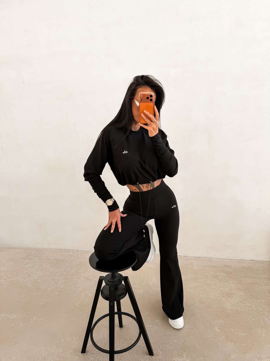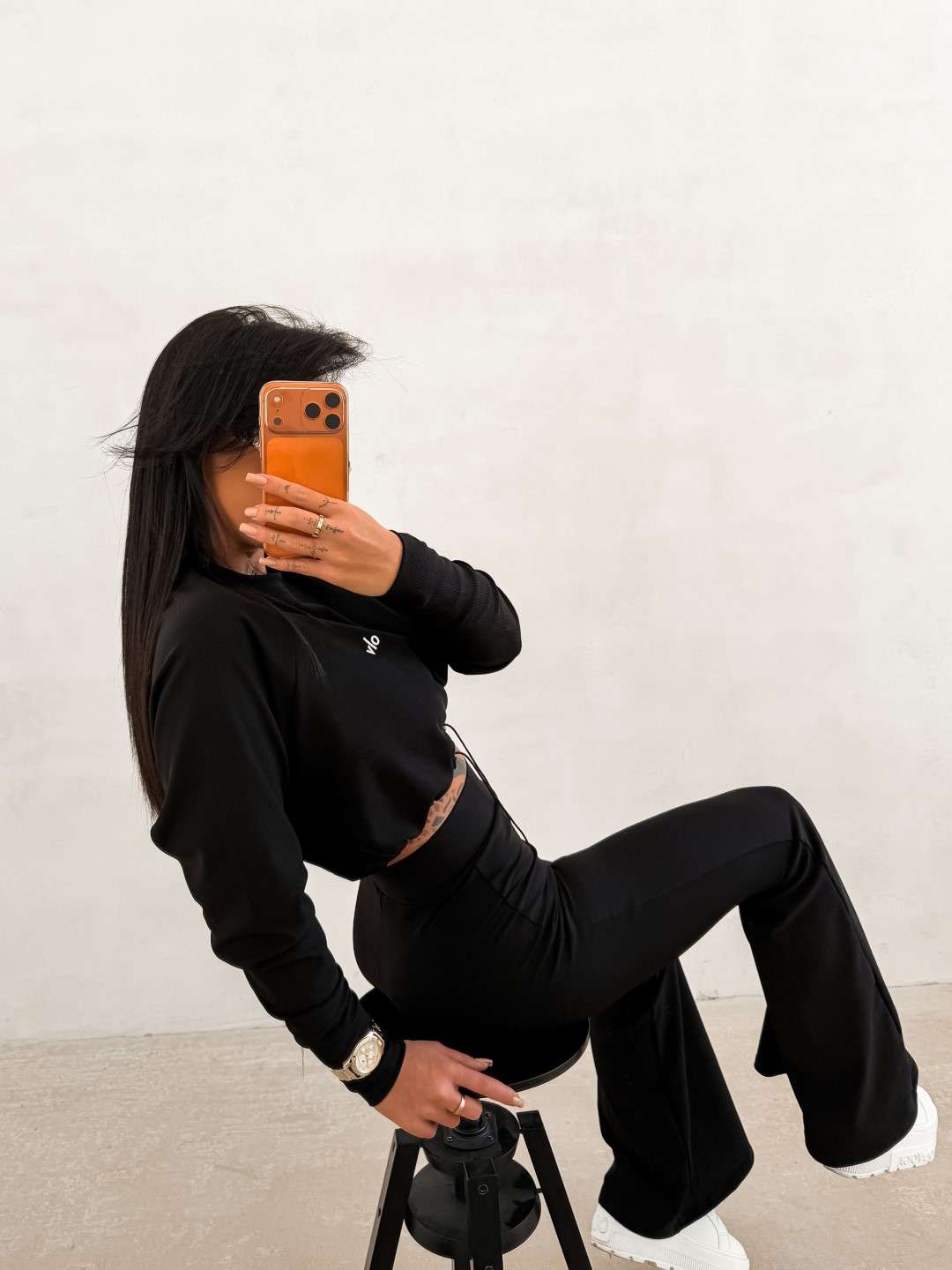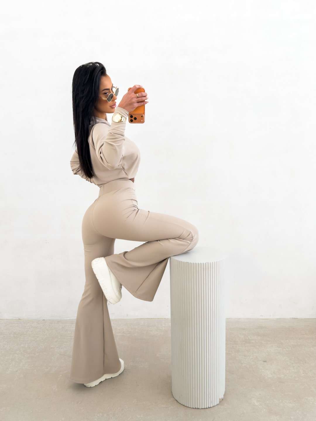 Casualowy komplet wykonany z prążkowanego, elastycznego materiału. Góra – krótka bluza o klasycznym kroju. Model z długim rękawem, wykończonym delikatnymi mankietami. Dół bluzy regulowany za pomocą cienkich troczków. Na przodzie minimalistyczne logo OLV. Dół – spodnie z wysokim stanem. Model o dopasowanym kroju. Nogawki rozszerzane ku dołowi. Na nogawce umieszczone subtelne logo OLV, spójne stylistycznie z górą.