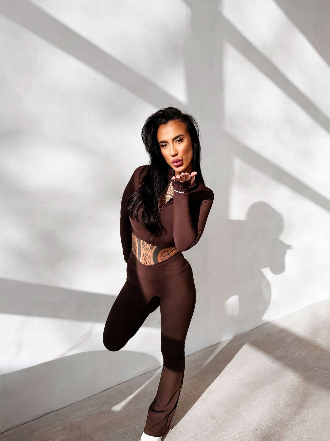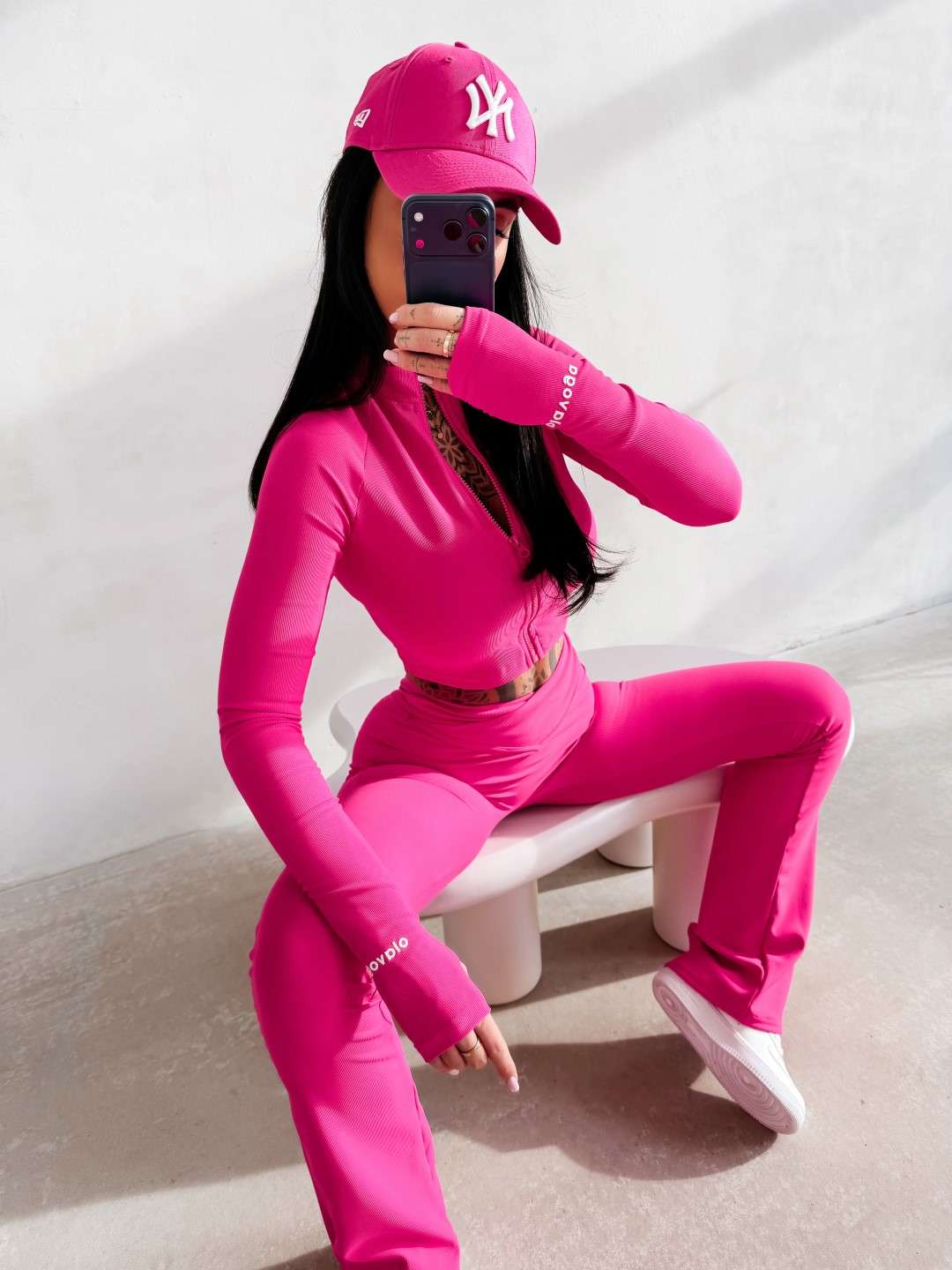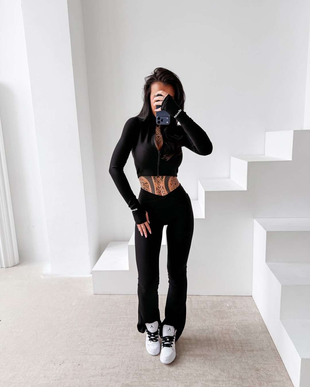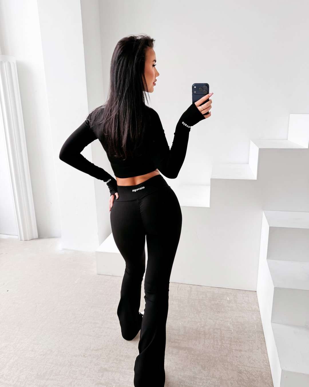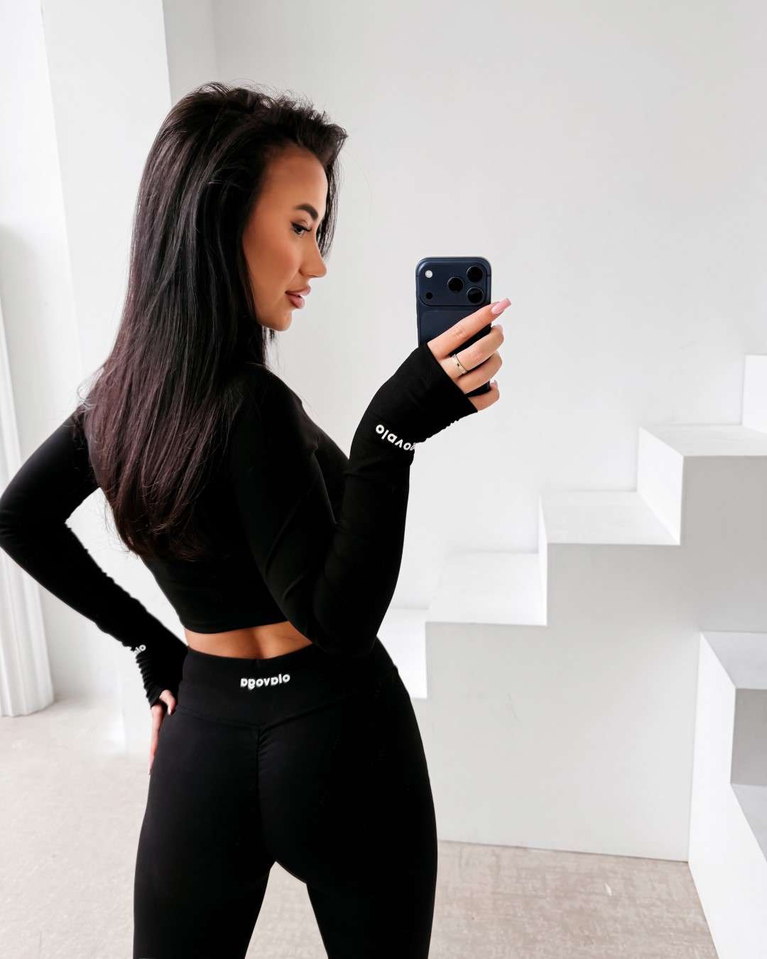 Komplet dopasowany wykonany z elastycznej, miękkiej tkaniny. Legginsy z modelującym pasem podkreślającym sylwetkę oraz subtelnym logo OLAVOGA. Krótka bluza zapinana na suwak. Legginsy z wysokim stanem. Ważne aspekty: dopasowany, modelujący krój, elastyczna komfortowa tkanina, legginsy z wysokim, modelującym pasem, subtelne logo OLAVOGA, krótka bluza zapinana na suwak.