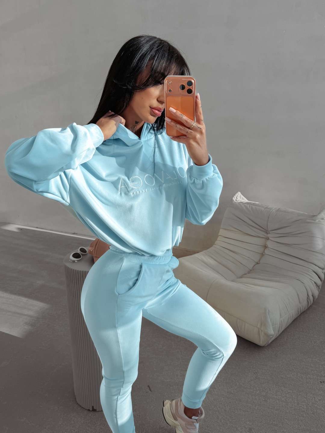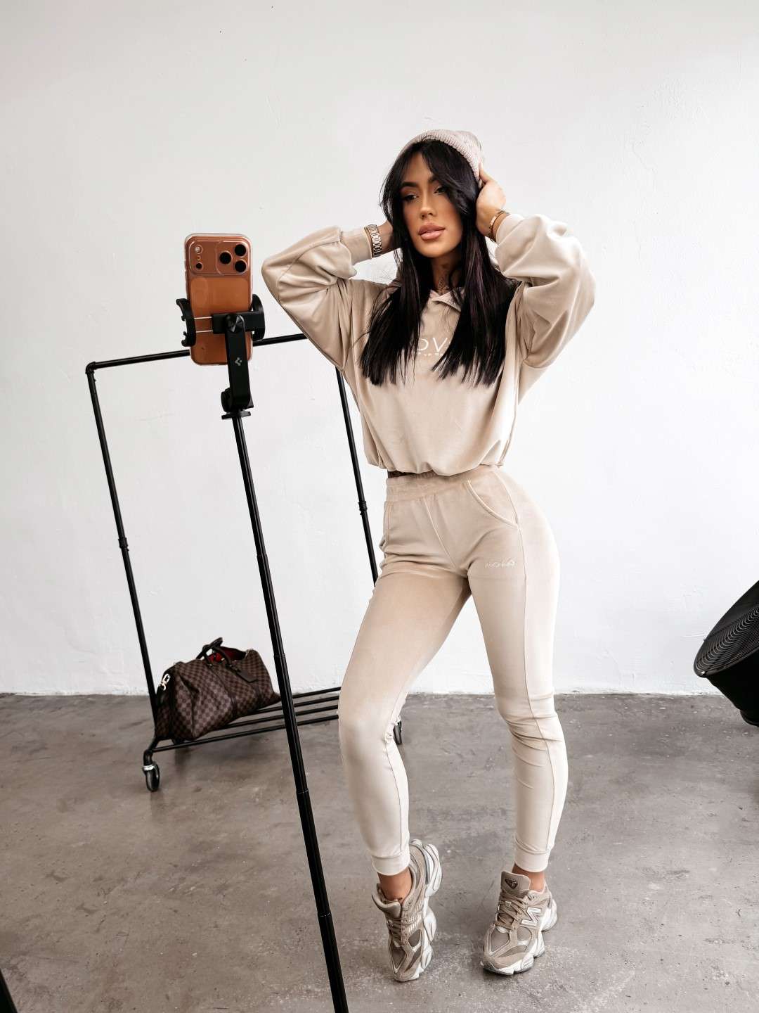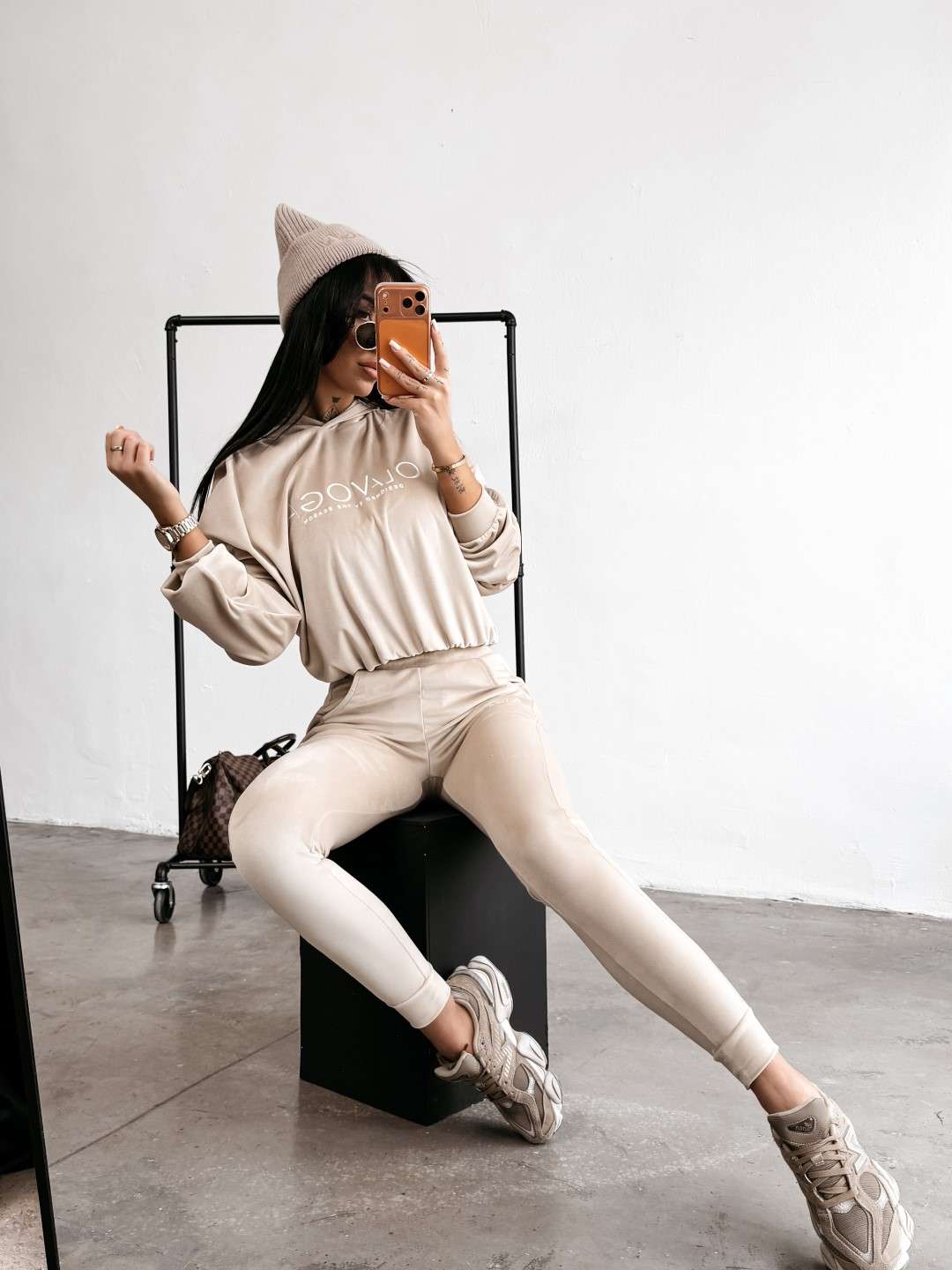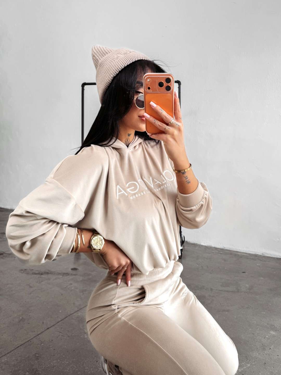 Miękki, welurowy komplet o casualowym charakterze. Wykonany z przyjemnego w dotyku materiału o delikatnym połysku. Góra – bluza z kapturem o luźnym kroju, z lekko obniżoną linią ramion oraz elastycznym wykończeniem u dołu i przy mankietach. Na przodzie minimalistyczny haft z logo marki OLAVOGA. Dół – spodnie o dopasowanym kroju, z elastyczną talią i praktycznymi kieszeniami. Nogawki zakończone ściągaczami delikatnie podkreślają sylwetkę oraz subtelny haft z logo marki OLAVOGA na nogawce.