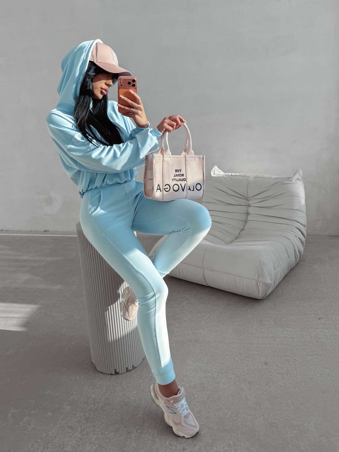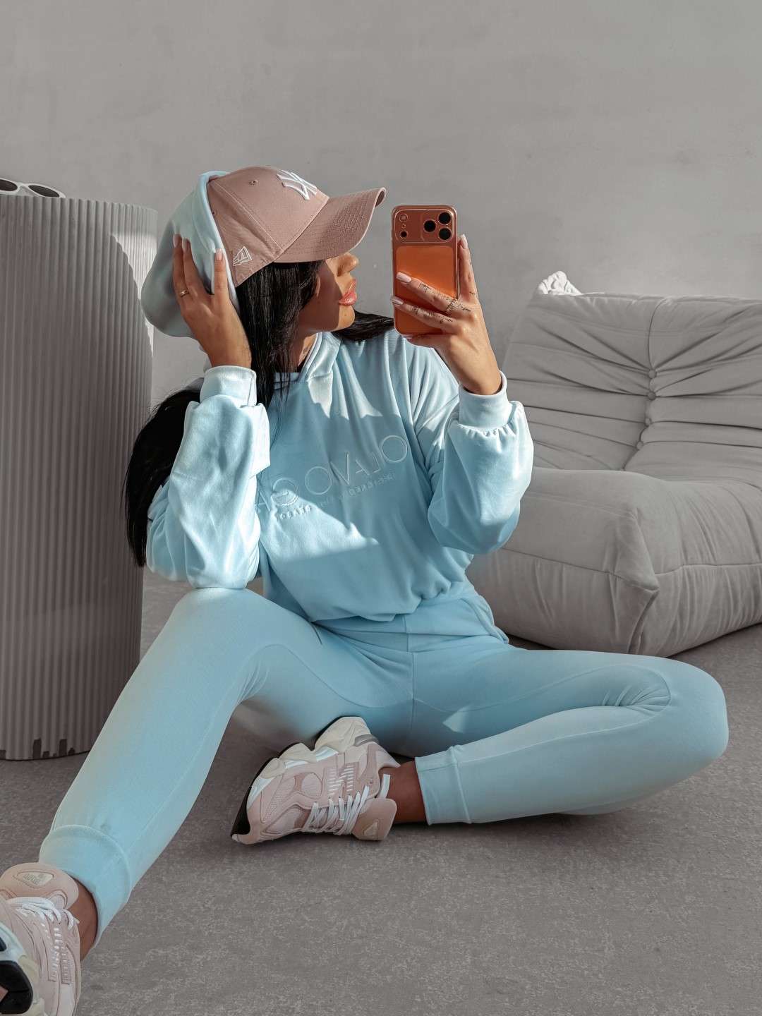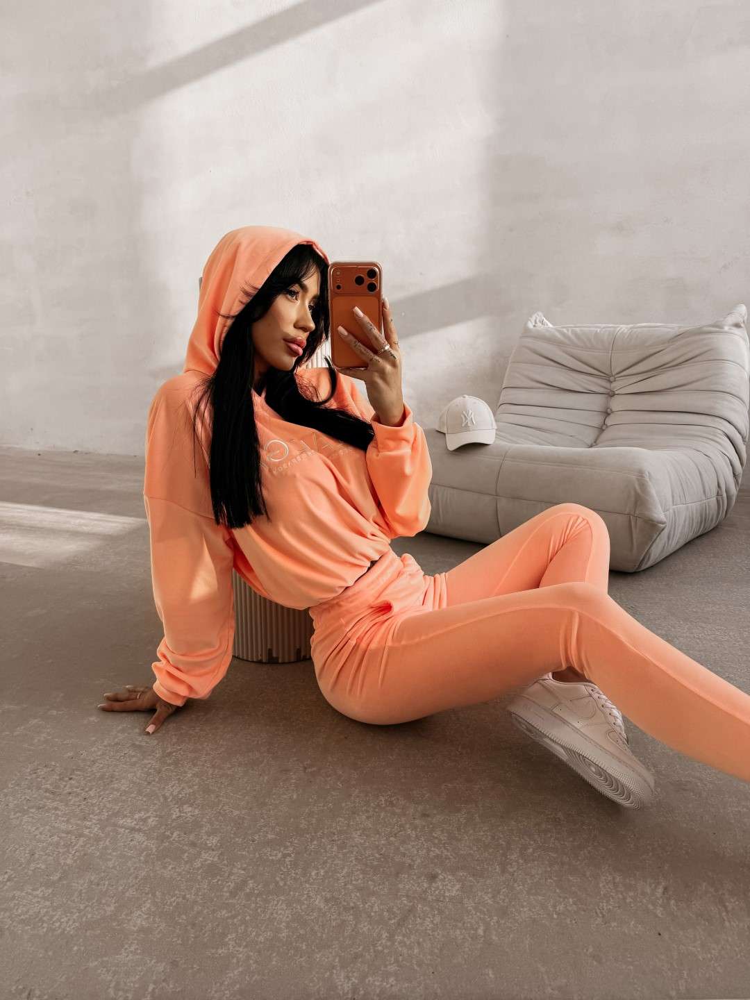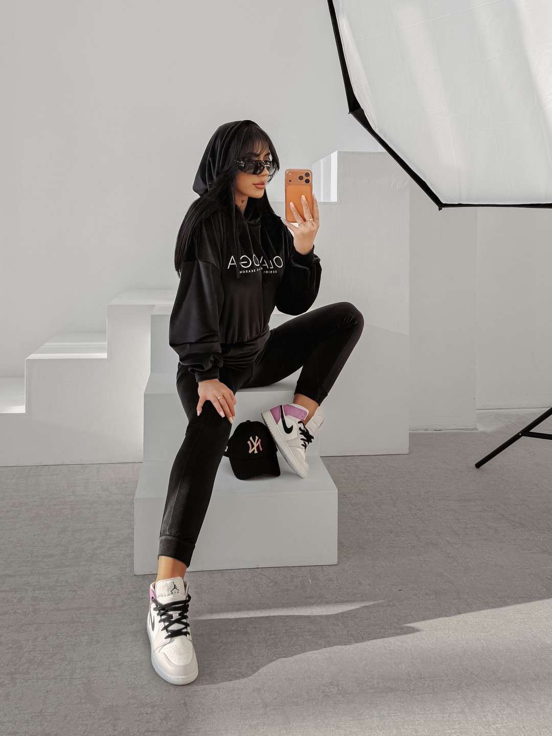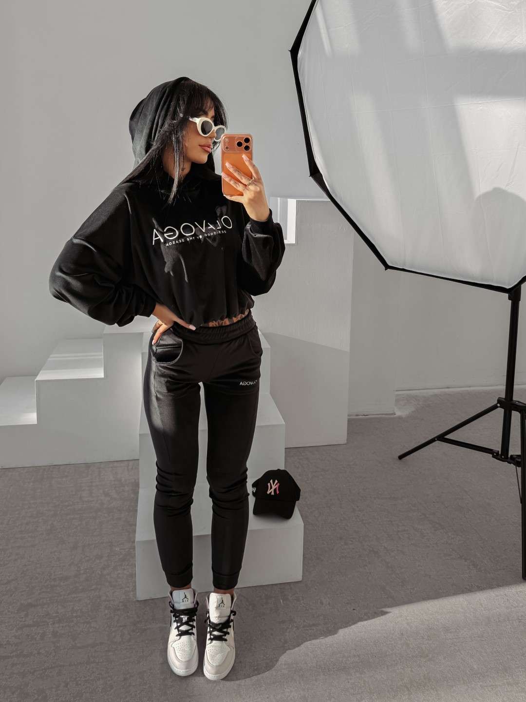 Miękki, welurowy komplet o casualowym charakterze. Wykonany z przyjemnego w dotyku materiału o delikatnym połysku. Góra – bluza z kapturem o luźnym kroju, z lekko obniżoną linią ramion oraz elastycznym wykończeniem u dołu i przy mankietach. Na przodzie minimalistyczny haft z logo marki OLAVOGA. Dół – spodnie o dopasowanym kroju, z elastyczną talią i praktycznymi kieszeniami. Nogawki zakończone ściągaczami delikatnie podkreślają sylwetkę oraz subtelny haft z logo marki OLAVOGA na nogawce.