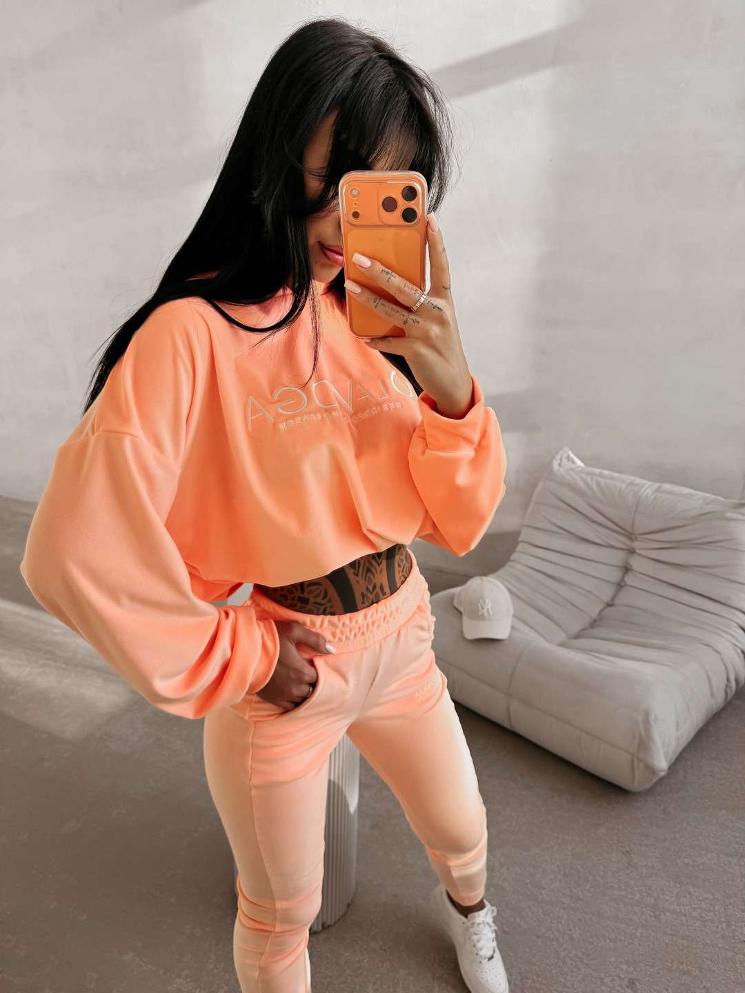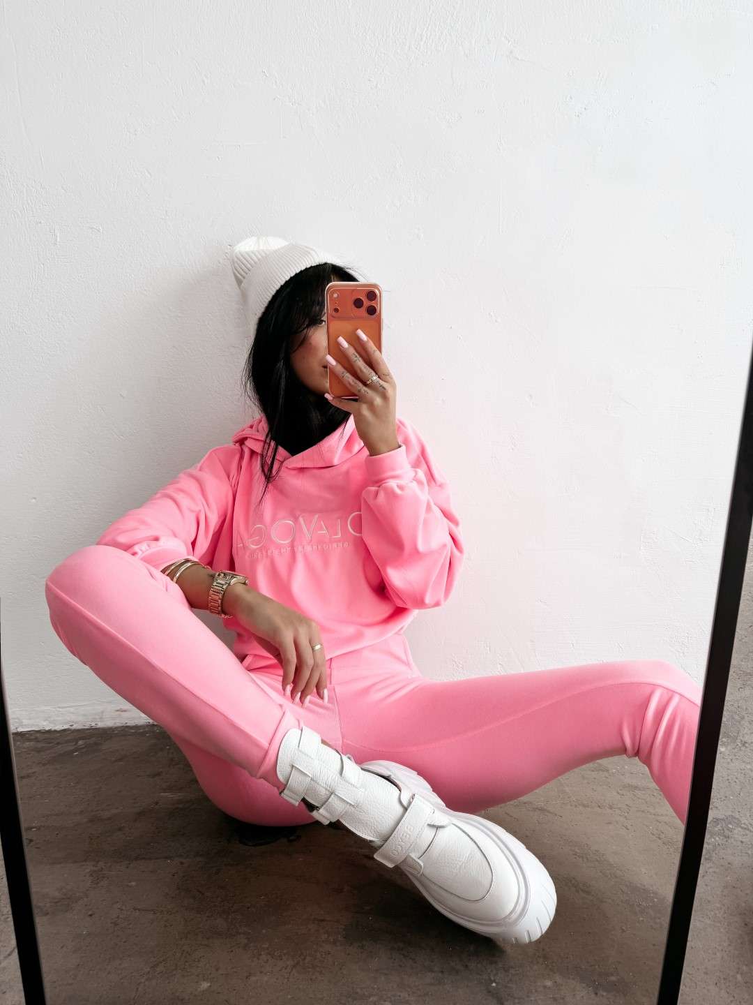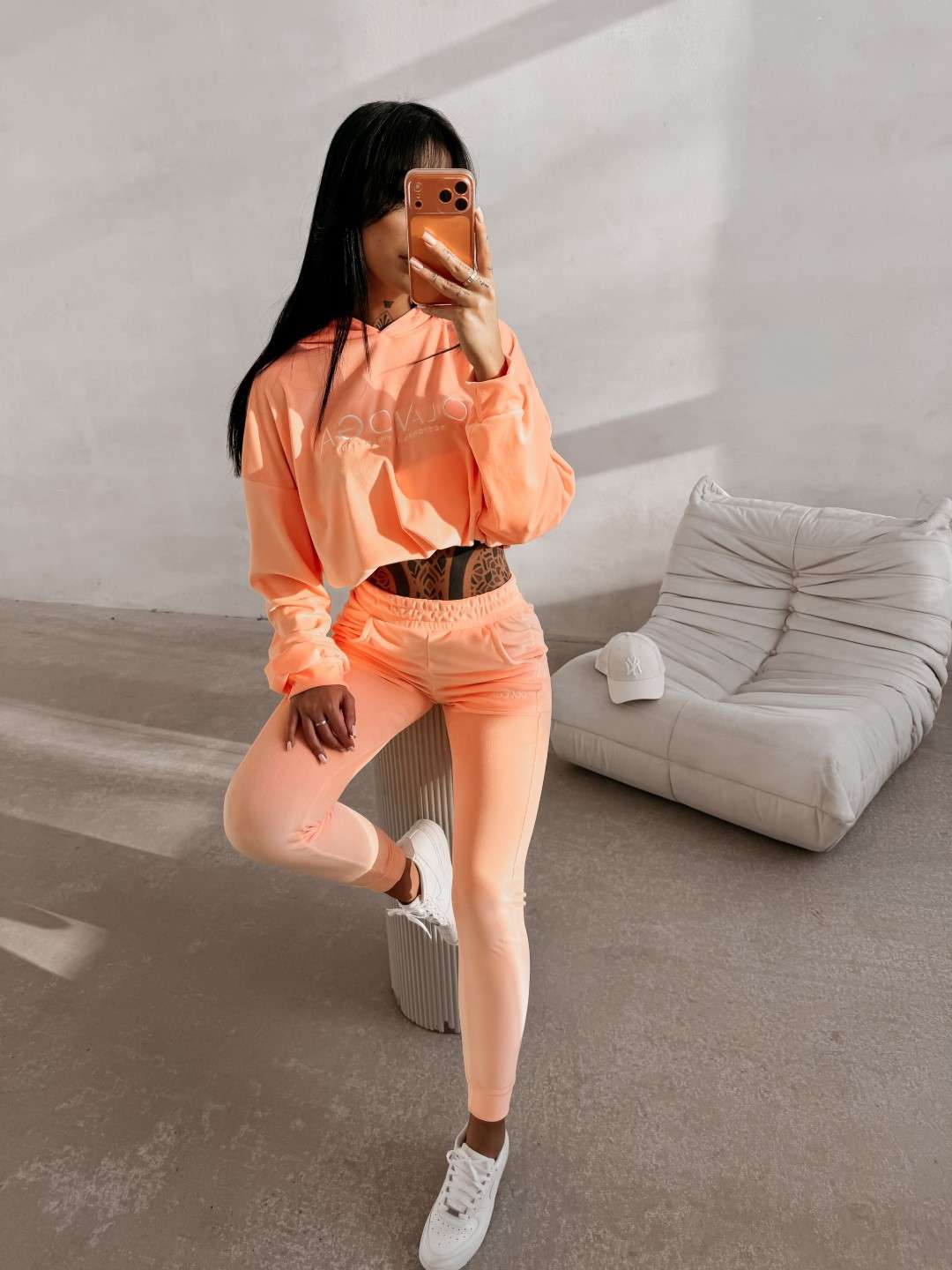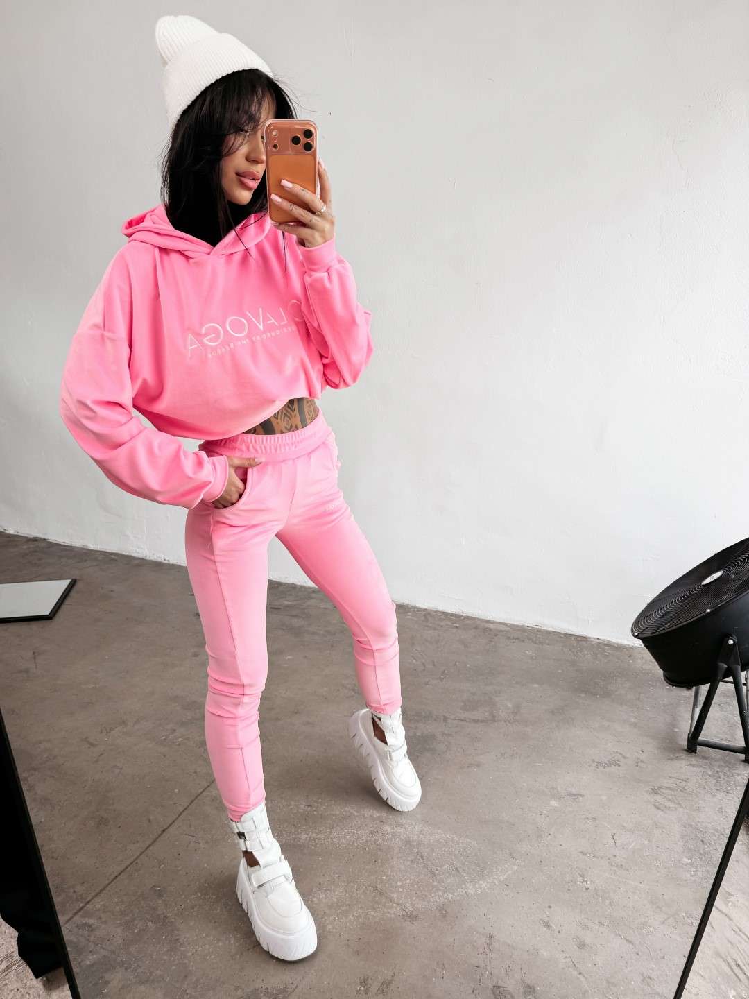 Miękki, welurowy komplet o casualowym charakterze. Wykonany z przyjemnego w dotyku materiału o delikatnym połysku. Góra – bluza z kapturem o luźnym kroju, z lekko obniżoną linią ramion oraz elastycznym wykończeniem u dołu i przy mankietach. Na przodzie minimalistyczny haft z logo marki OLAVOGA. Dół – spodnie o dopasowanym kroju, z elastyczną talią i praktycznymi kieszeniami. Nogawki zakończone ściągaczami delikatnie podkreślają sylwetkę oraz subtelny haft z logo marki OLAVOGA na nogawce.