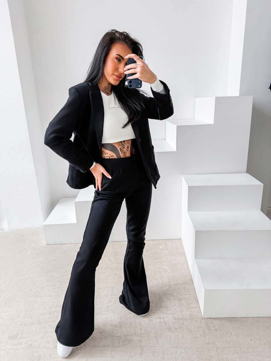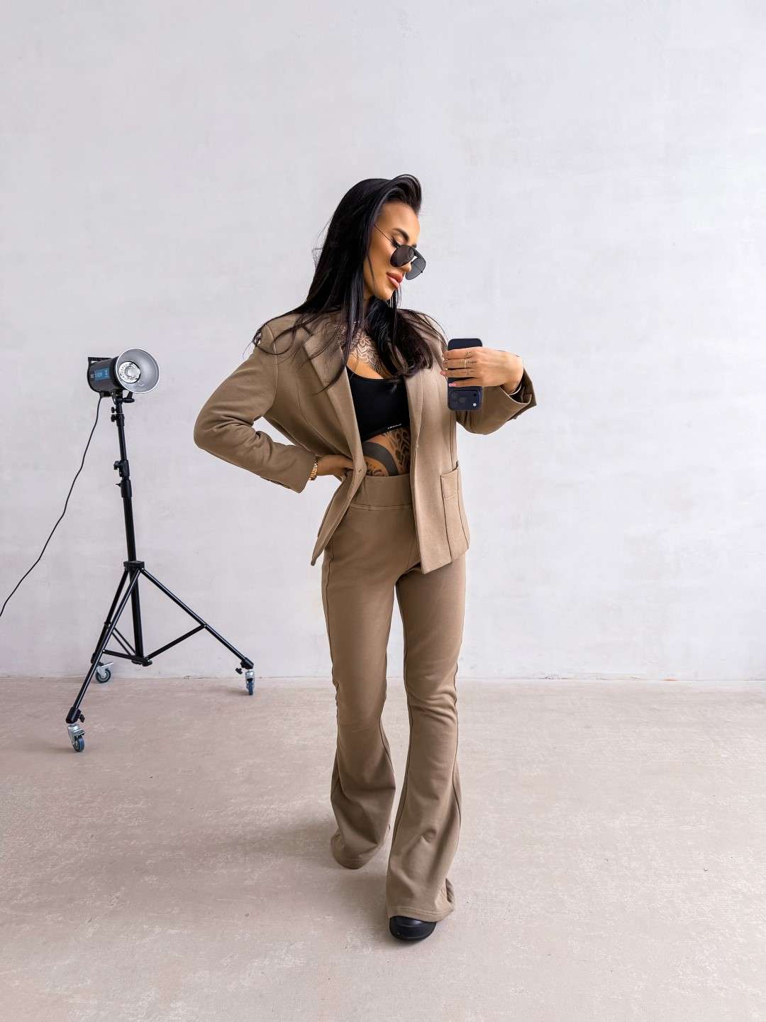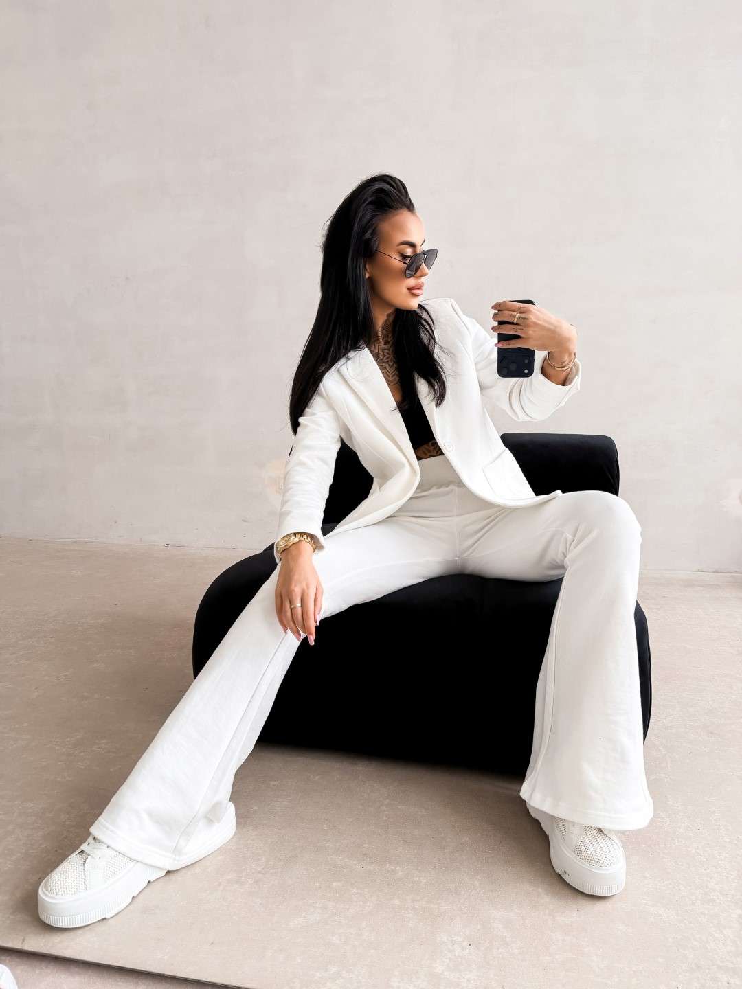 Elegancki komplet o dopasowanym, kobiecym kroju wykonany z wysokiej jakości materiału. Góra – klasyczna marynarka o prostym, lekko taliowanym fasonie z klapami i kieszeniami z przodu. Dół – spodnie z podwyższonym stanem i dopasowaną linią bioder, delikatnie rozszerzane ku dołowi. Na nogawce subtelny z logo marki OLV.