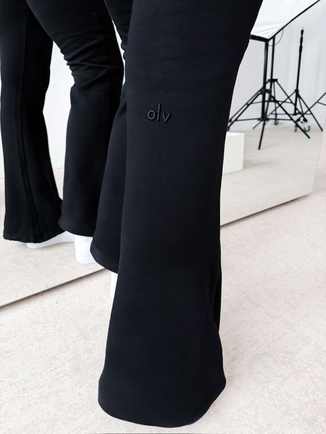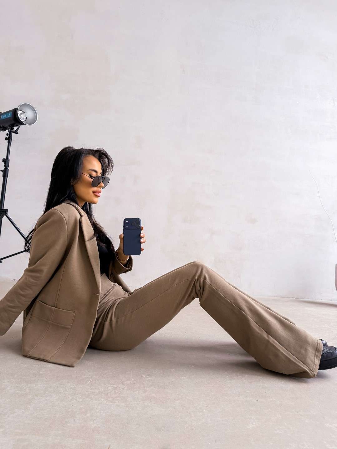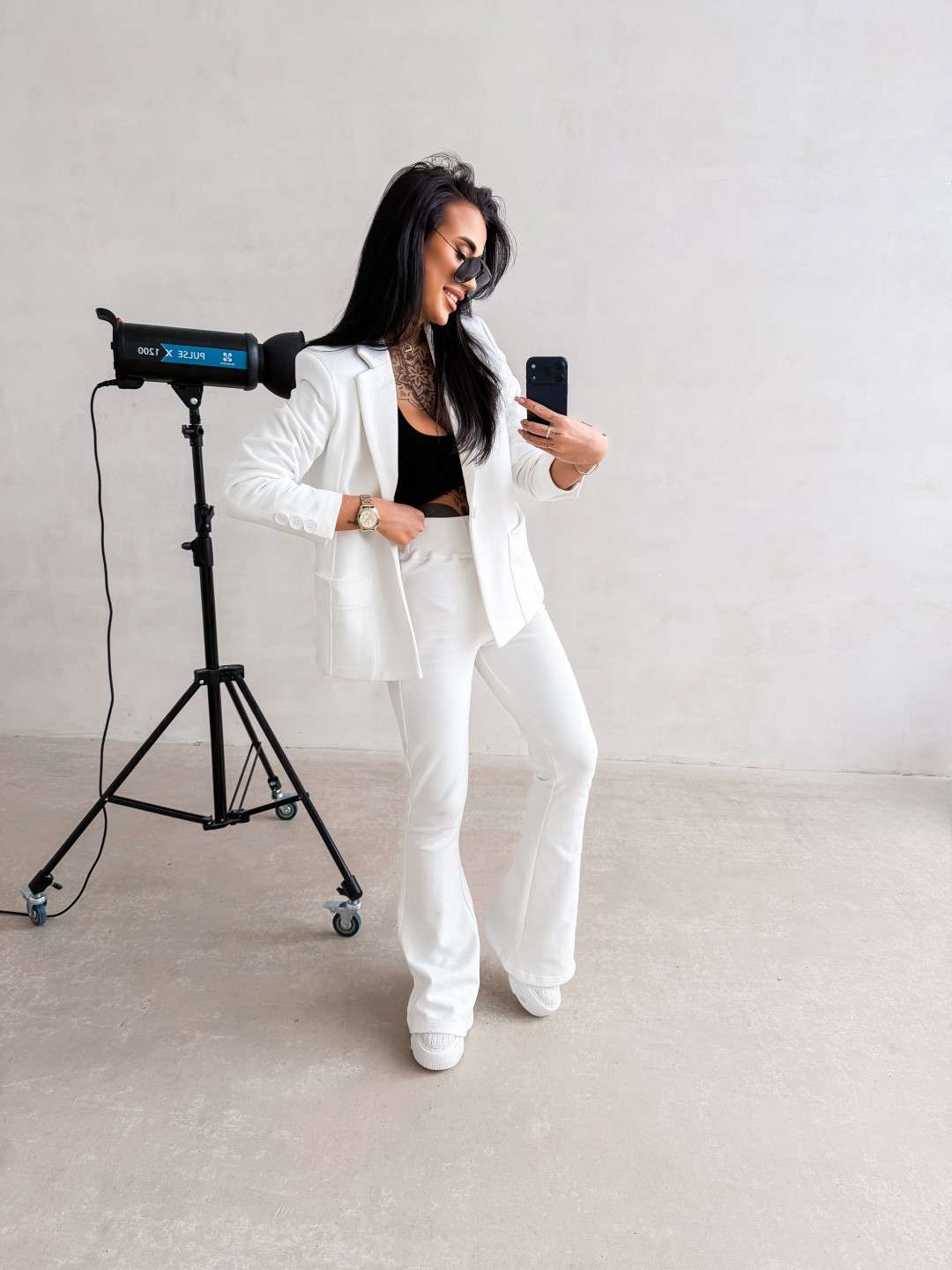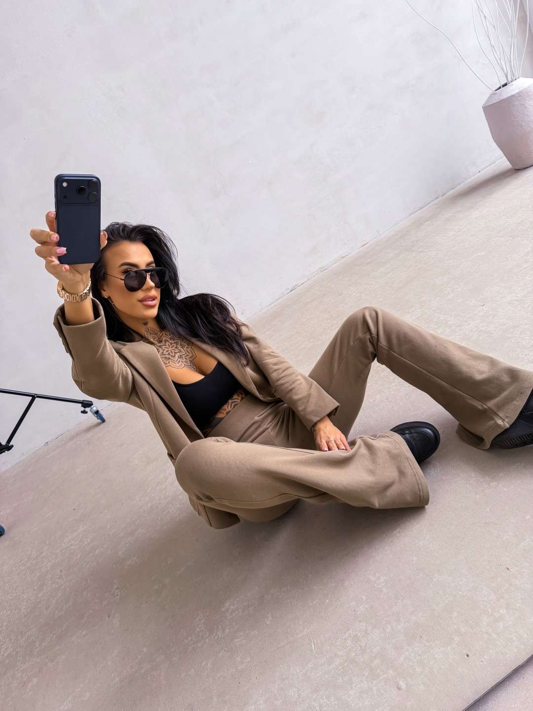 Elegancki komplet o dopasowanym, kobiecym kroju wykonany z wysokiej jakości materiału. Góra – klasyczna marynarka o prostym, lekko taliowanym fasonie z klapami i kieszeniami z przodu. Dół – spodnie z podwyższonym stanem i dopasowaną linią bioder, delikatnie rozszerzane ku dołowi. Na nogawce subtelny z logo marki OLV.