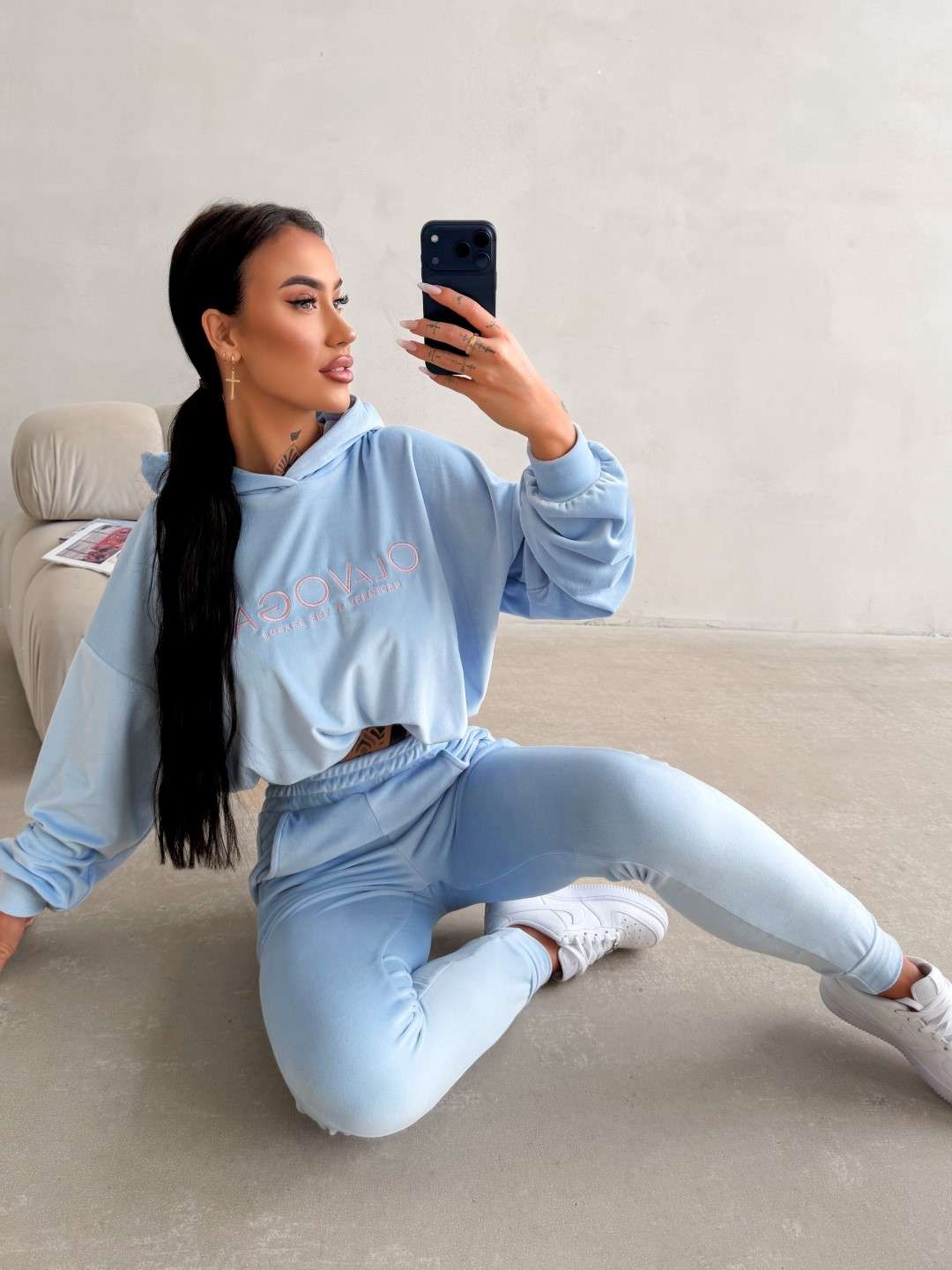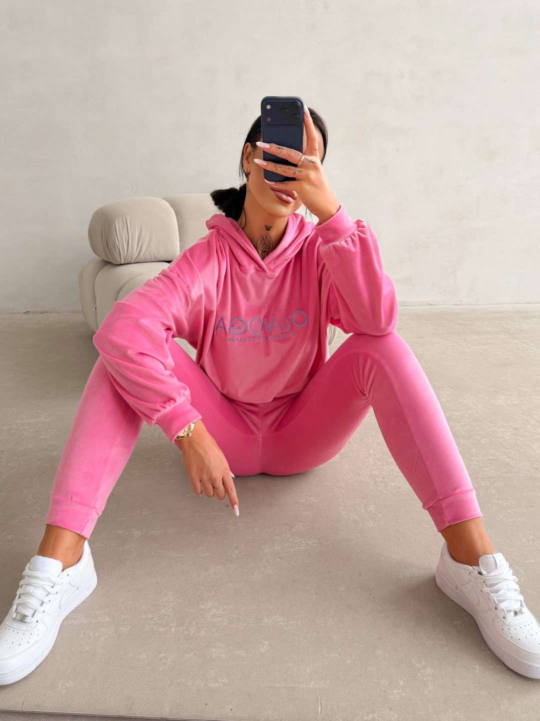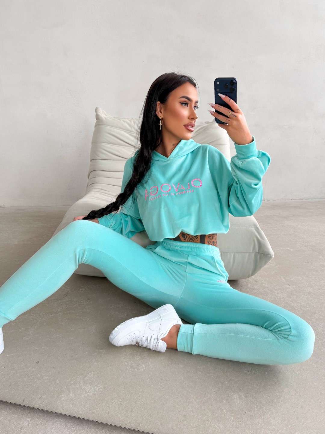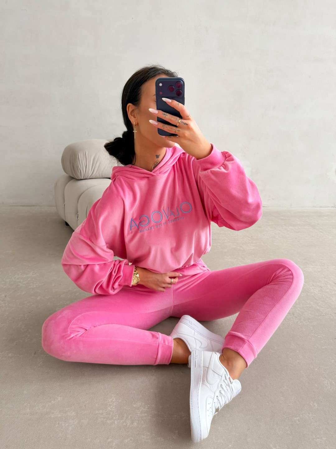 Komplet dresowy o wygodnym, casualowym charakterze wykonany z miękkiej, przyjemnej w dotyku tkaniny. Bluza z kapturem ozdobiona kontrastowym logo marki OLAVOGA oraz spodnie z elastycznym pasem tworzą spójną, komfortową całość na co dzień. Ważne aspekty: wygodny, swobodny krój, miękka, przyjemna w dotyku tkanina, bluza z kapturem i ściągaczem u dołu,