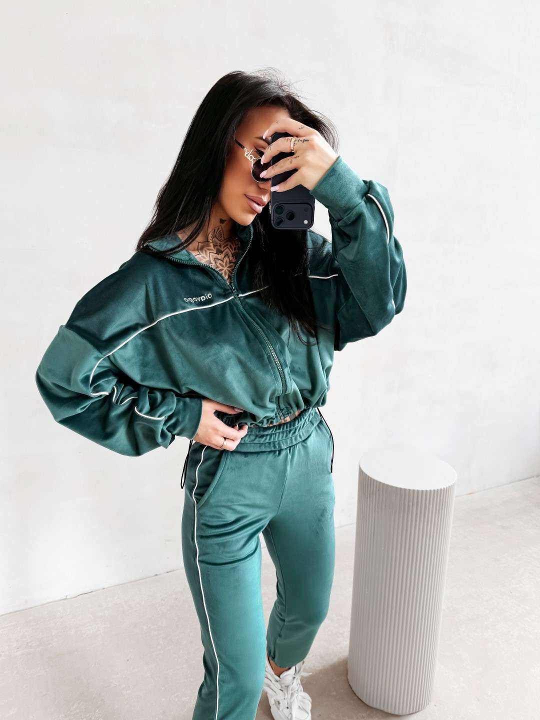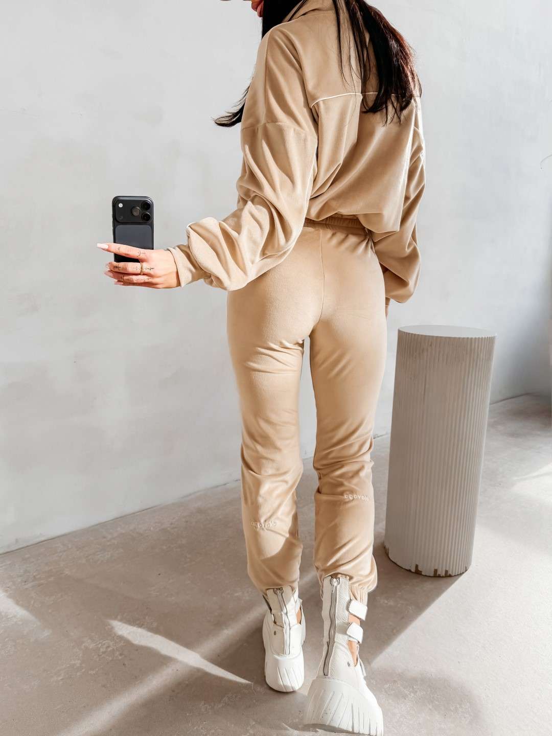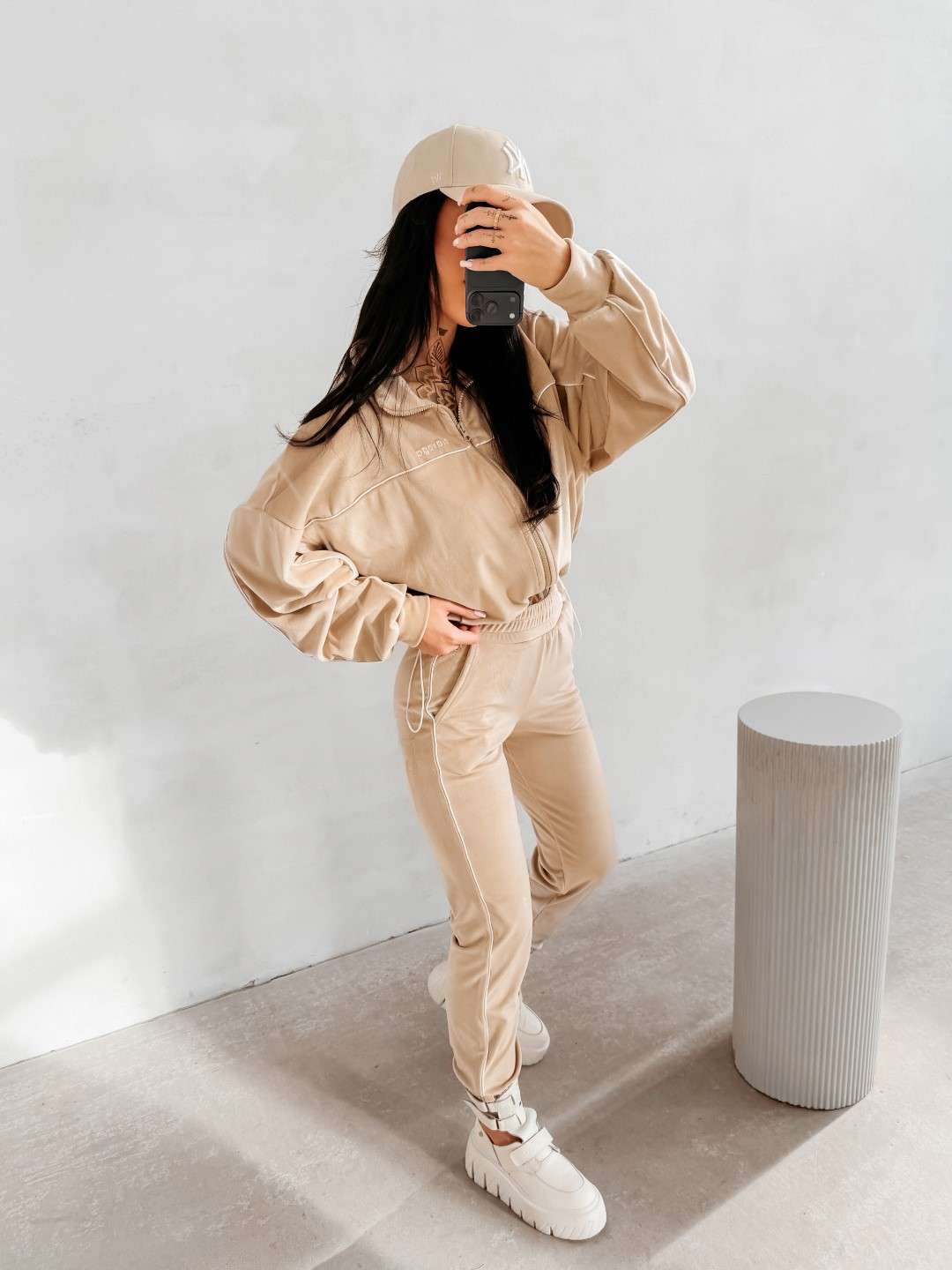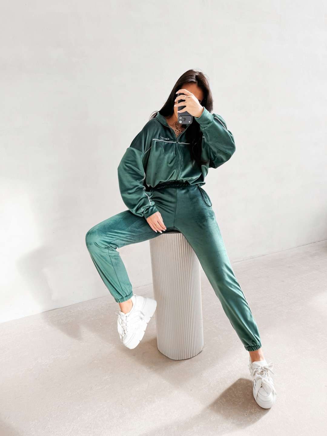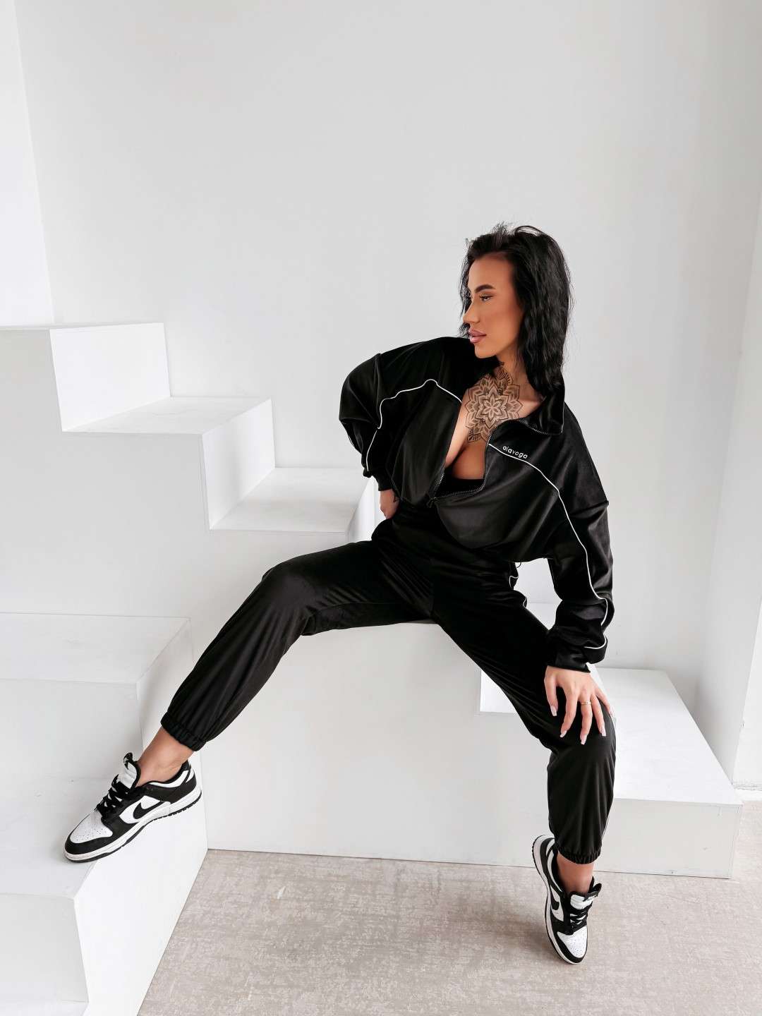 Komplet dresowy wykonany z miękkiej, przyjemnej w dotyku tkaniny. Bluza zapinana na suwak z delikatnymi kontrastowymi przeszyciami i minimalistycznym logo marki OLAVOGA tworzy spójną całość ze spodniami o wygodnym kroju. Ważne aspekty: bluza zapinana na suwak, subtelne kontrastowe lamówki podkreślające linię sylwetki, minimalistyczne logo OLAVOGA na bluzie,