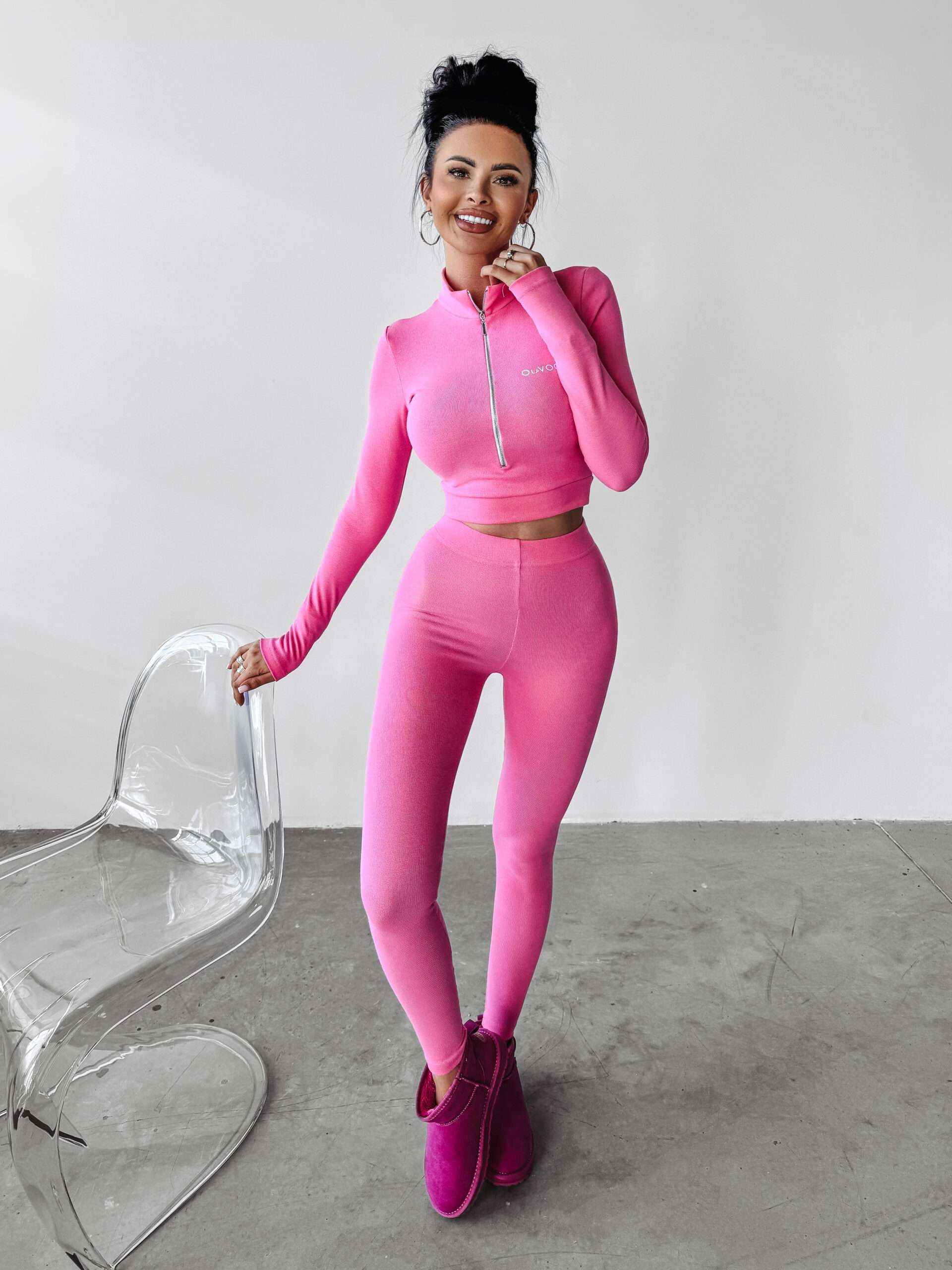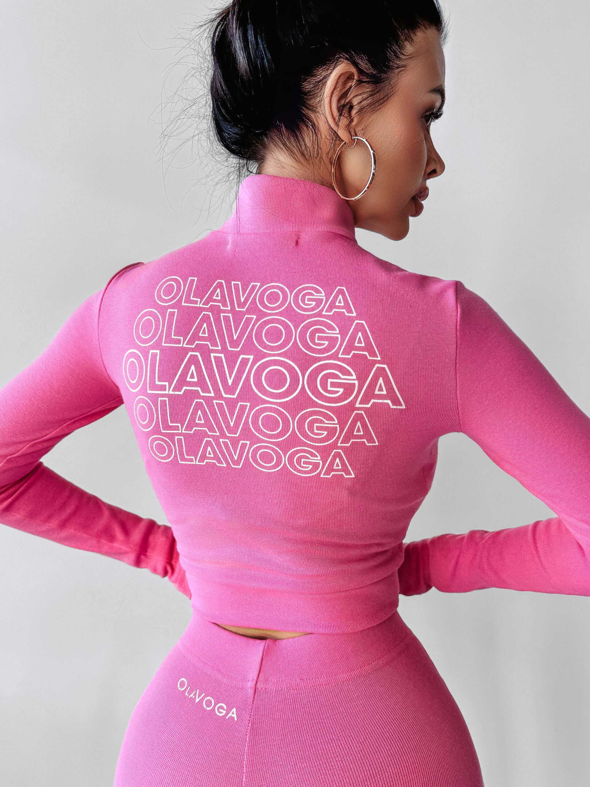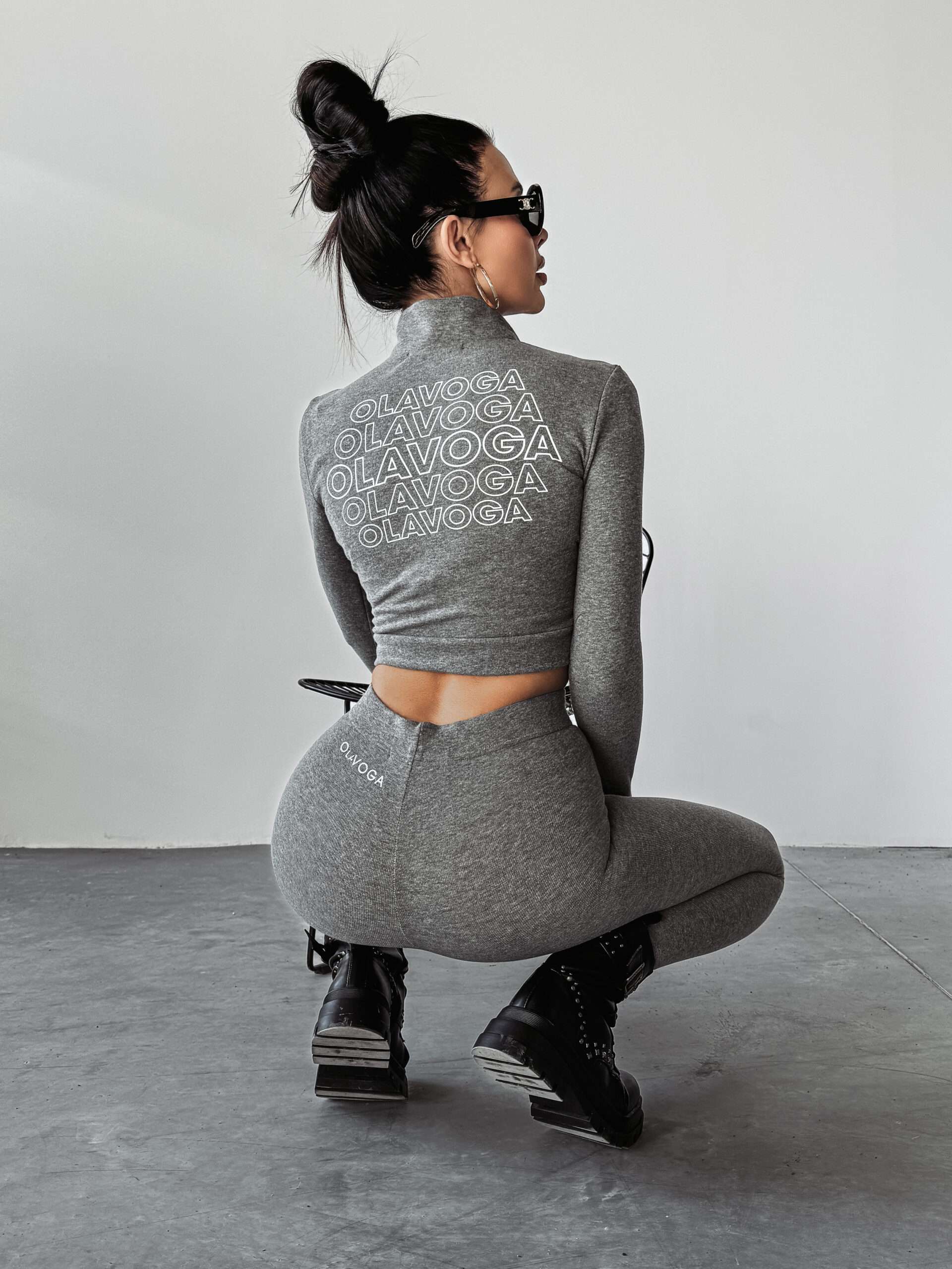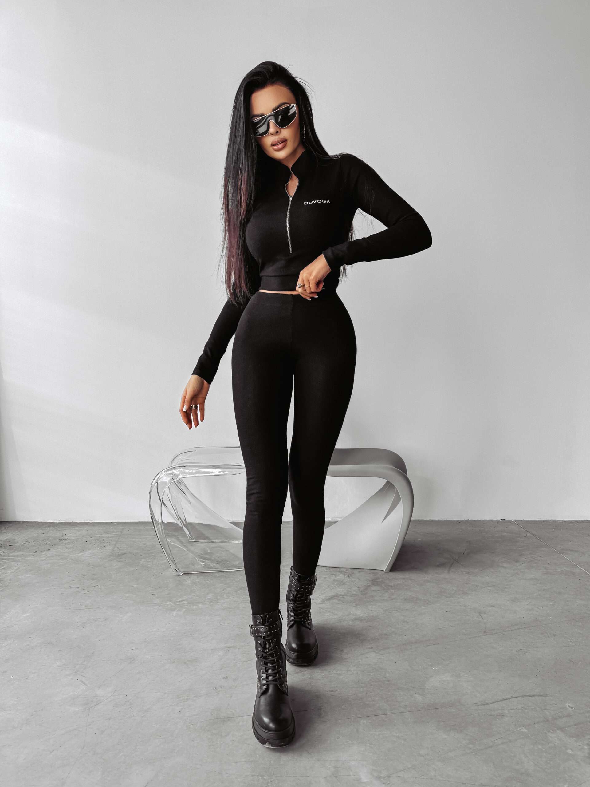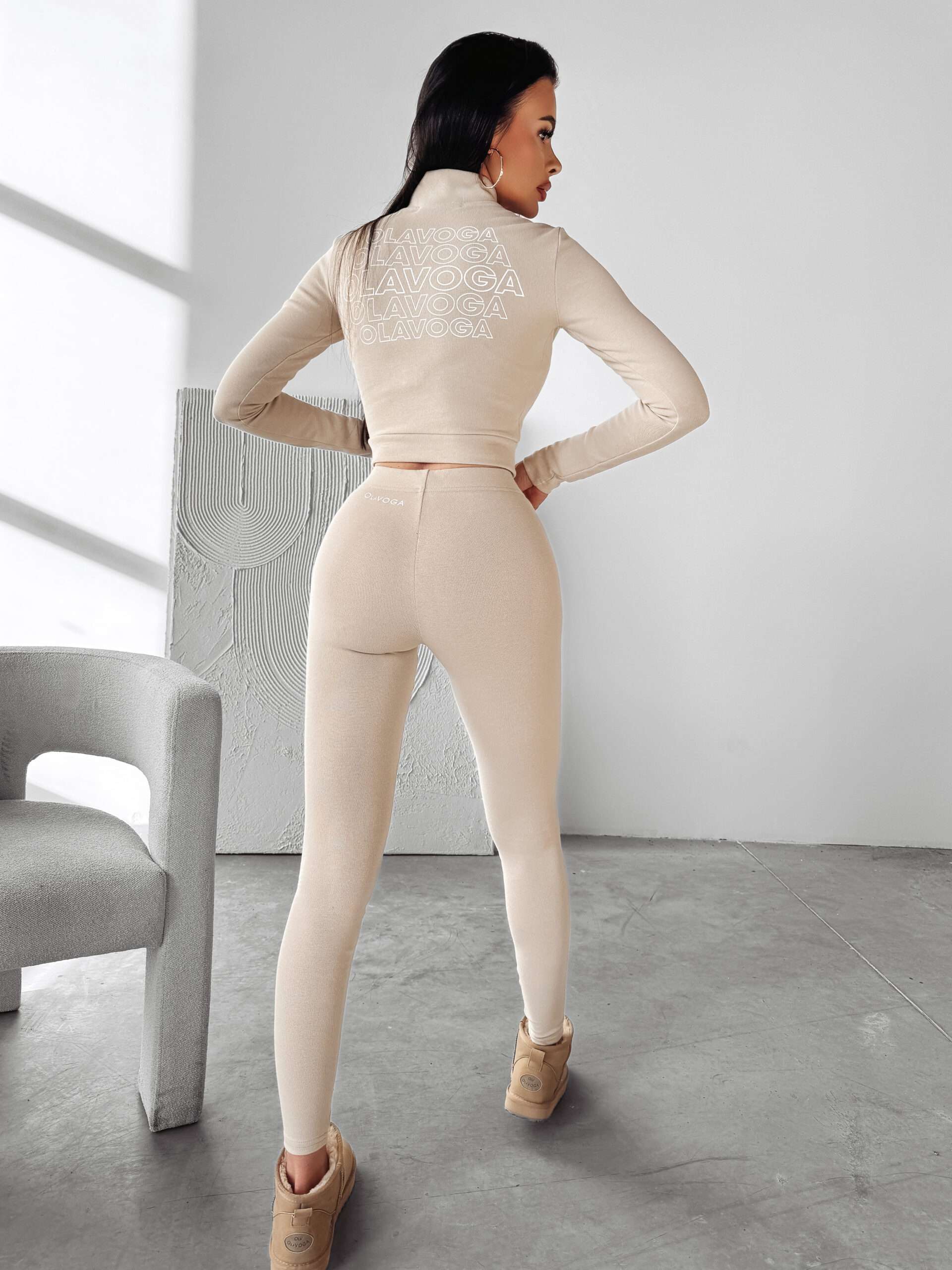 Idealnie przylegający komplet, wykonany z wysokiej jakości elastycznej bawełny. Góra -bluzka o krótszym kroju z długim rękawem. Posiada suwak, dzięki któremu można regulowaćdekolt. Na przodzie logo marki OLAVOGA. Tył posiada logo brandu w ciekawym princie. Dół – legginsy z wysokim stanem. Logo marki OLAVOGA na tyle produktu.