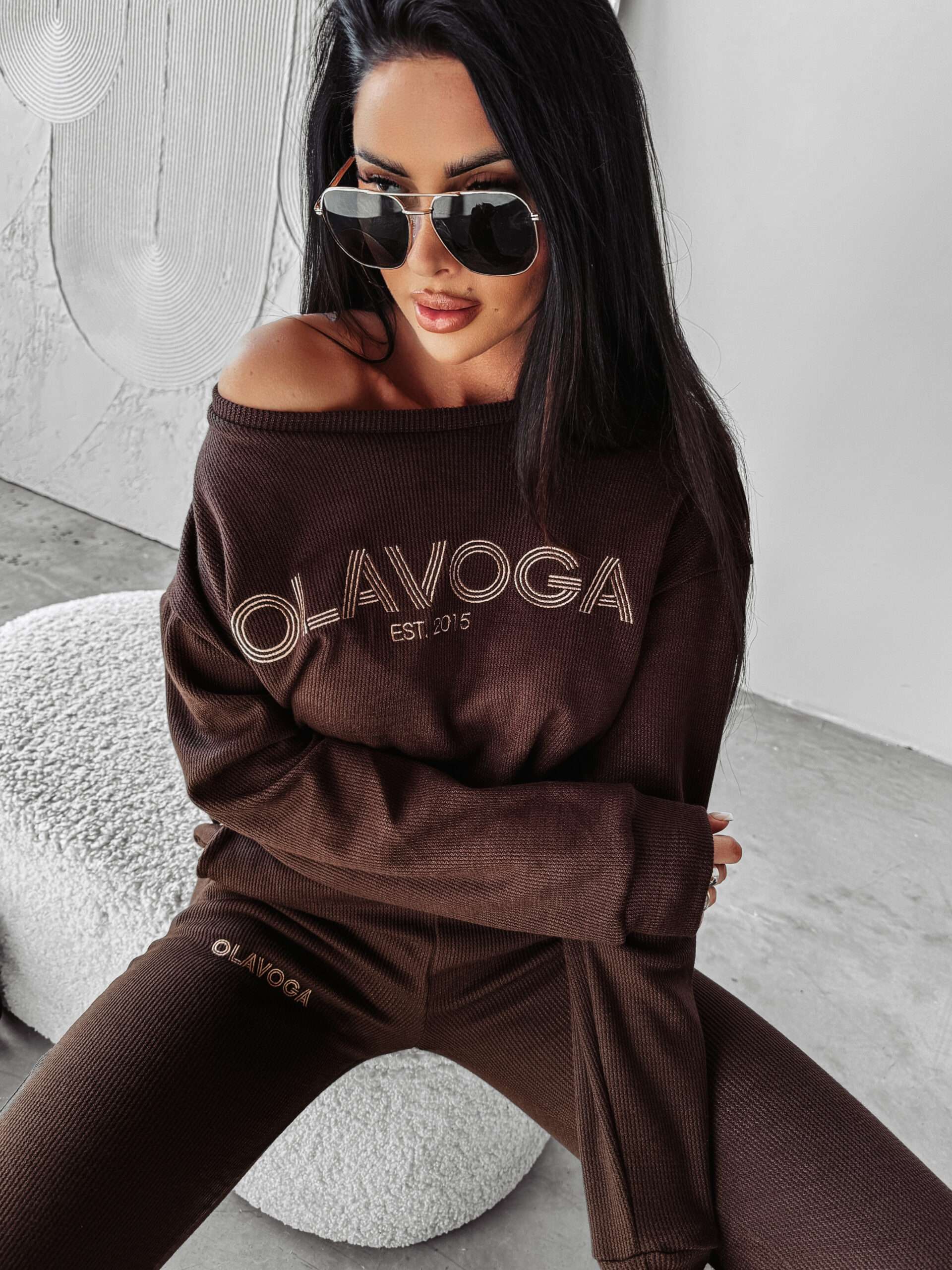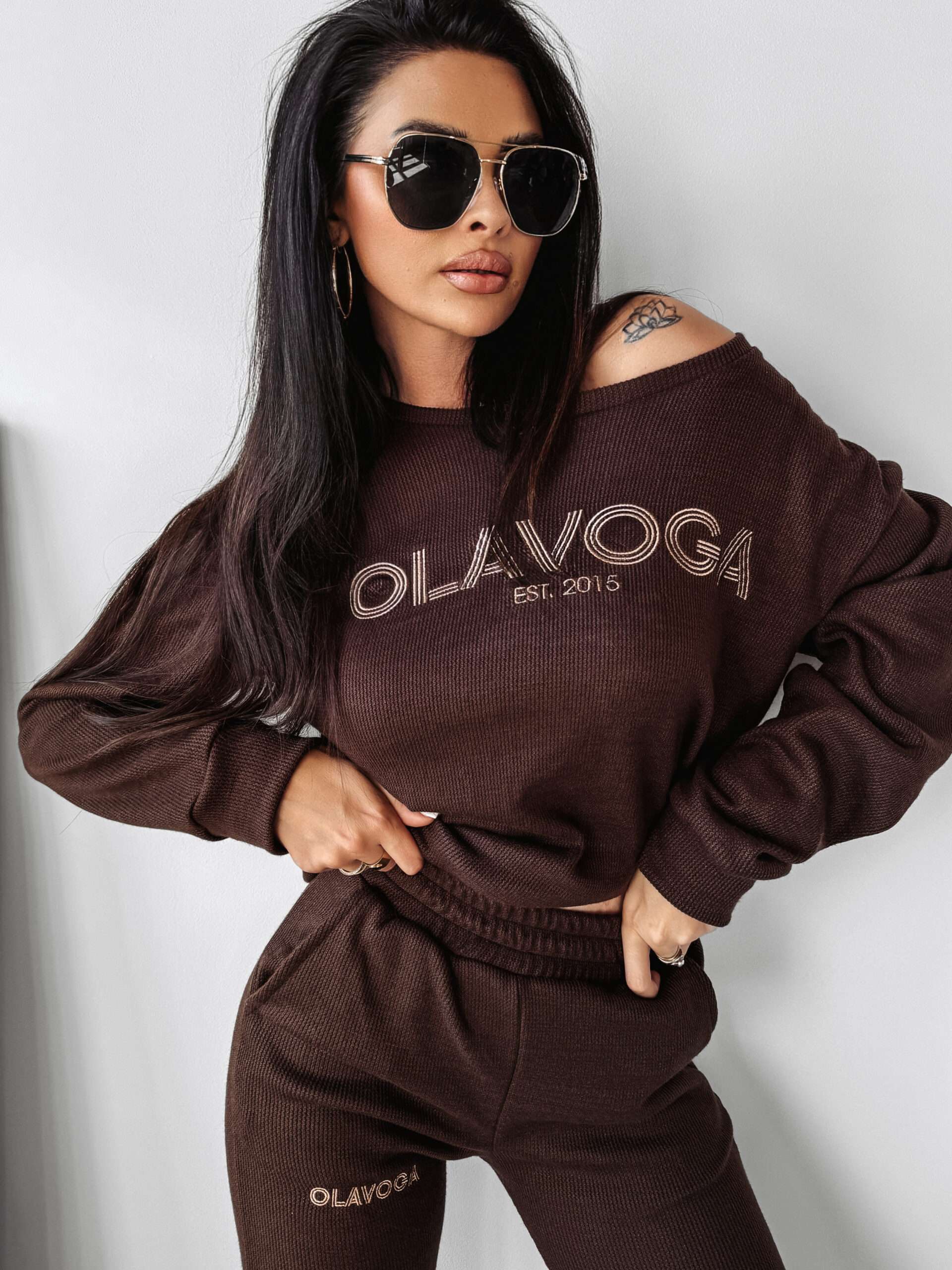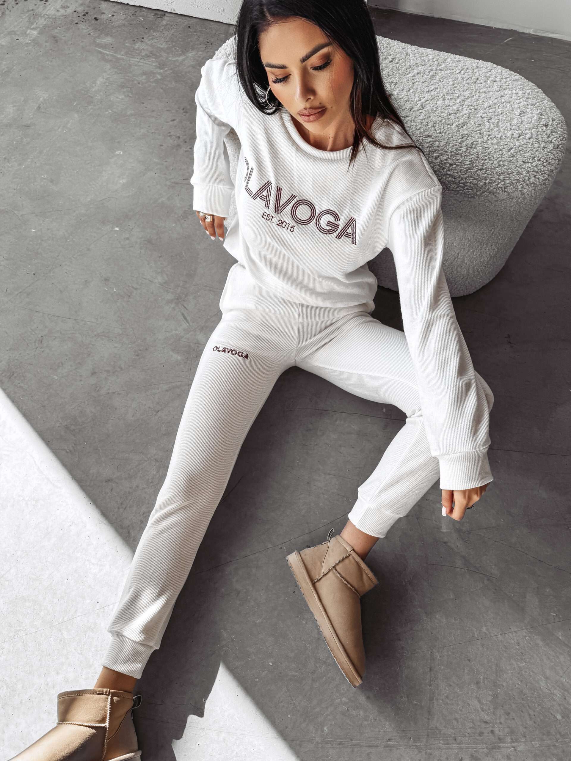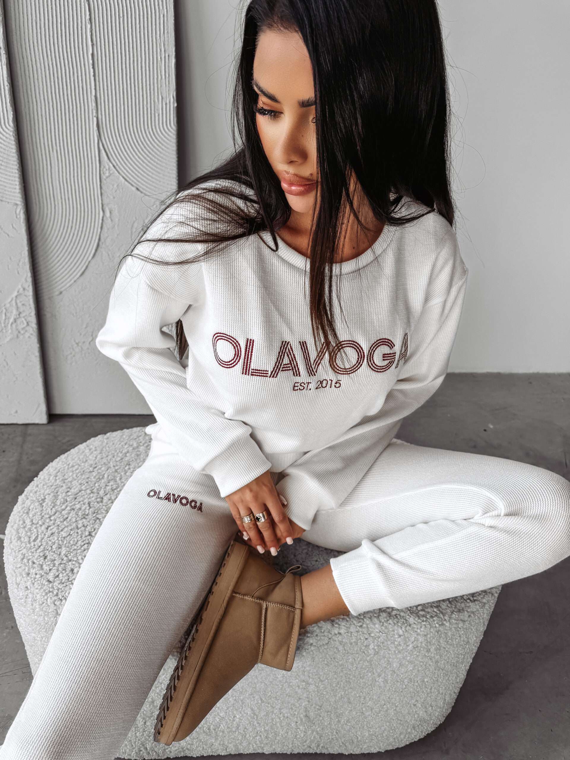 Komplet damski wykonany z wysokiej jakości dzianiny swetrowej. Góra – delikatnie oversiz’owy sweter. Na przodzie haft z logo marki OLAVOGA z napisem EST 2015. Dół – spodnie ze ściągaczami. Po bokach kieszenie. Na przodzie haft z logo brandu.