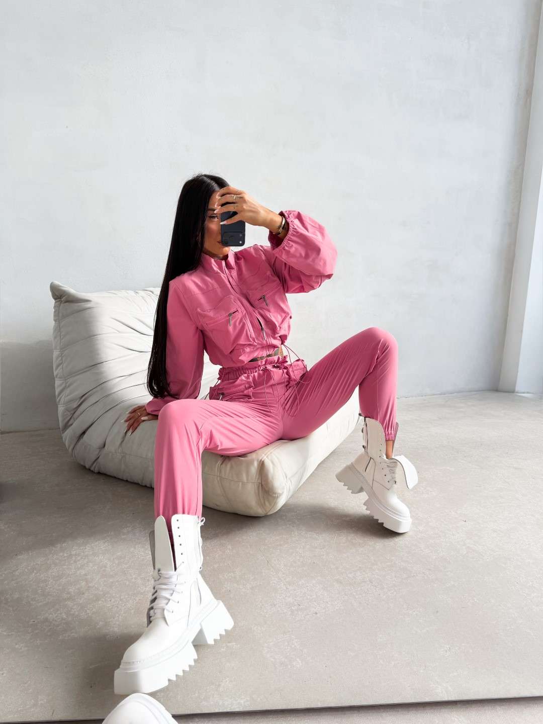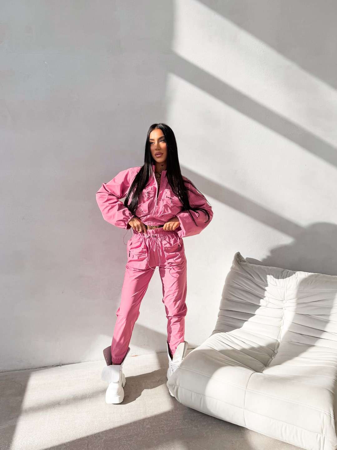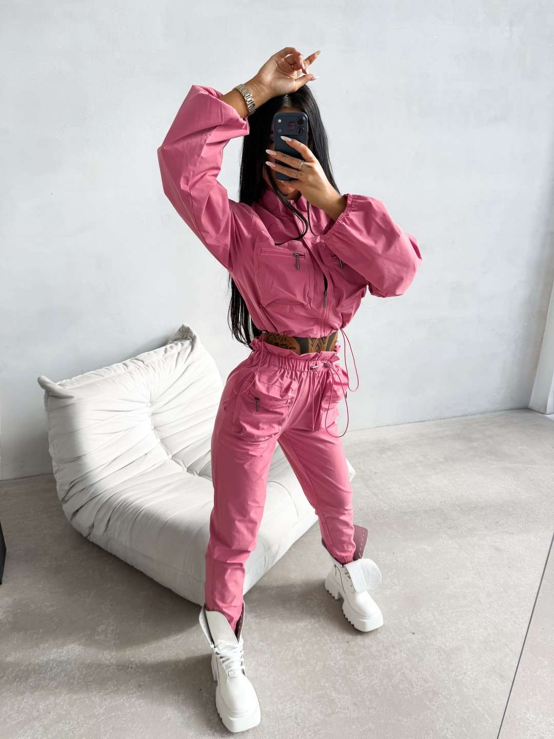 Dwuczęściowy komplet wykonany z lekkiej tkaniny. Krótka kurtka zapinana na suwak z wysoką stójką oraz kieszeniami na przodzie zapinanymi na suwak. Spodnie z elastyczną talią regulowaną troczkami, wyposażone w kieszenie z przodu oraz dodatkowe kieszenie z klapkami. Nogawki zakończone ściągaczami.