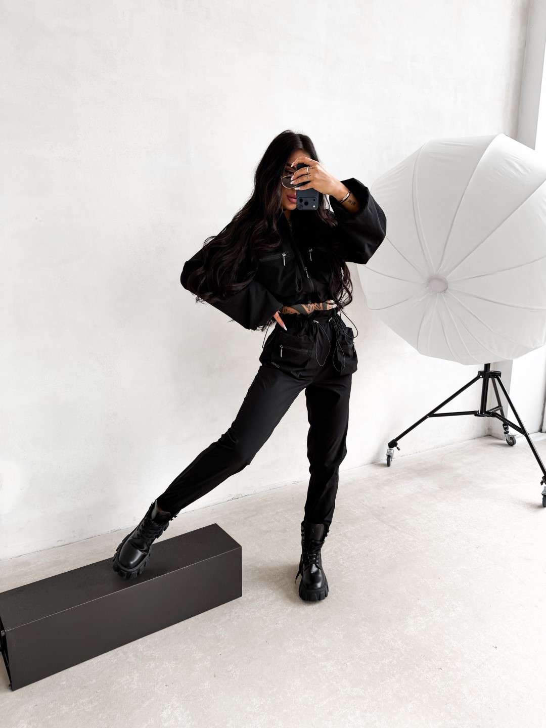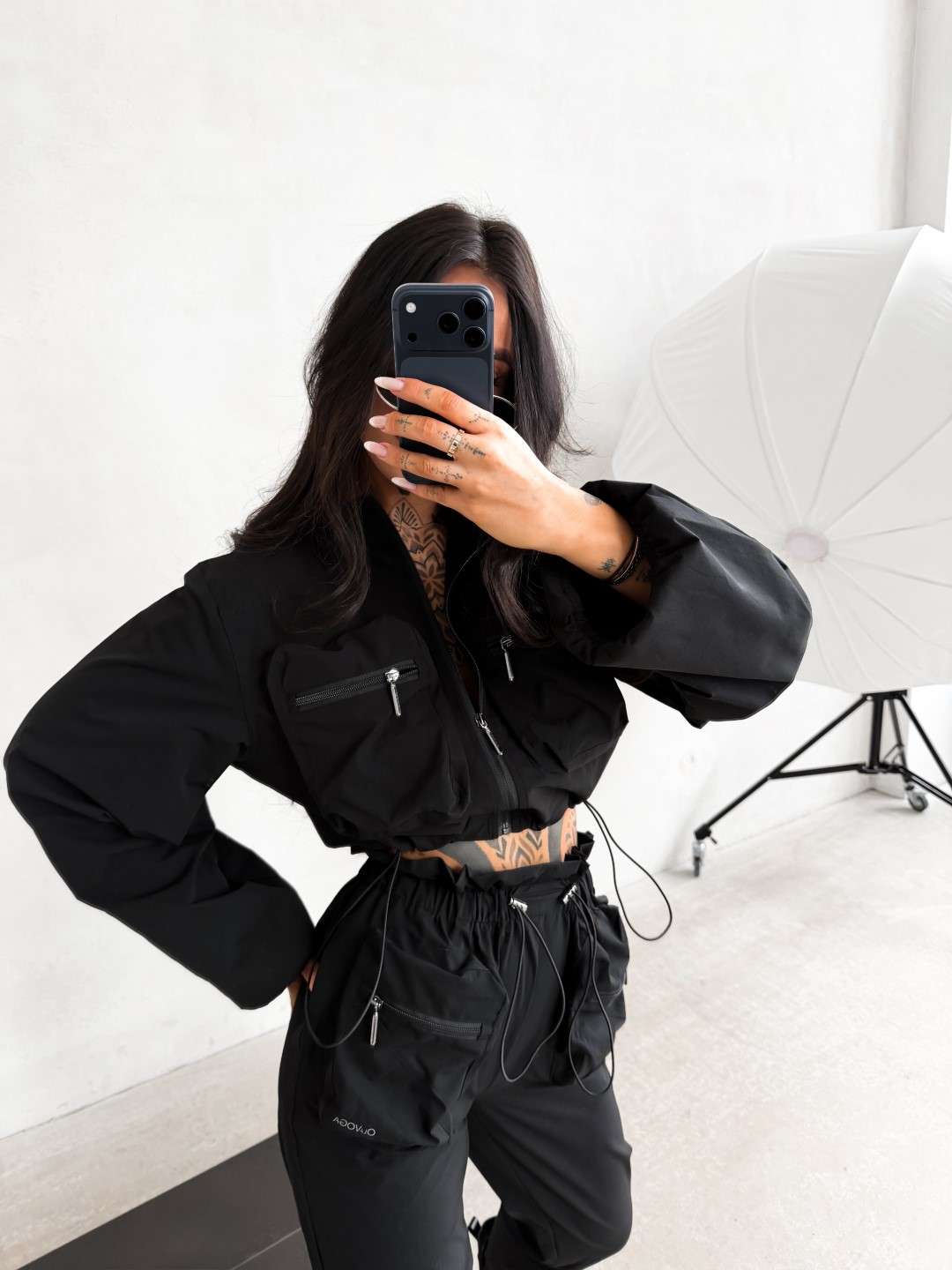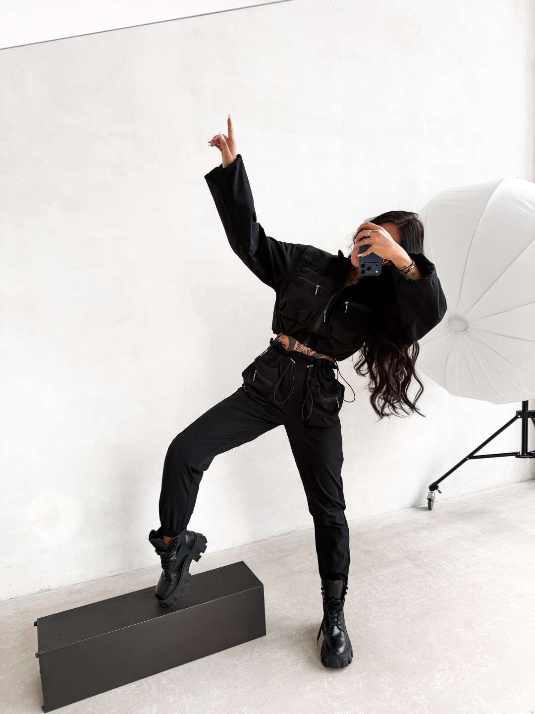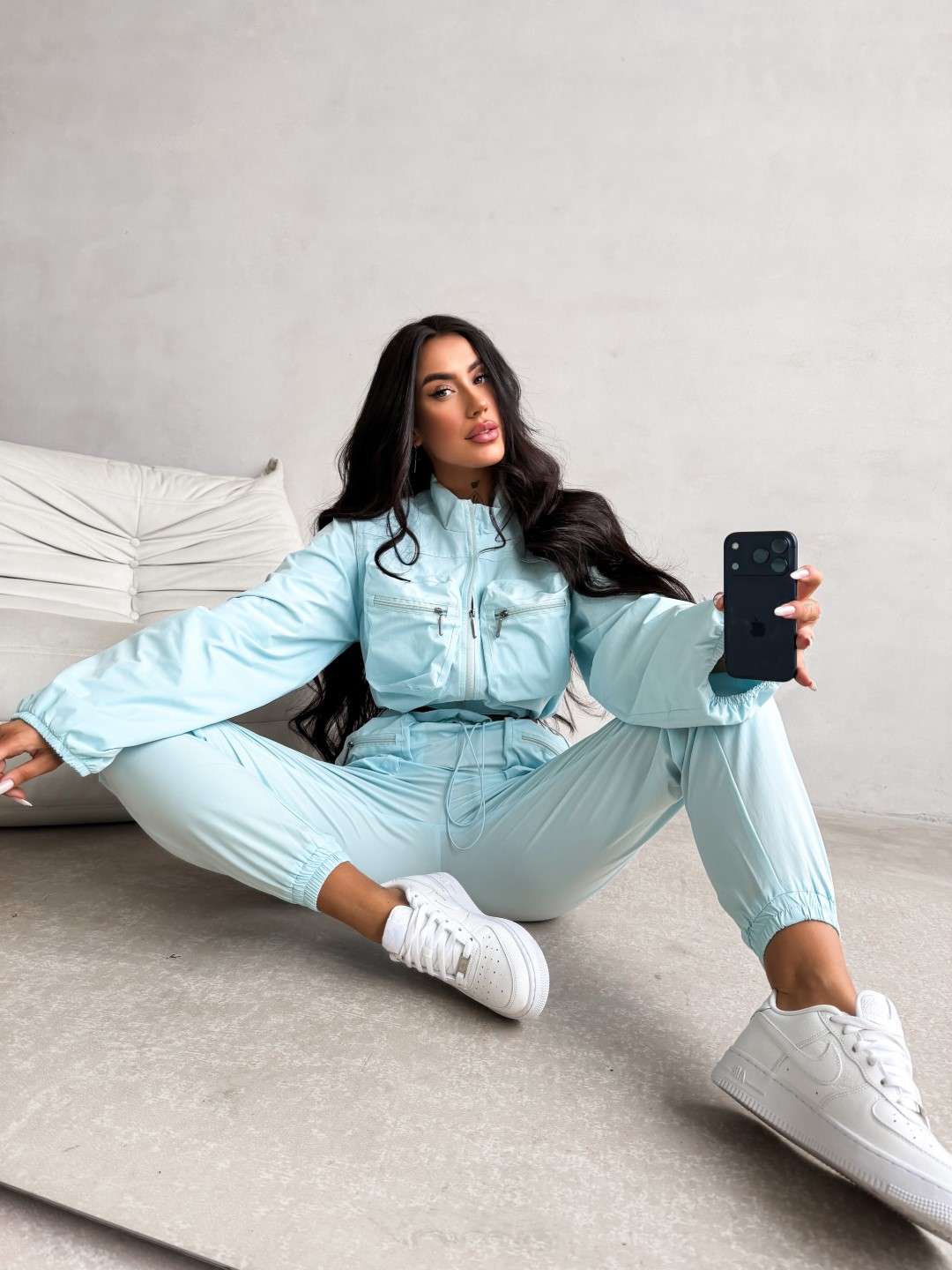 Dwuczęściowy komplet wykonany z lekkiej tkaniny. Krótka kurtka zapinana na suwak z wysoką stójką oraz kieszeniami na przodzie zapinanymi na suwak. Spodnie z elastyczną talią regulowaną troczkami, wyposażone w kieszenie z przodu oraz dodatkowe kieszenie z klapkami. Nogawki zakończone ściągaczami.