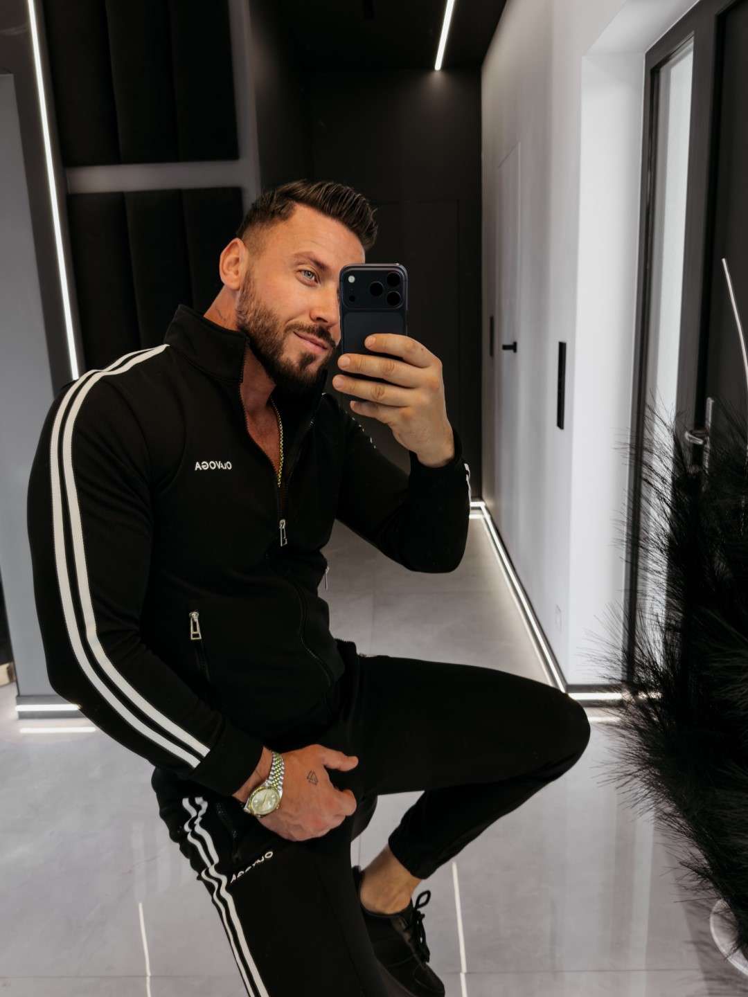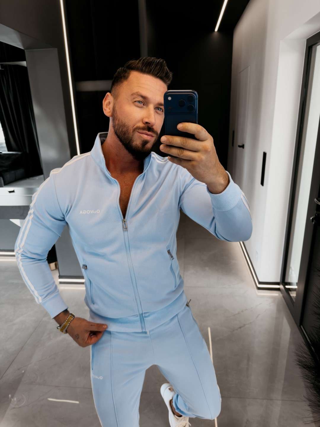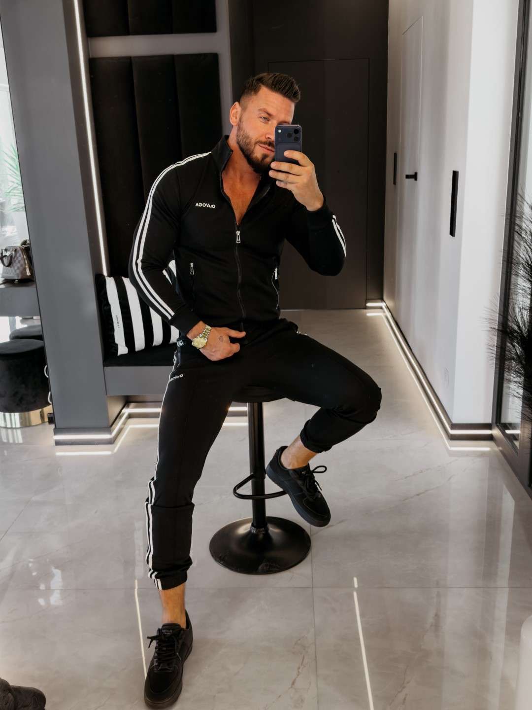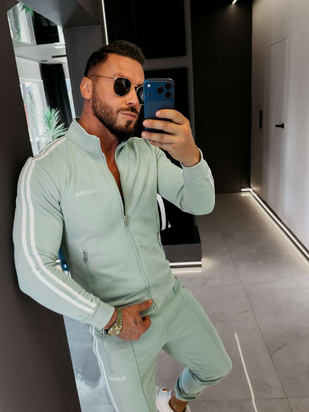 Komplet składający się z bluzy zapinanej na zamek oraz spodni. Bluza z wysokim kołnierzem, kieszeniami na zamek i logo OLAVOGA.