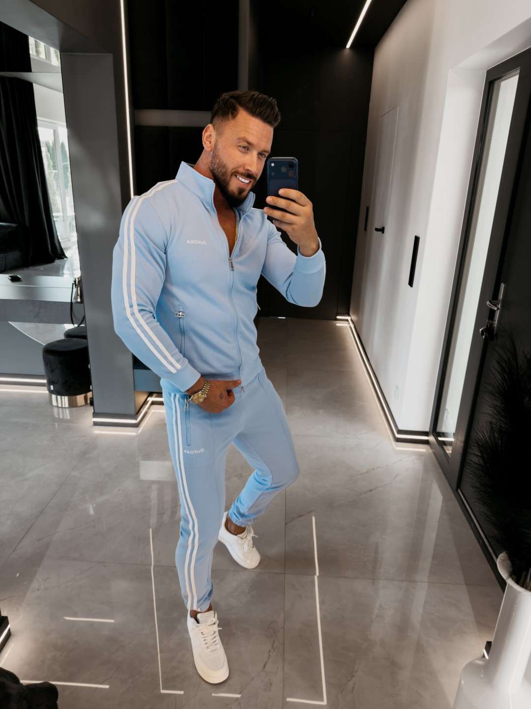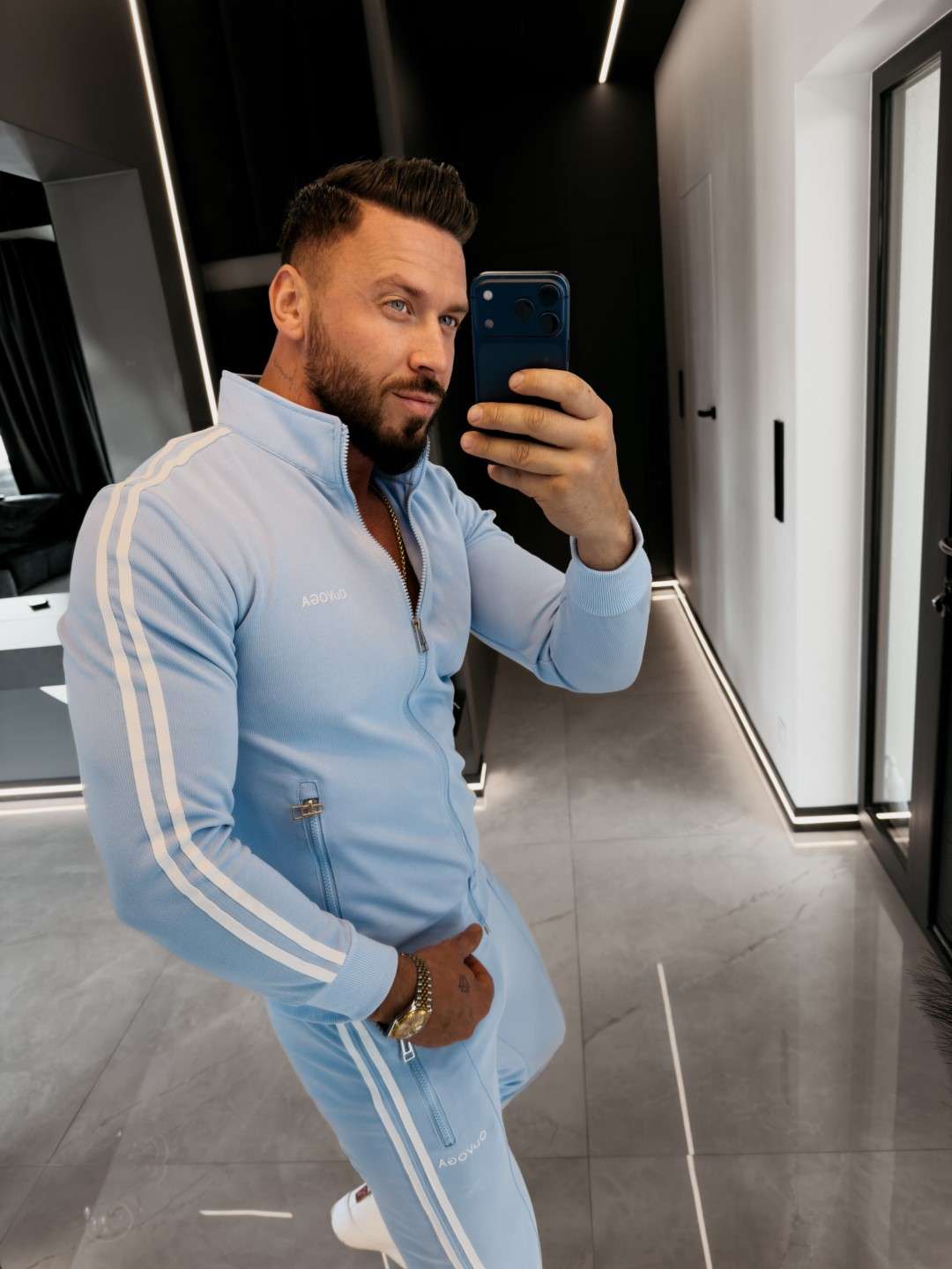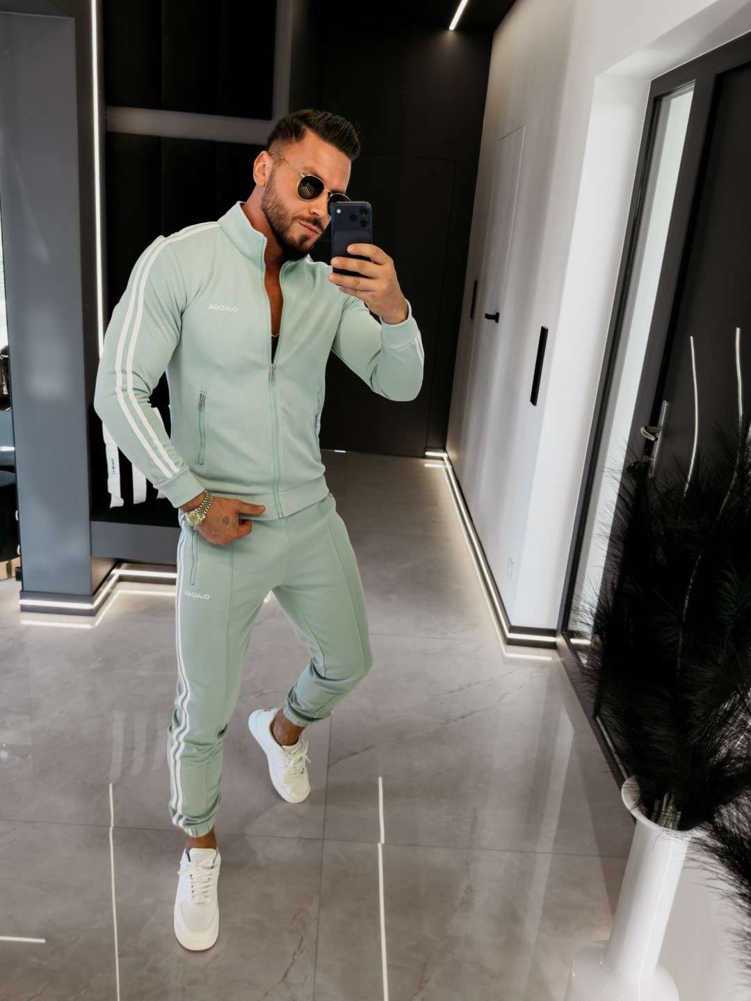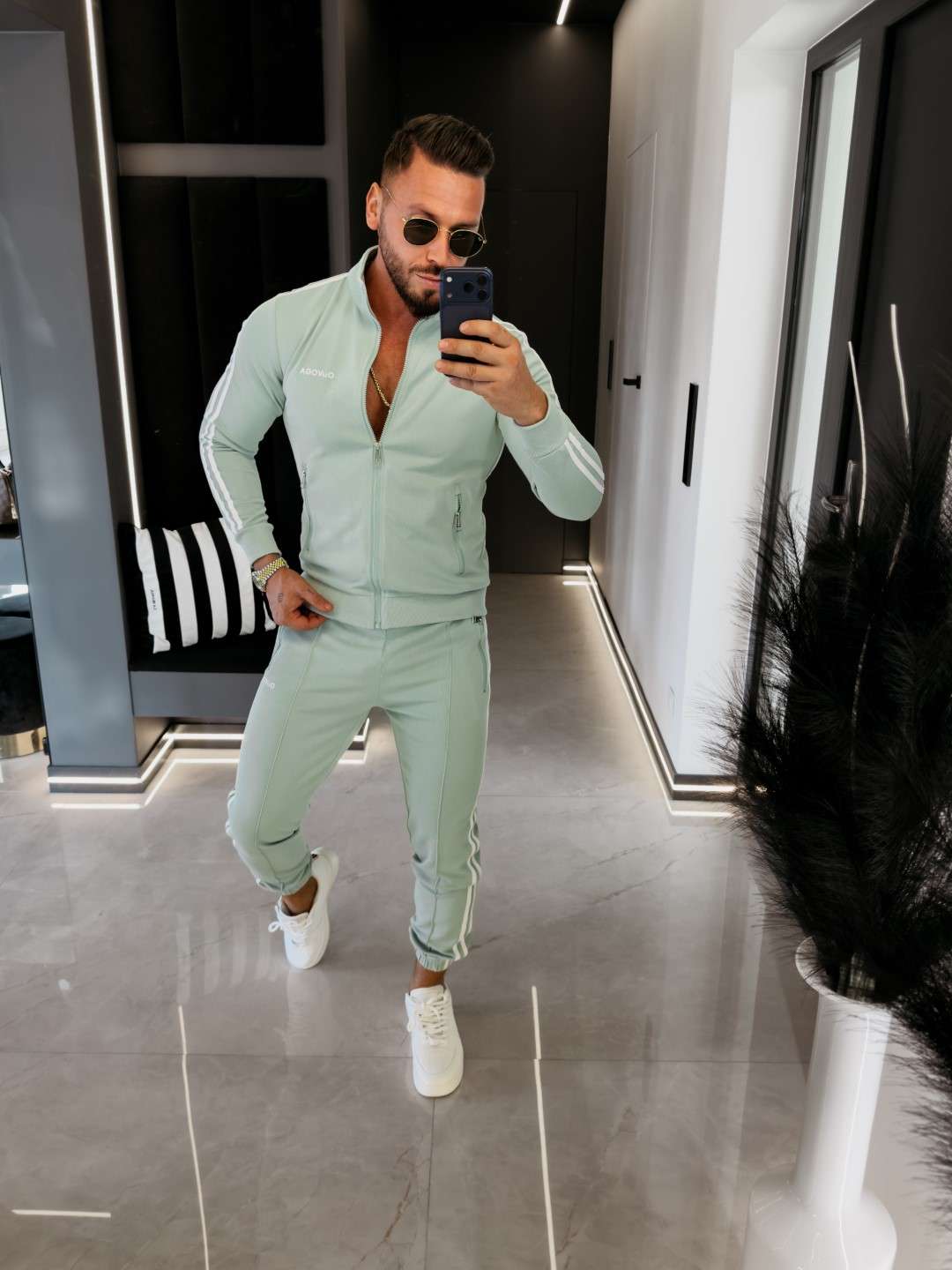 Komplet składający się z bluzy zapinanej na zamek oraz spodni. Bluza z wysokim kołnierzem, kieszeniami na zamek i logo OLAVOGA.