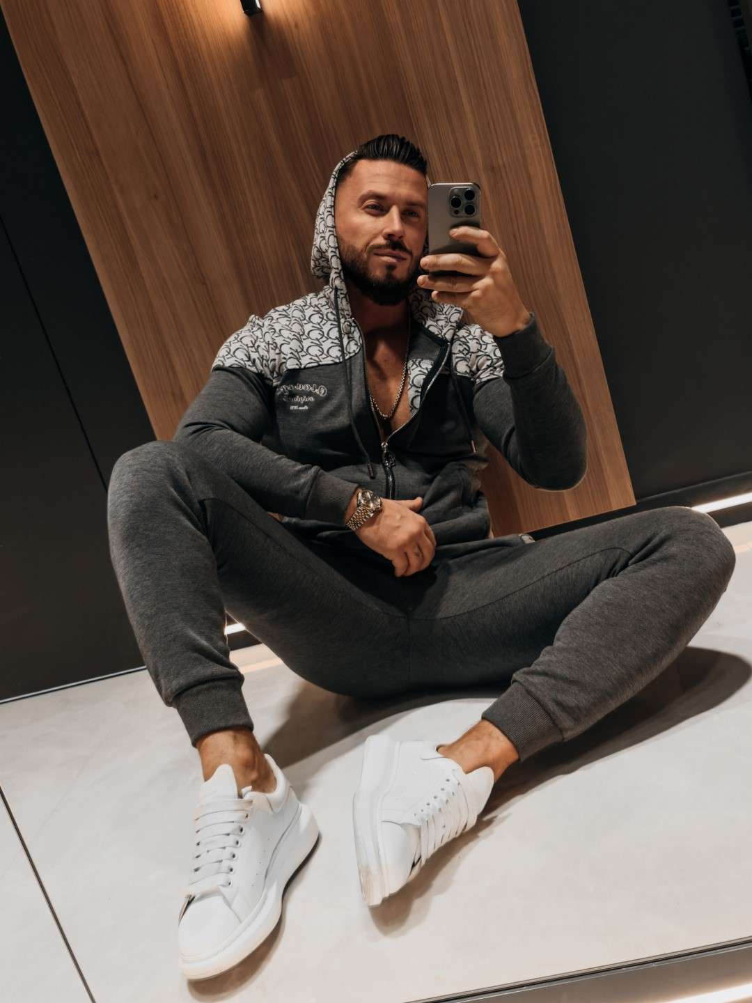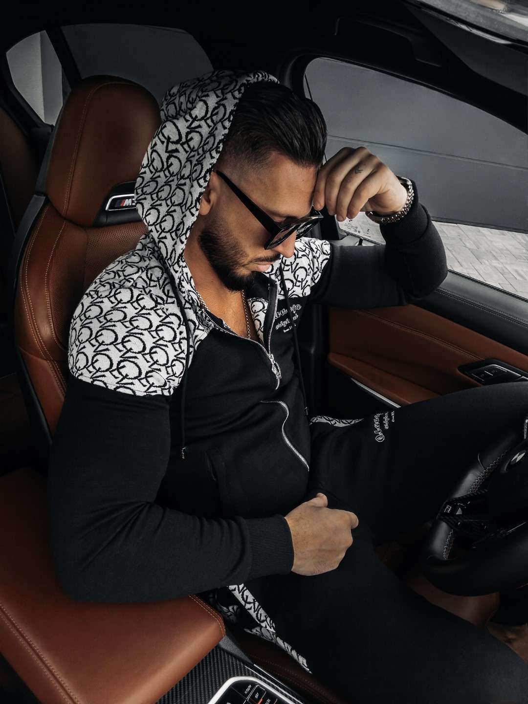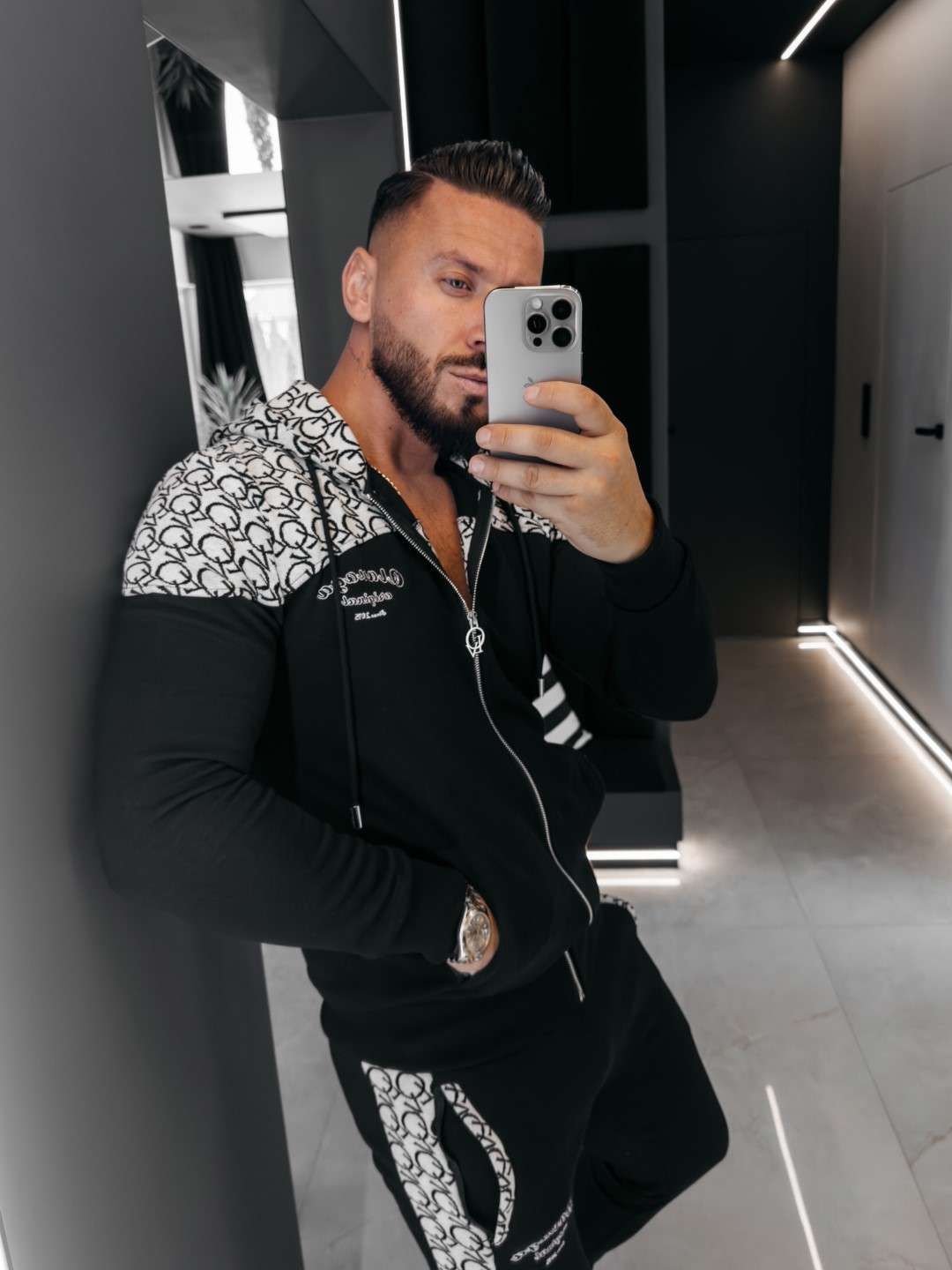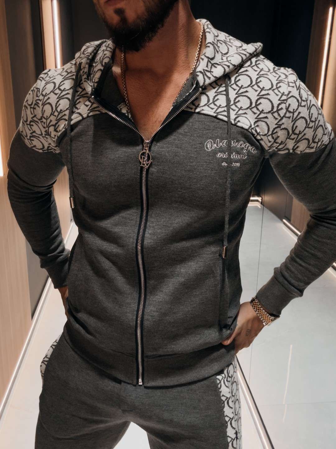 Komplet sportowy, wykonany z wysokiej jakości materiału z domieszką wiskozy. Góra – rozpinana bluza z kapturem oraz z rozpinanymi kieszeniami po bokach. Produkt posiada ciekawe zdobienie – dodatkowy logowany materiał u góry.
