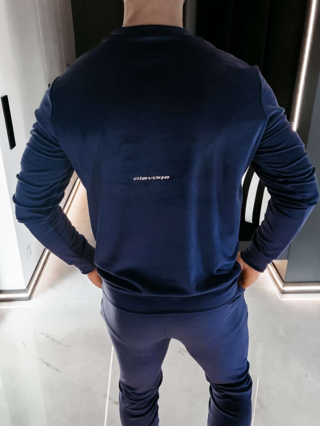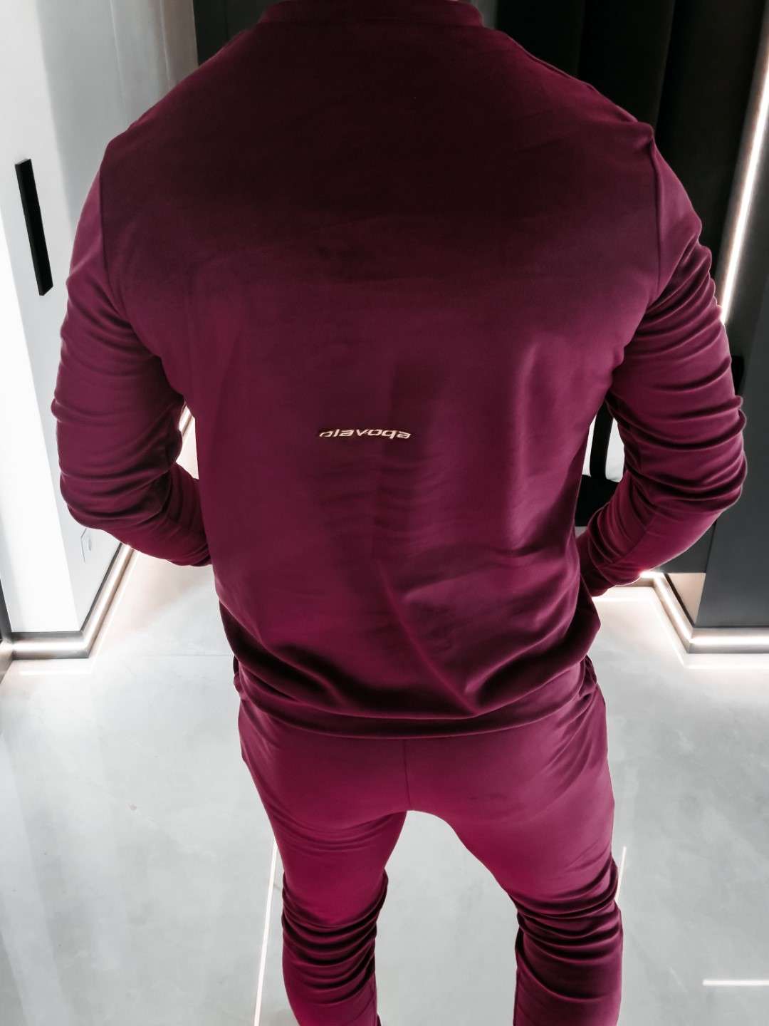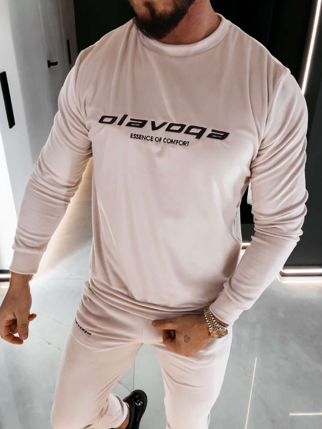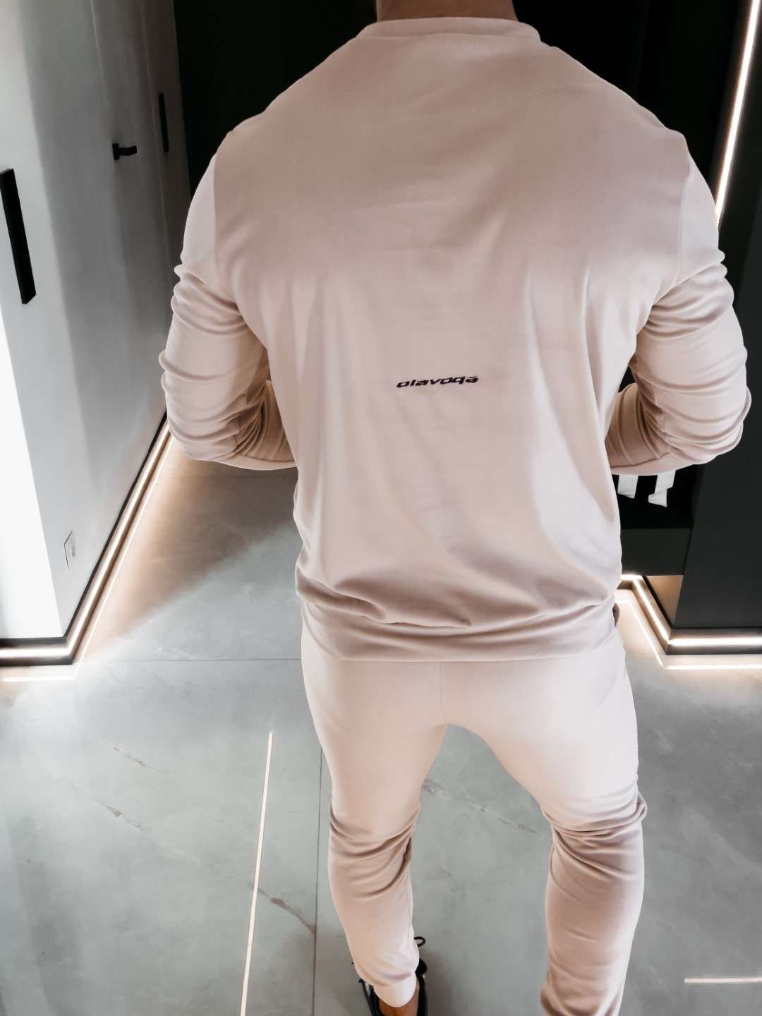 Komplet z elastycznego weluru składający się z spodni oraz bluzy. Okrągły dekolt. Rękawy, nogawki, pas w spodniach, dół bluzy zakończone ściągaczem. Na przodzie Logo marki z hasłem.