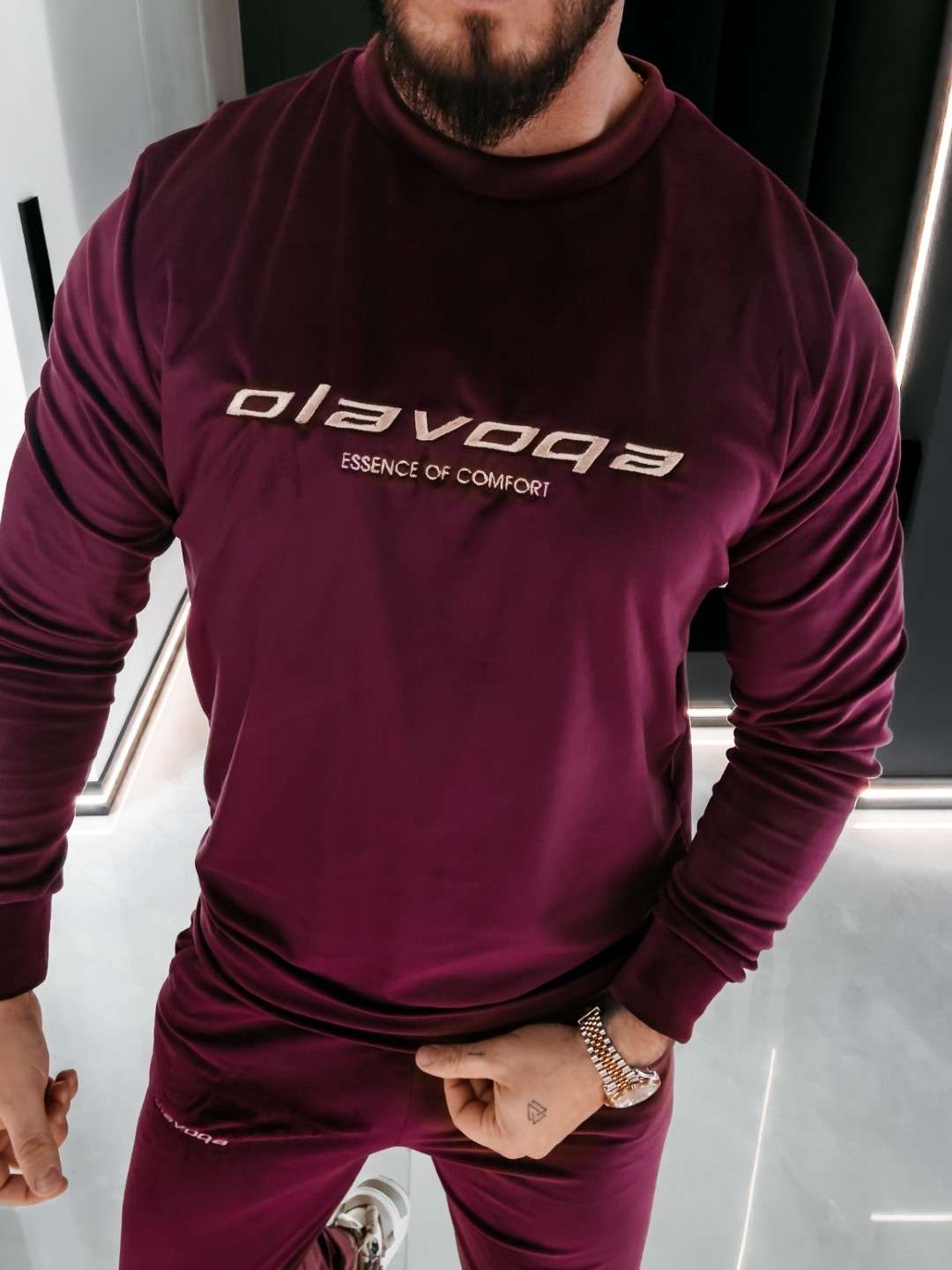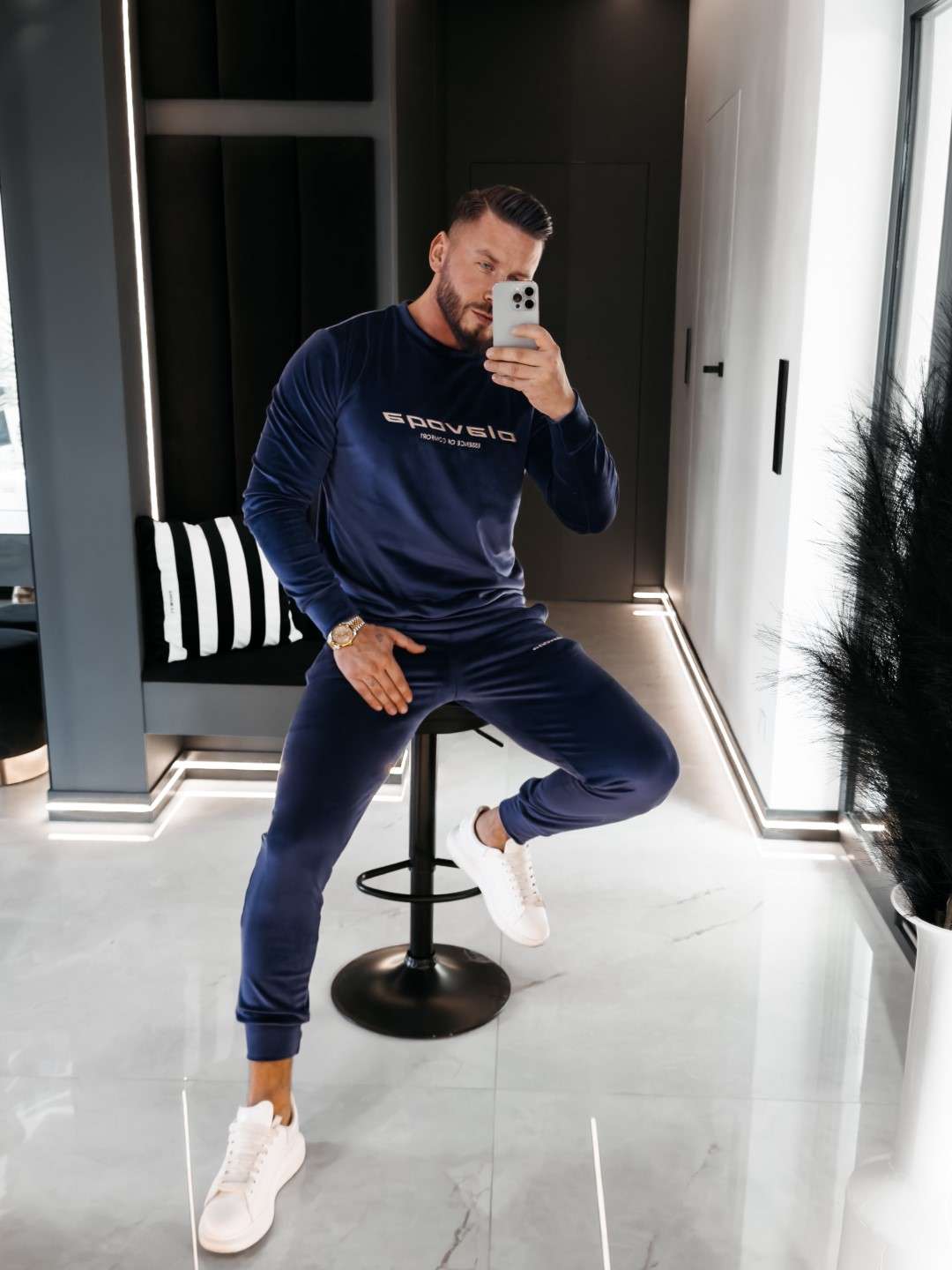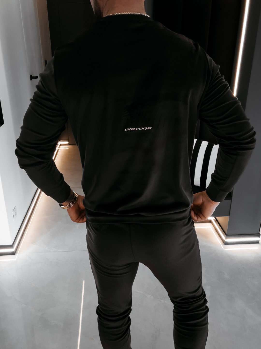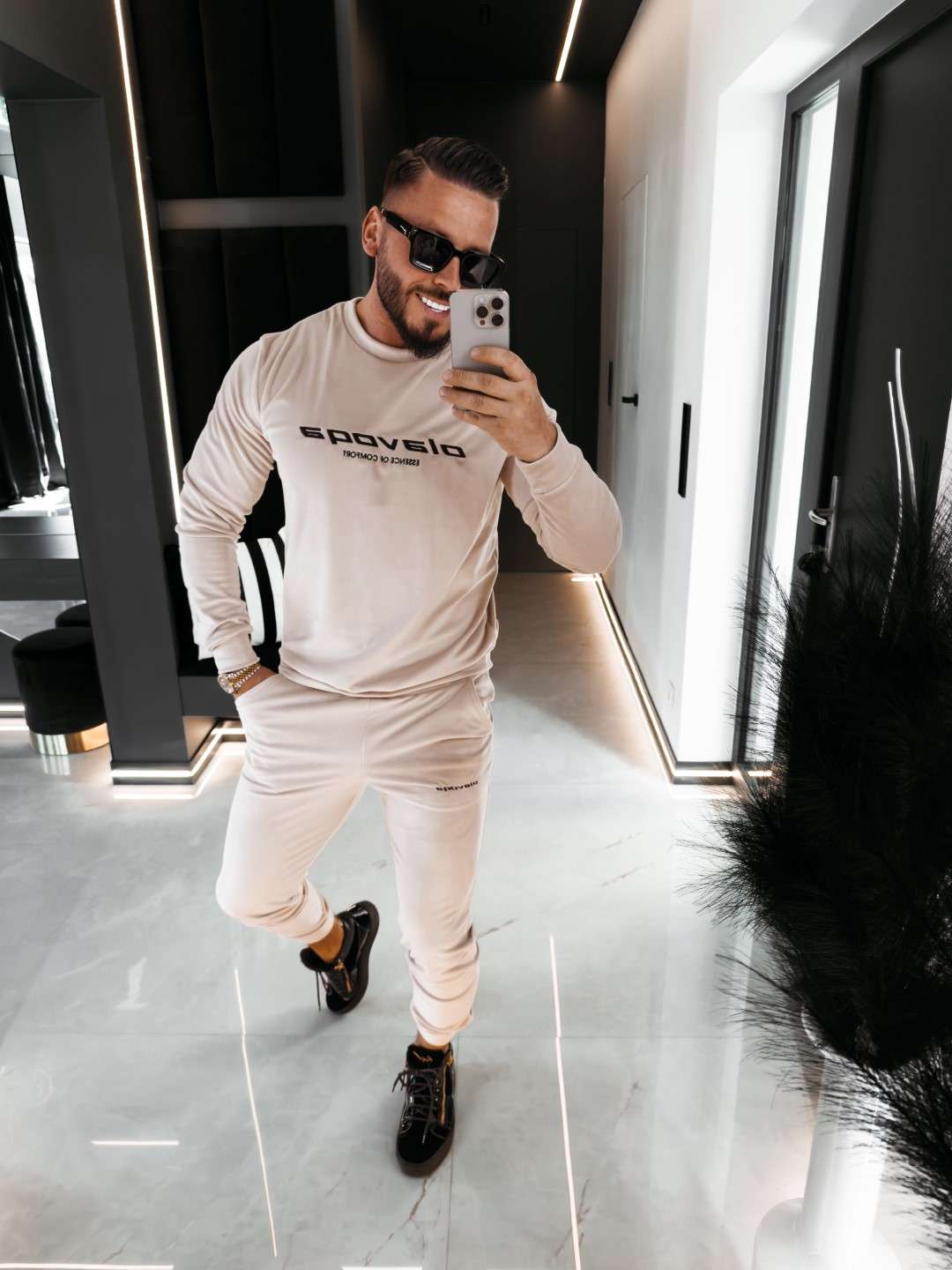 Komplet z elastycznego weluru składający się z spodni oraz bluzy. Okrągły dekolt. Rękawy, nogawki, pas w spodniach, dół bluzy zakończone ściągaczem. Na przodzie Logo marki z hasłem.