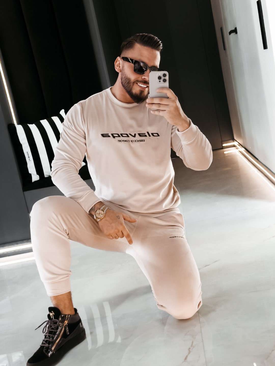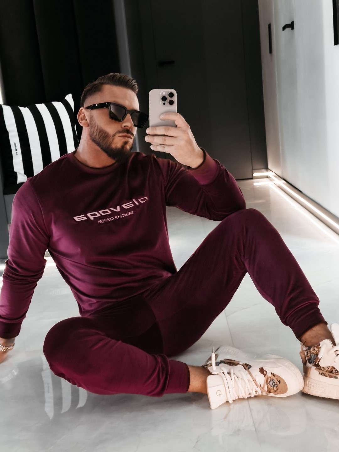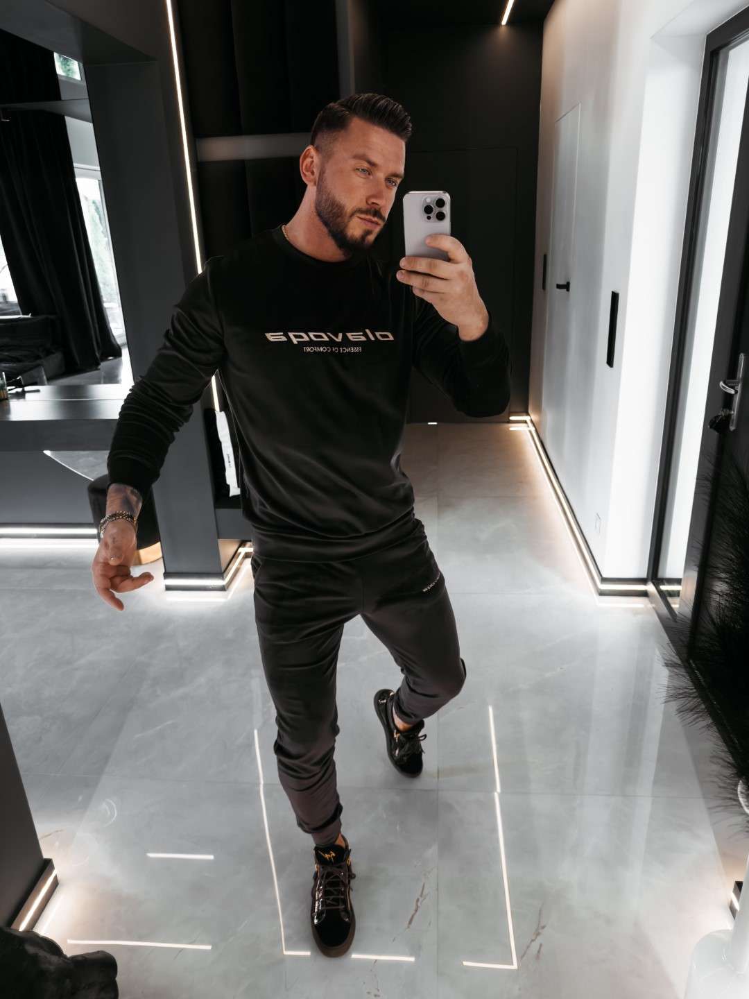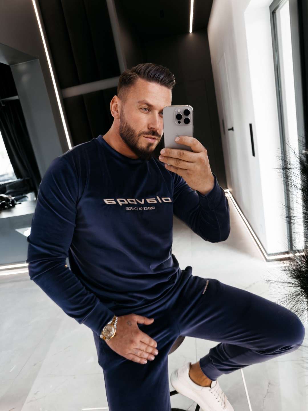Komplet z elastycznego weluru składający się z spodni oraz bluzy. Okrągły dekolt. Rękawy, nogawki, pas w spodniach, dół bluzy zakończone ściągaczem. Na przodzie Logo marki z hasłem.