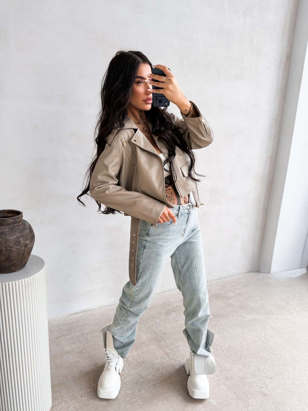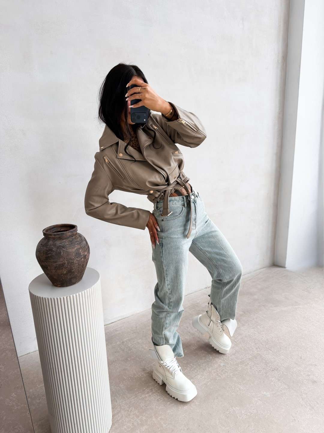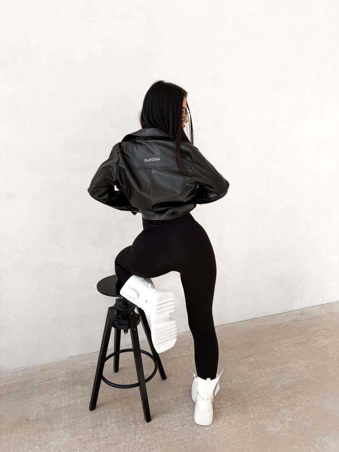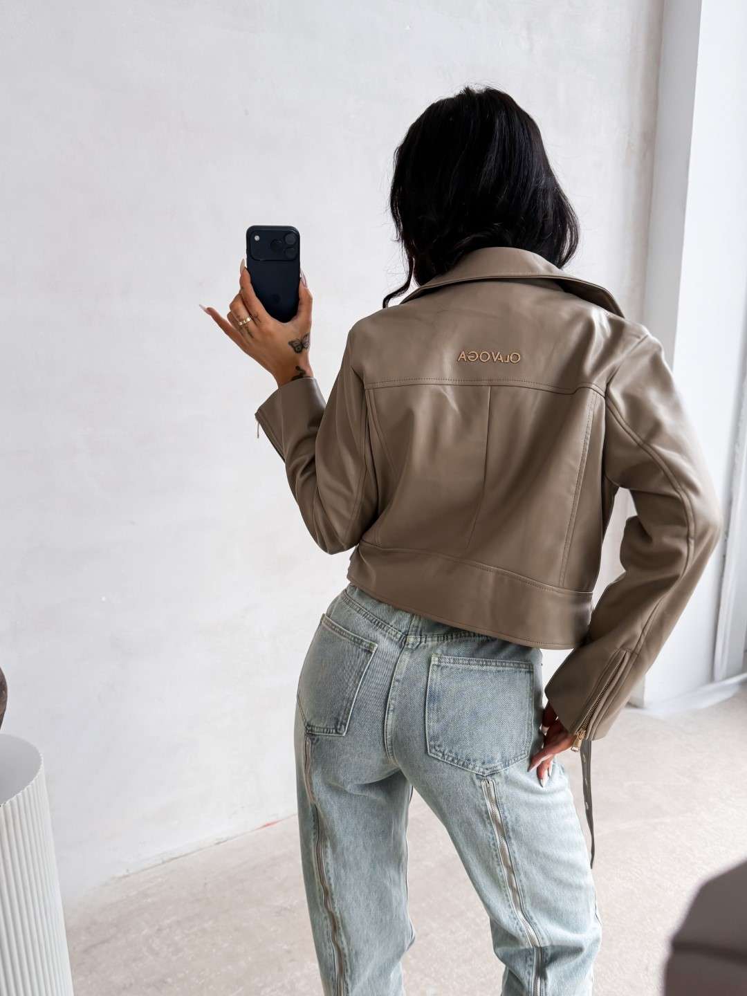 Kurtka o krótkim kroju wykonana z imitacji skóry. Model z kołnierzem i asymetrycznym zapięciem na suwak. Z przodu kieszenie zapinane na zamki oraz ozdobna klapa z napą. Dół kurtki wykończony paskiem z regulacją. Na plecach logowanie.