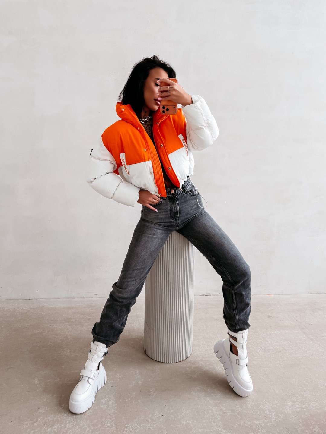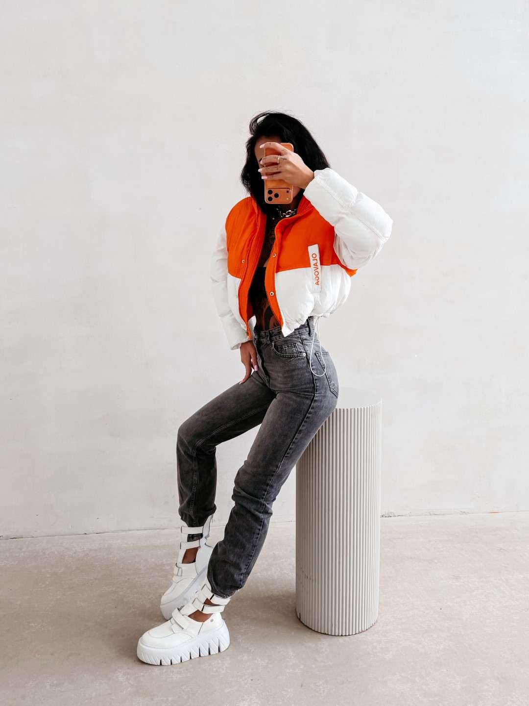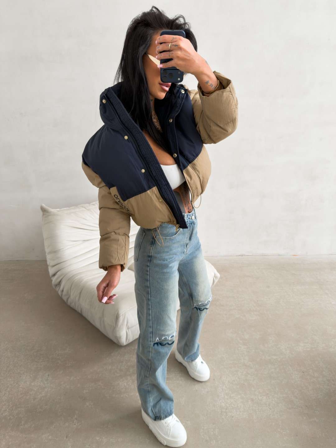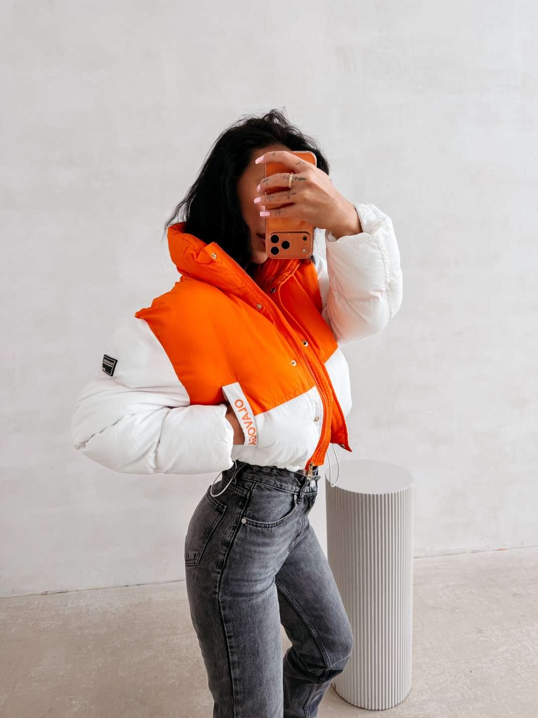 Krótka kurtka o pikowanej konstrukcji, wykonana z lekkiego, technicznego materiału. Model zapinany na zamek, z wysokim kołnierzem oraz obniżoną linią ramion. Kontrastowe zestawienie kolorystyczne. Rękawy zdobione logowaną taśmą OLAVOGA. Na przodzie naszywka z logo brandu.
