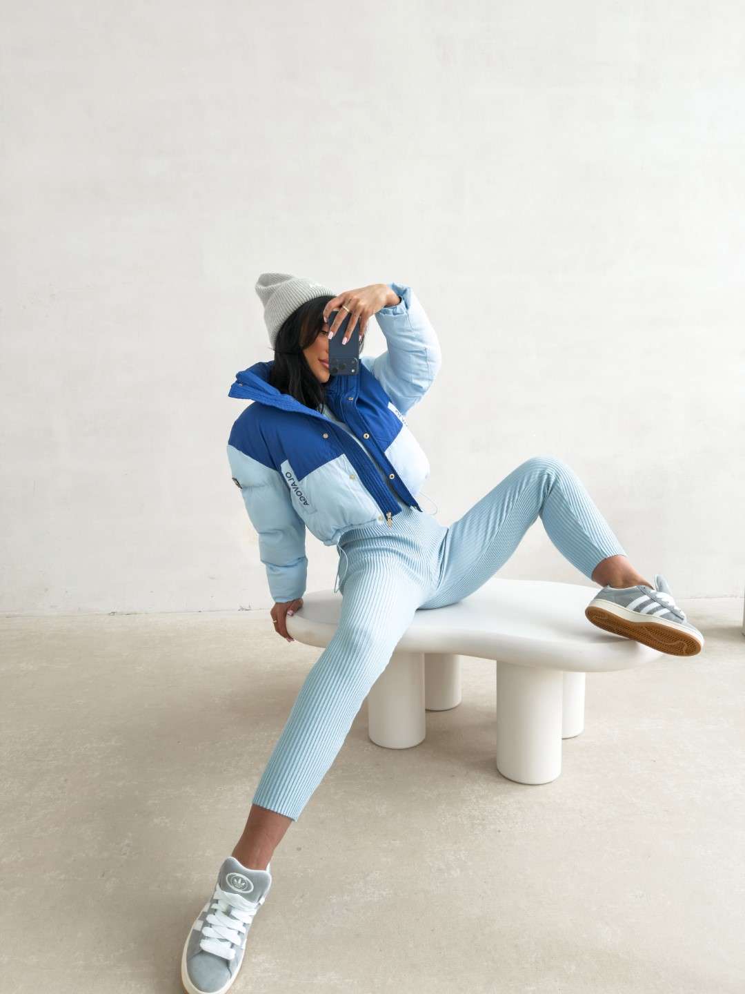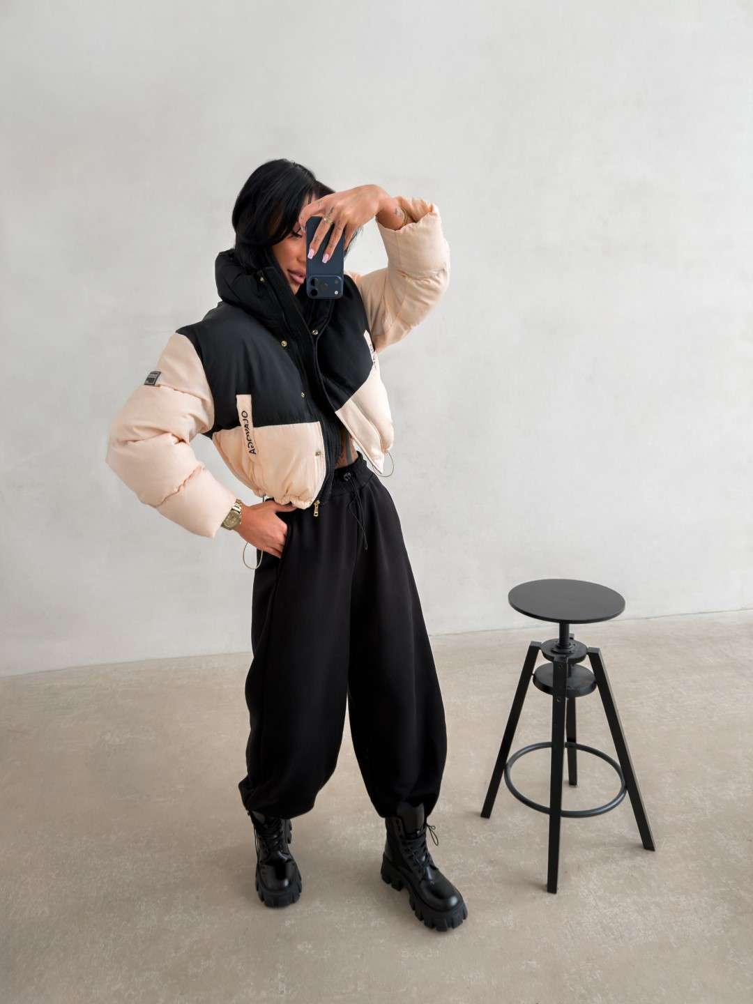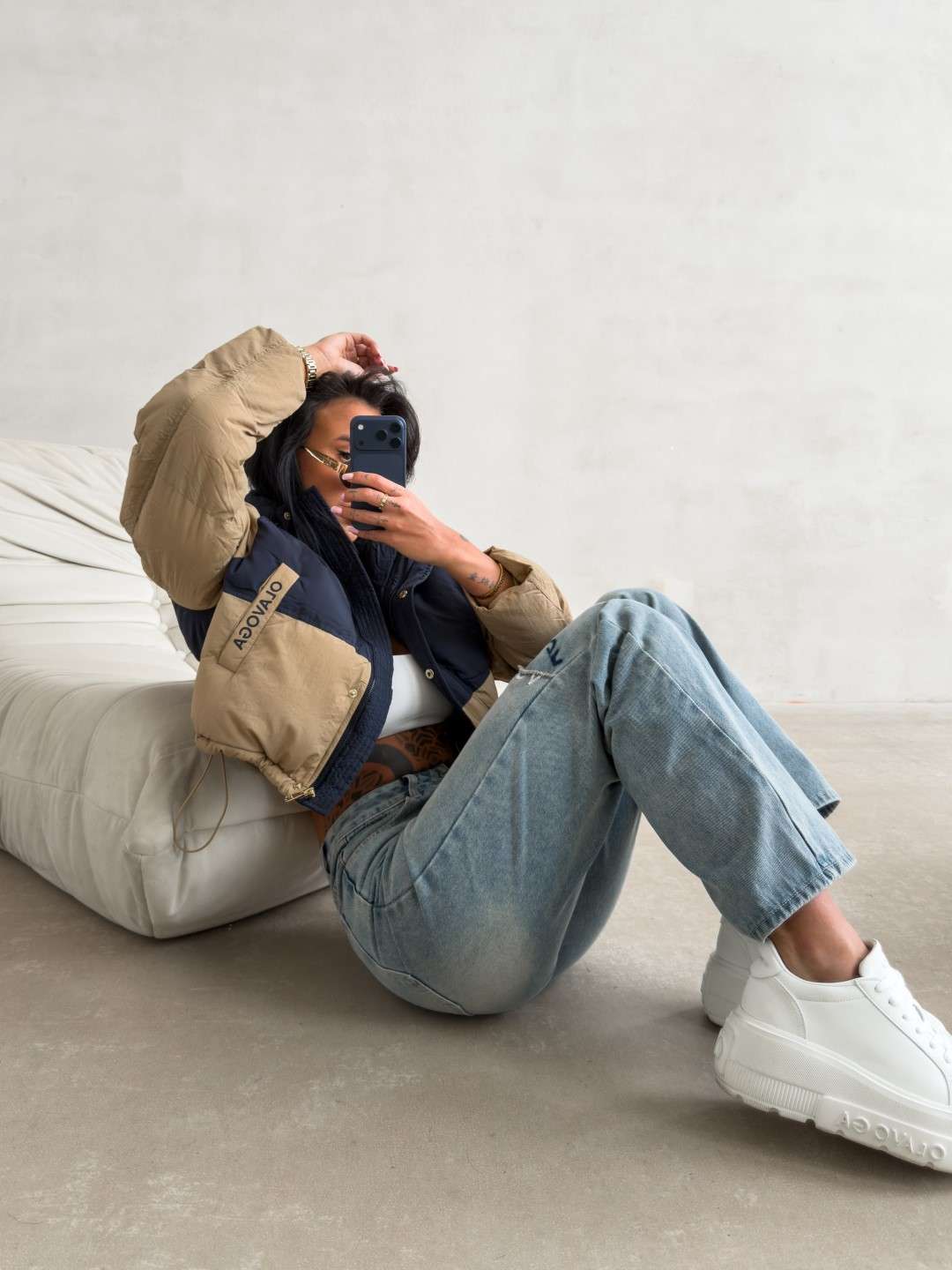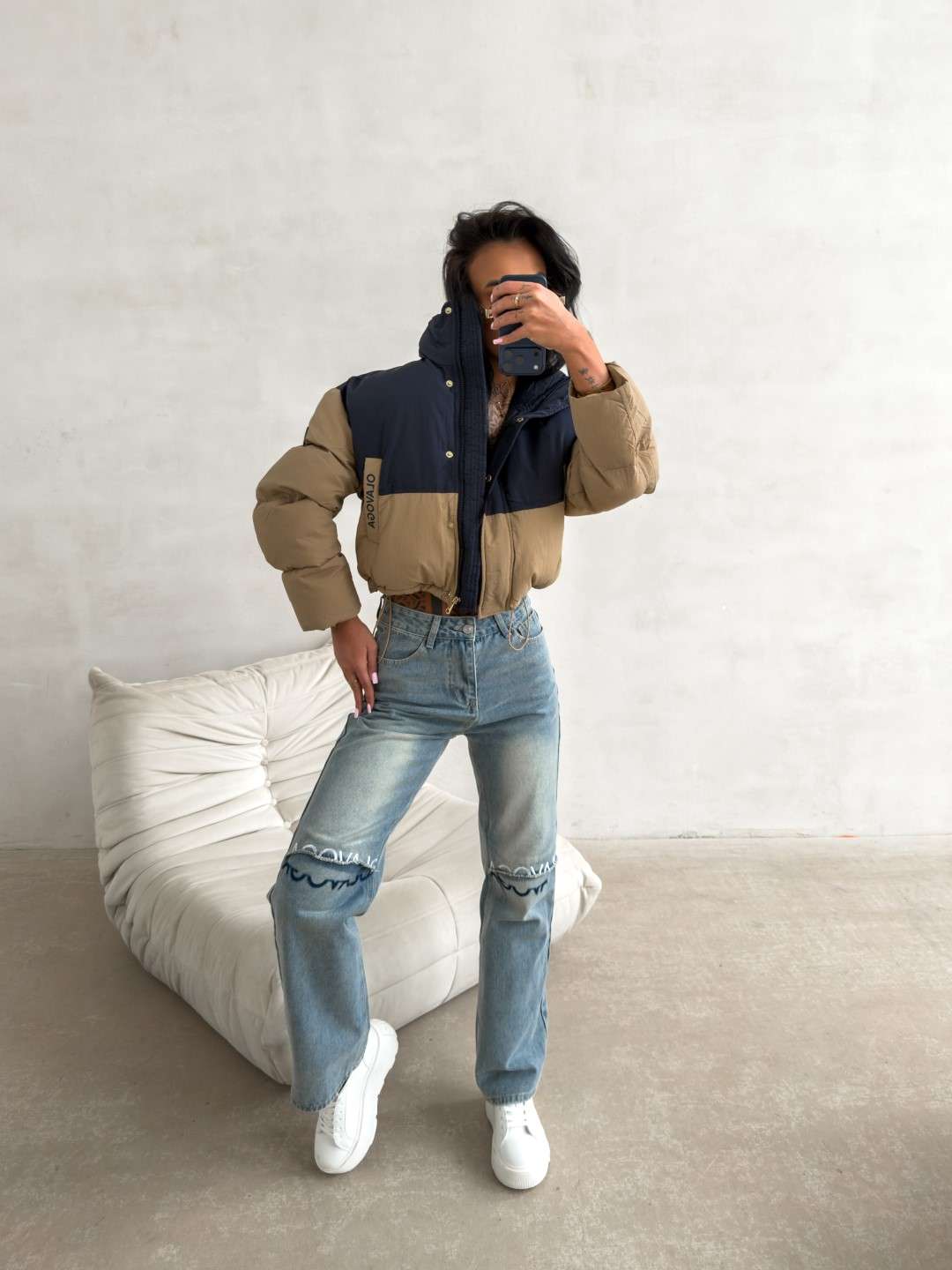 Krótka kurtka o pikowanej konstrukcji, wykonana z lekkiego, technicznego materiału. Model zapinany na zamek, z wysokim kołnierzem oraz obniżoną linią ramion. Kontrastowe zestawienie kolorystyczne. Rękawy zdobione logowaną taśmą OLAVOGA. Na przodzie naszywka z logo brandu.
