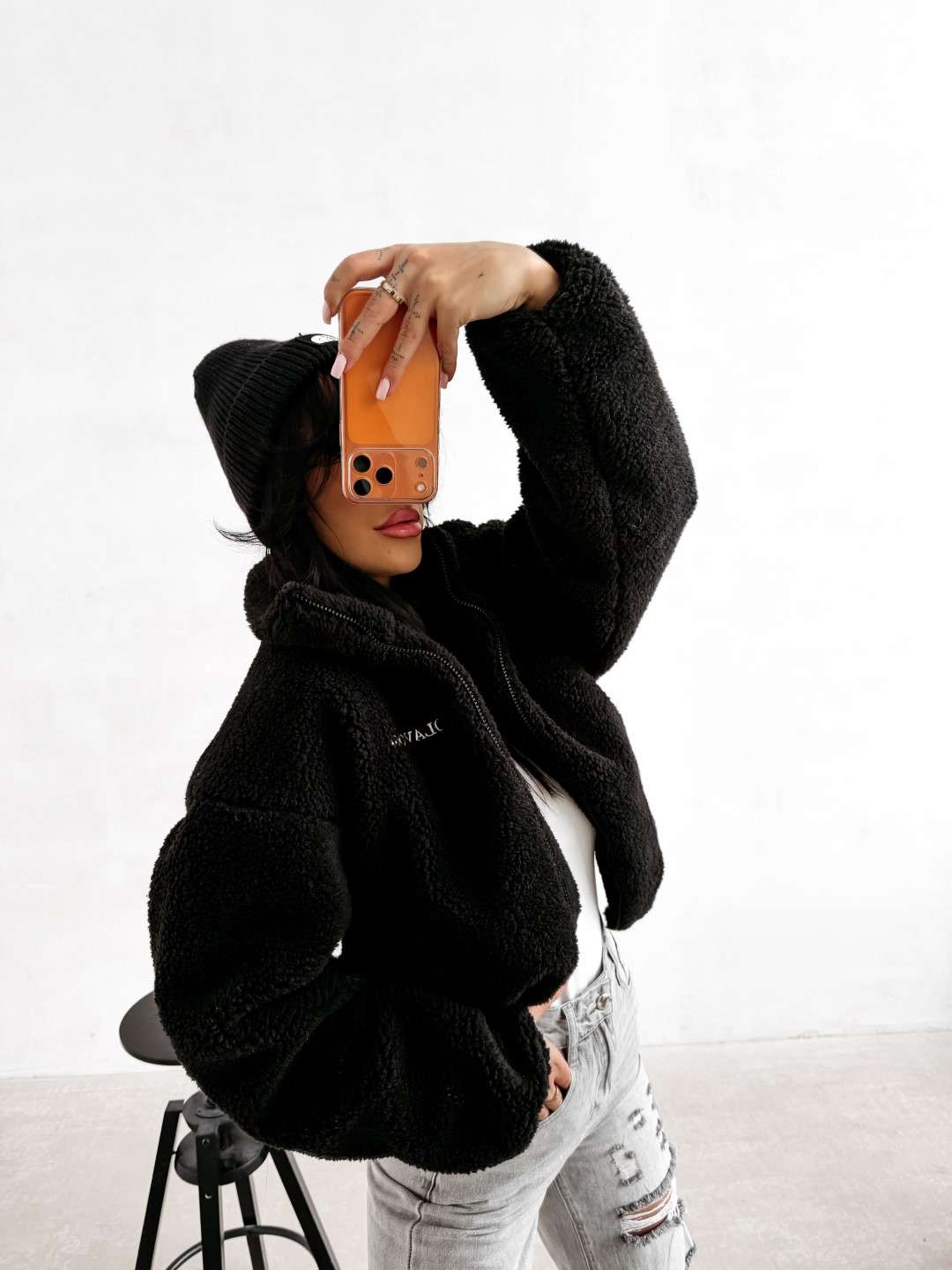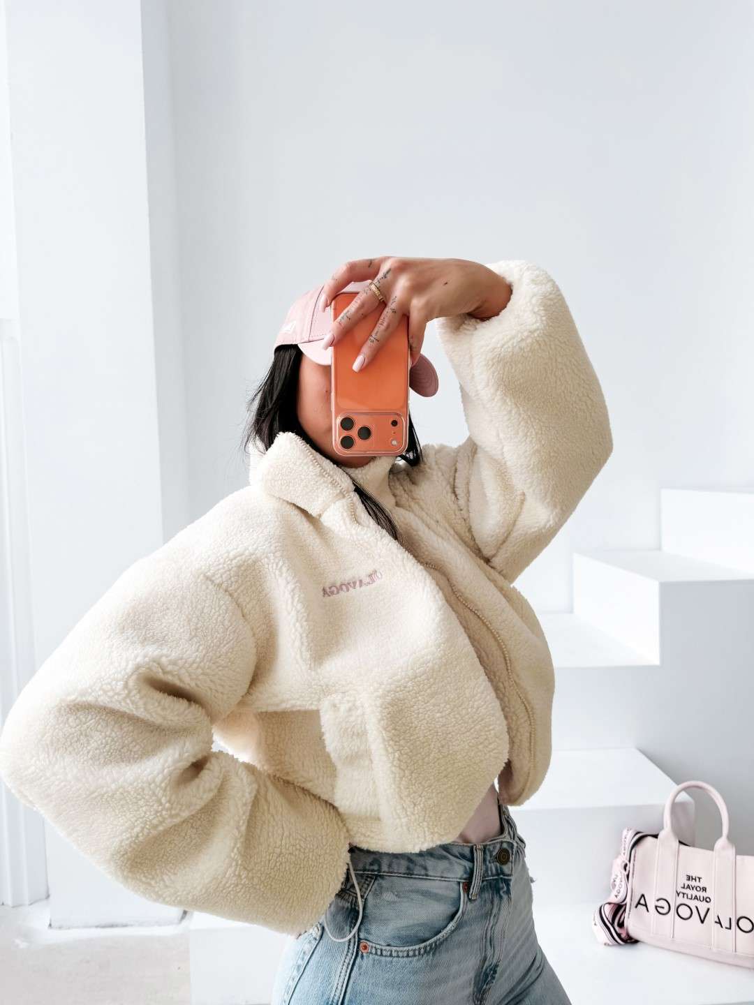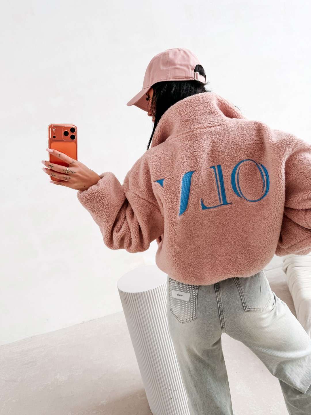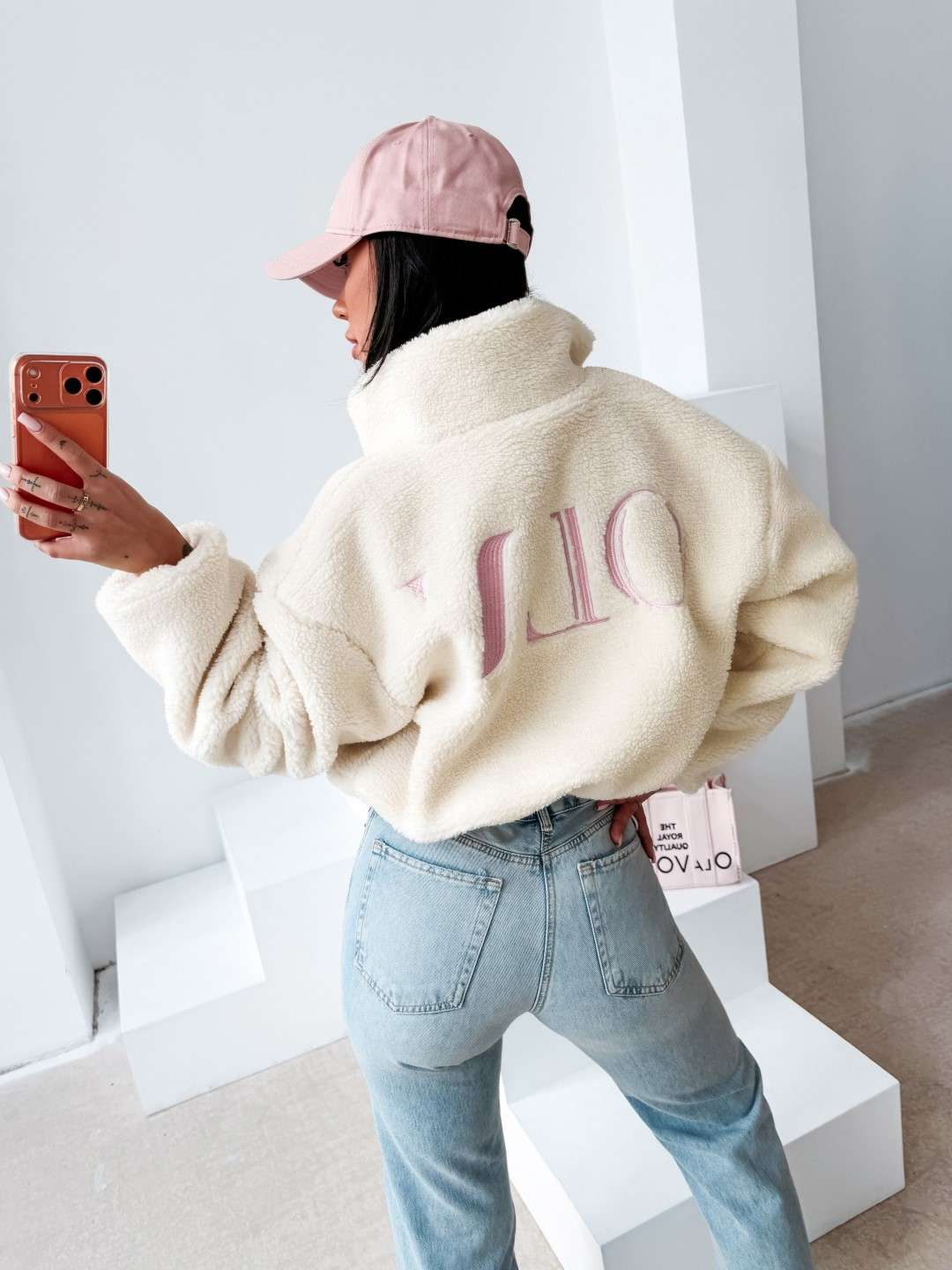 Casualowa kurtka, typu teddy z wysoką stójką, zapinana na zamek. Wykonana z miękkiego, przyjemnego w dotyku materiału o strukturze sherpa. Model o lekko krótszym kroju z obniżoną linią ramion. Po bokach praktyczne kieszenie. Na przodzie subtelny haft z logo marki OLAVOGA, natomiast na plecach efektowny, duży haft z inicjałami OLV.