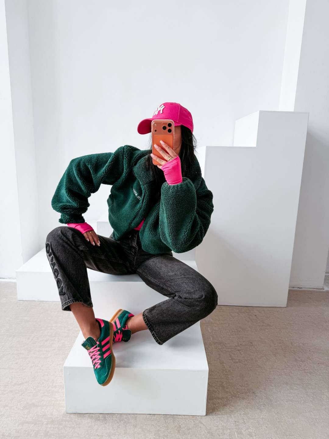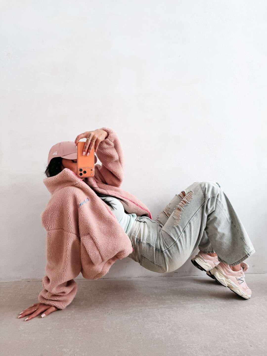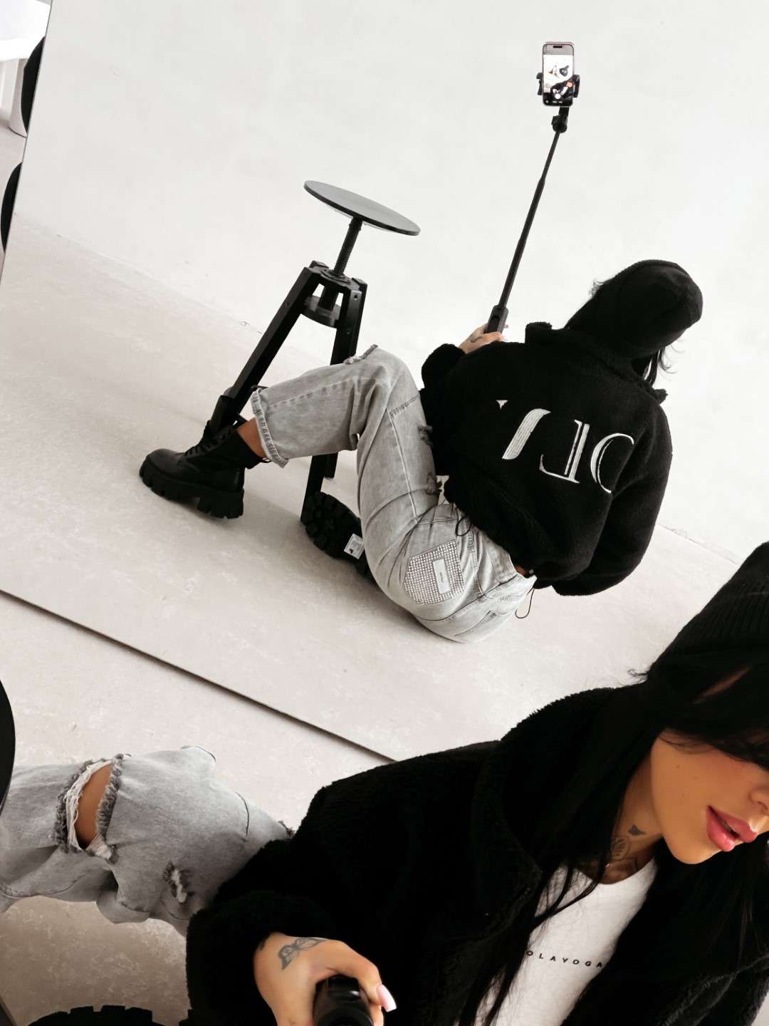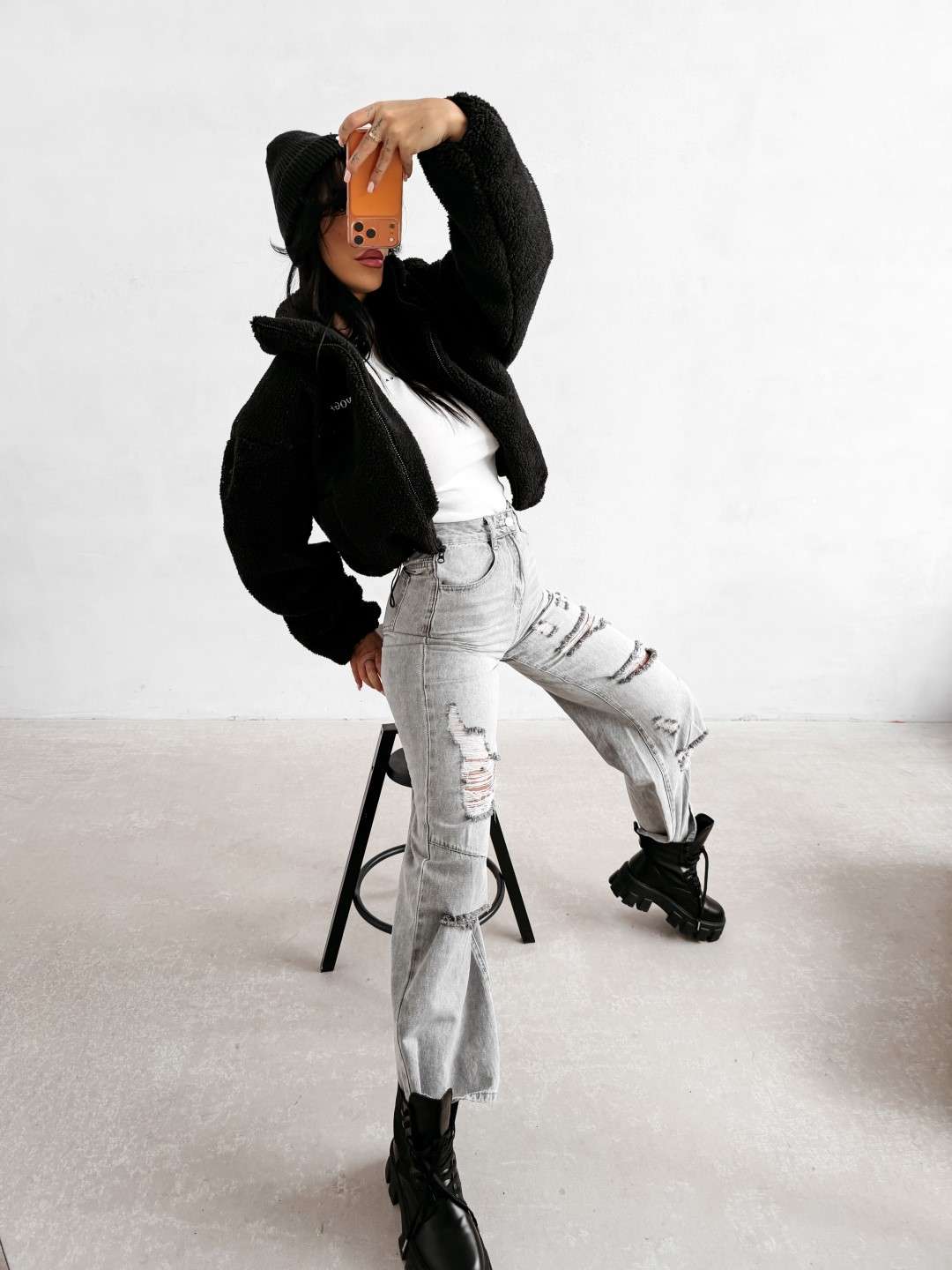 Casualowa kurtka, typu teddy z wysoką stójką, zapinana na zamek. Wykonana z miękkiego, przyjemnego w dotyku materiału o strukturze sherpa. Model o lekko krótszym kroju z obniżoną linią ramion. Po bokach praktyczne kieszenie. Na przodzie subtelny haft z logo marki OLAVOGA, natomiast na plecach efektowny, duży haft z inicjałami OLV.