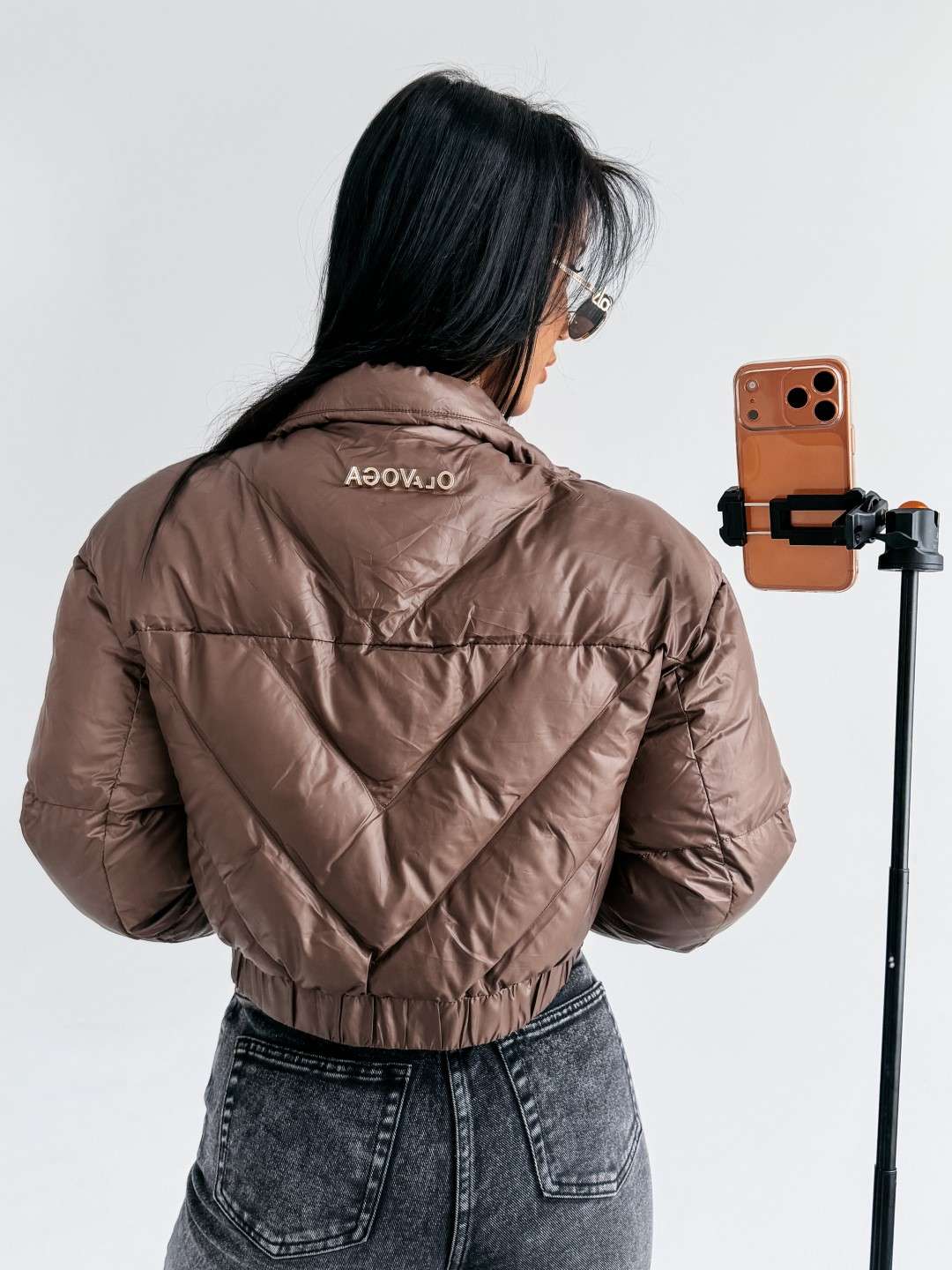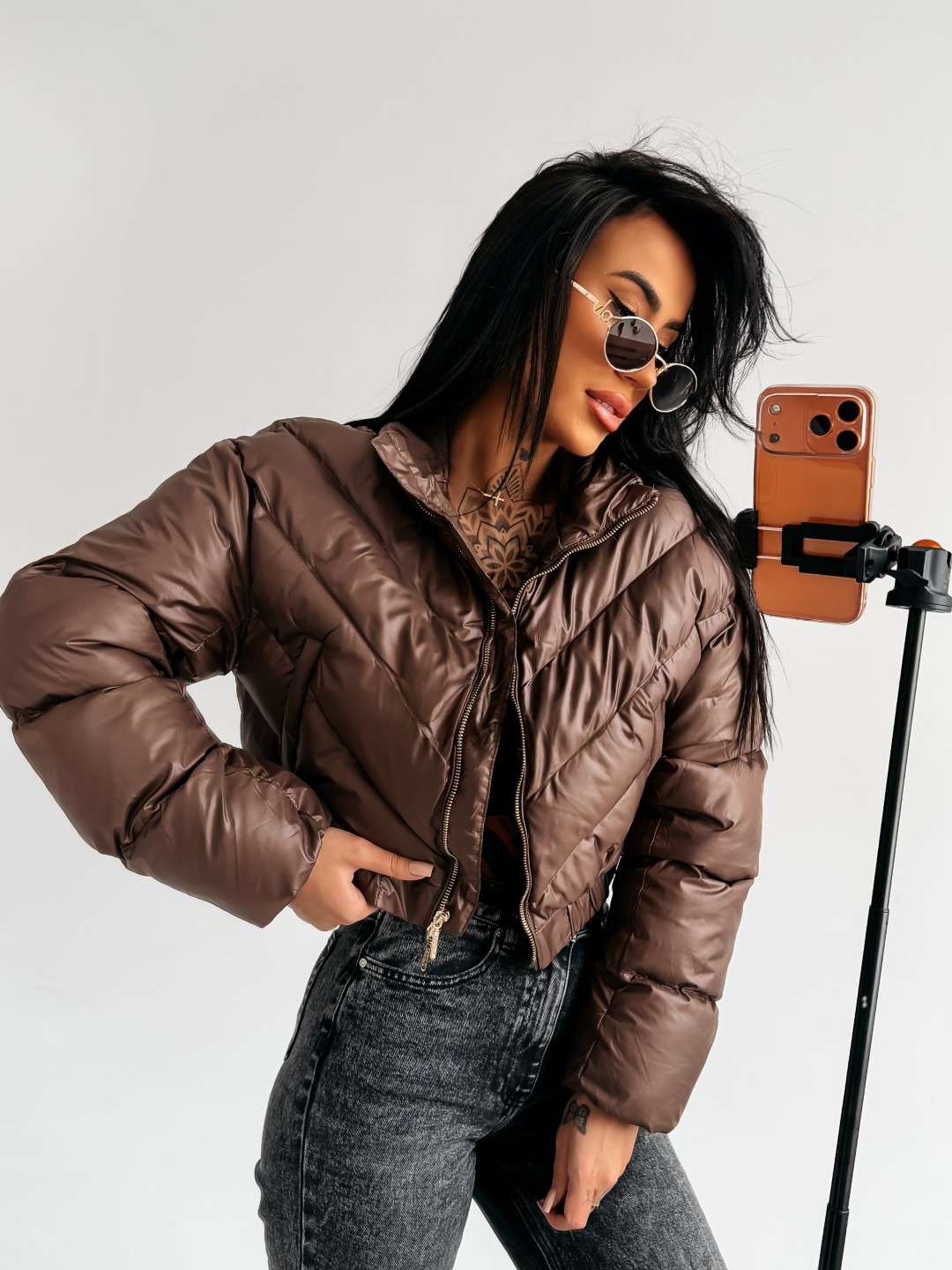Pikowana kurtka o nowoczesnym, lekko skróconym kroju. Model wykonany z gładkiej, lekko połyskującej tkaniny. Kurtka zapinana na solidny, złoty zamek z logo marki OLAVOGA. Model z wysoką stójką. Brzegi zakończone elastycznym wykończeniem. Na tyle umieszczone subtelne, złote logo marki OLAVOGA. Kurtka posiada praktyczne kieszenie zapinane na zamek.