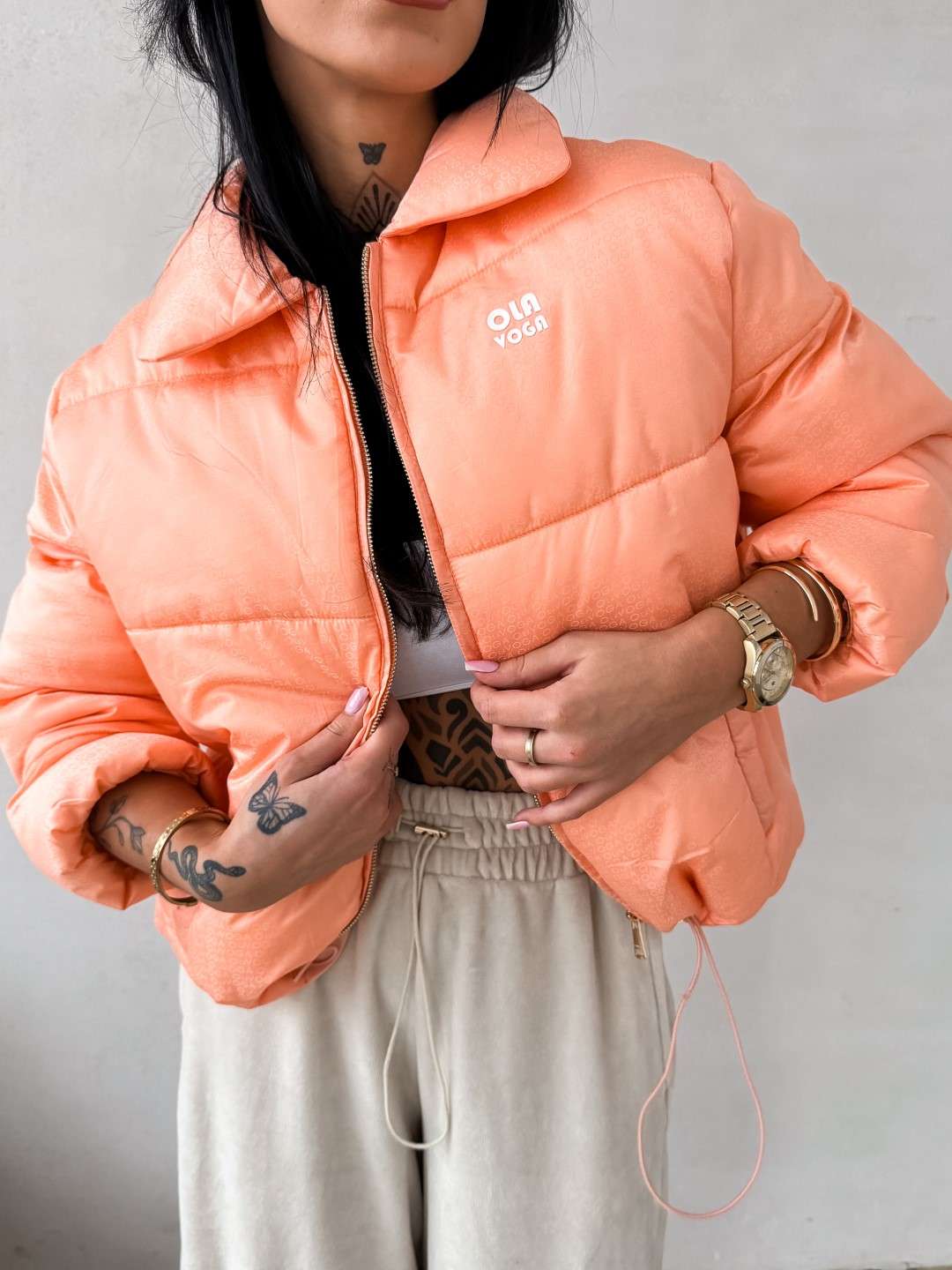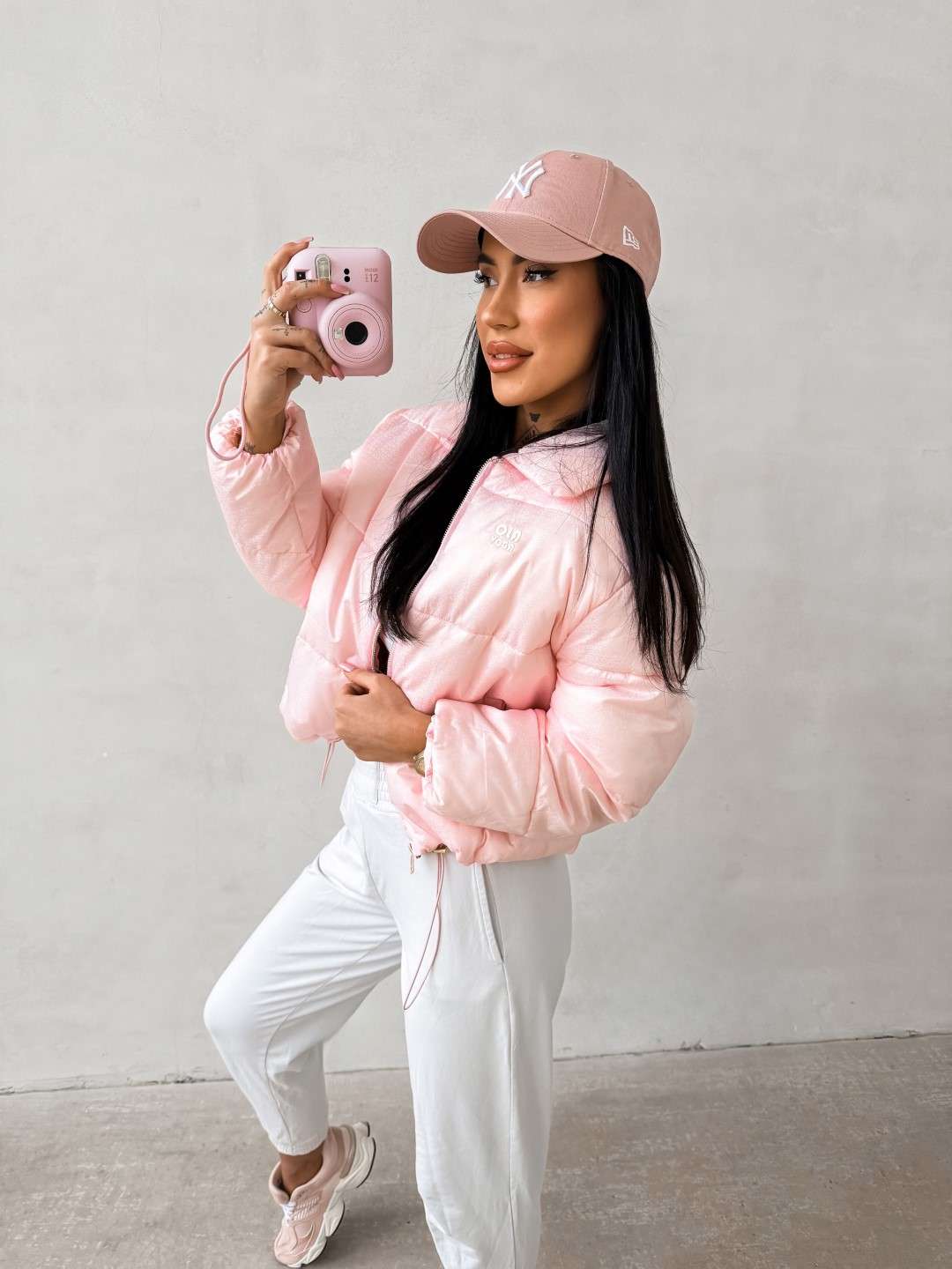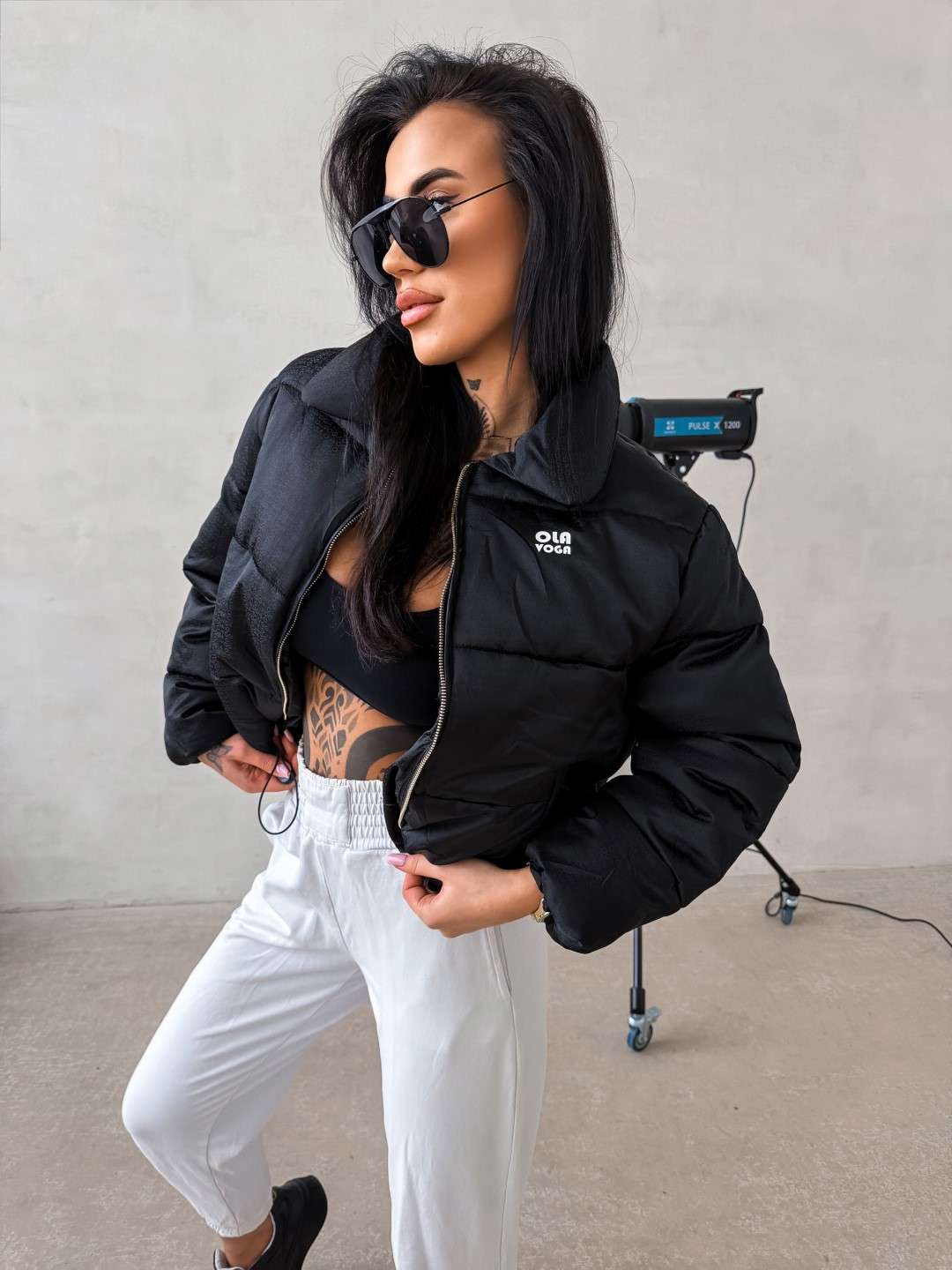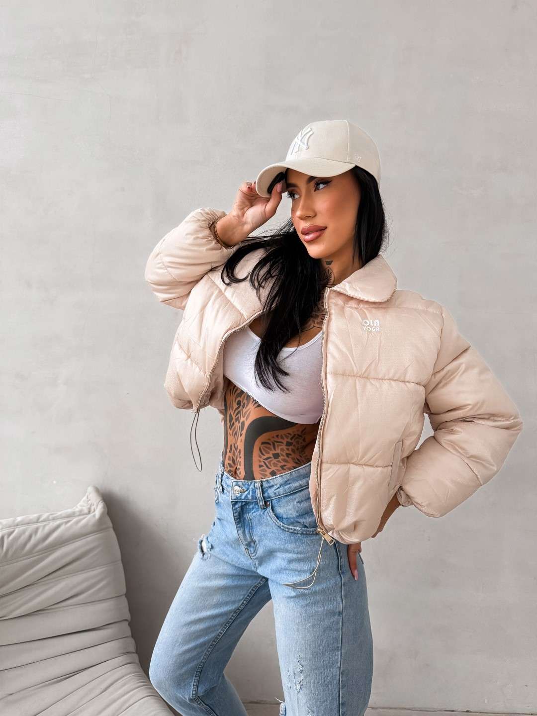 Pikowana kurtka o nowoczesnym, casualowym charakterze,. Model wykonany z lekkiego materiału o subtelnej, satynowej strukturze, zdobionego delikatnym, tonalnym monogramem z logo marki OLAVOGA na całej powierzchni. Kurtka zapinana na solidny suwak. Wysoki, miękko wyprofilowany kołnierz. Model wyposażony w praktyczne, boczne kieszenie. Dół kurtki regulowany za pomocą troków. Na przodzie minimalistyczne, kontrastowe logo marki OLAVOGA.