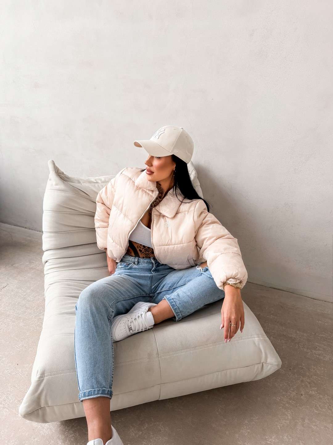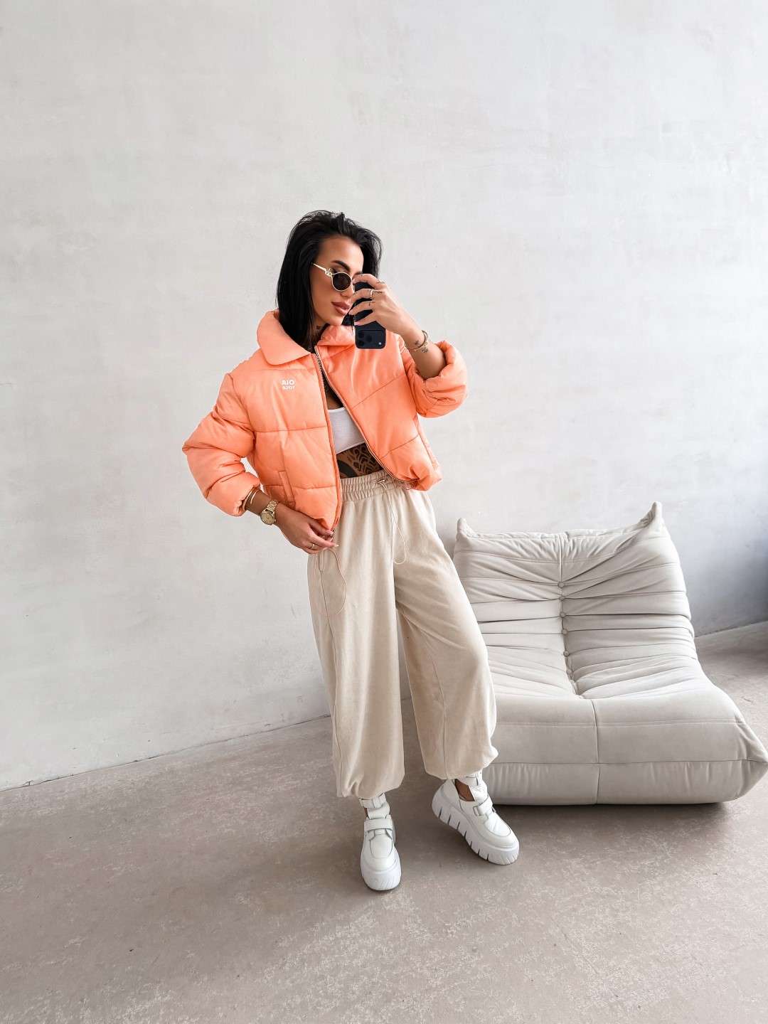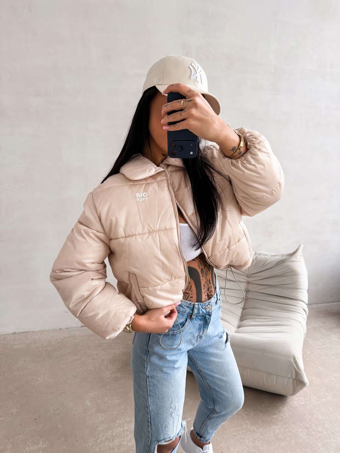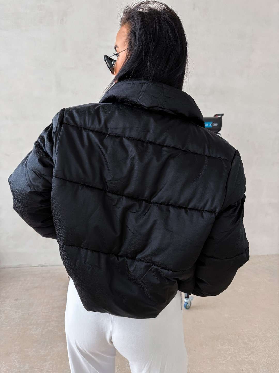 Pikowana kurtka o nowoczesnym, casualowym charakterze,. Model wykonany z lekkiego materiału o subtelnej, satynowej strukturze, zdobionego delikatnym, tonalnym monogramem z logo marki OLAVOGA na całej powierzchni. Kurtka zapinana na solidny suwak. Wysoki, miękko wyprofilowany kołnierz. Model wyposażony w praktyczne, boczne kieszenie. Dół kurtki regulowany za pomocą troków. Na przodzie minimalistyczne, kontrastowe logo marki OLAVOGA.