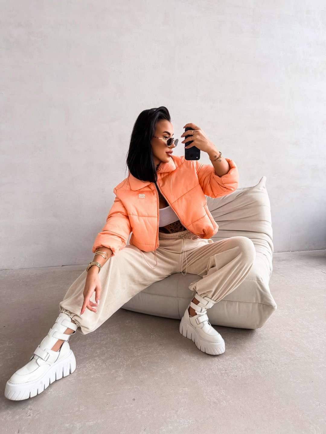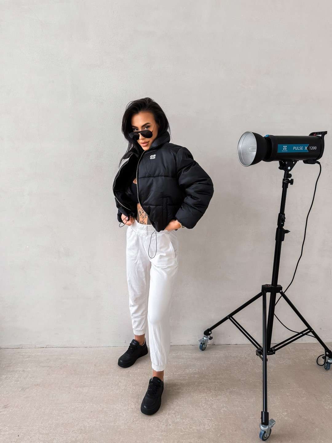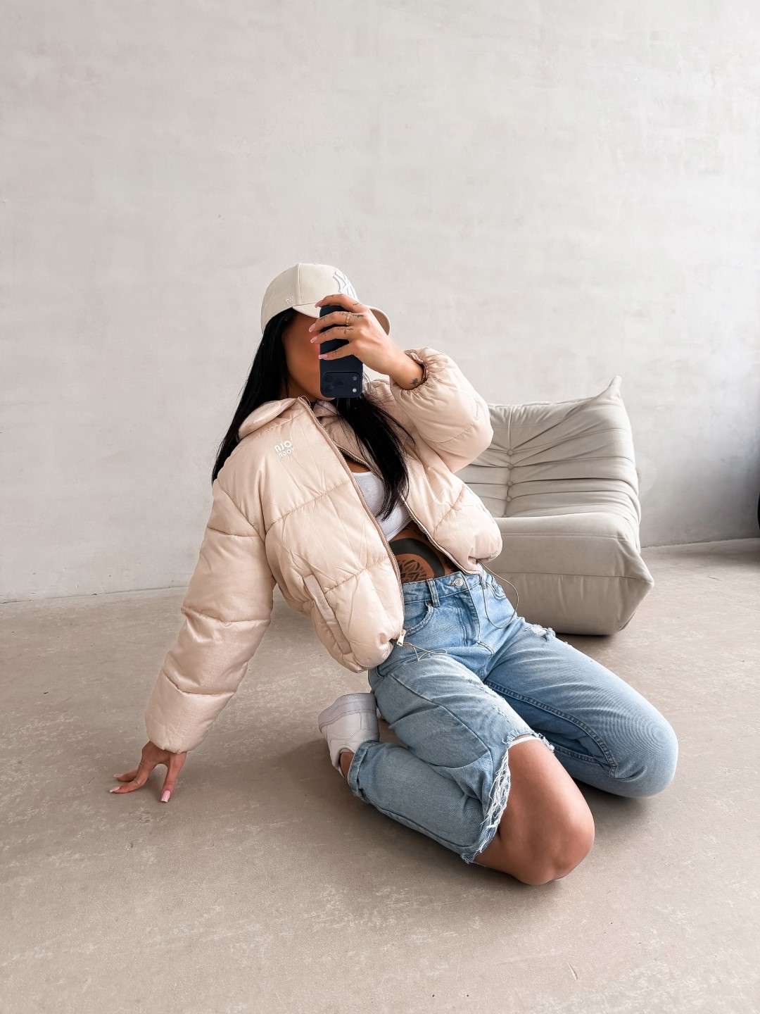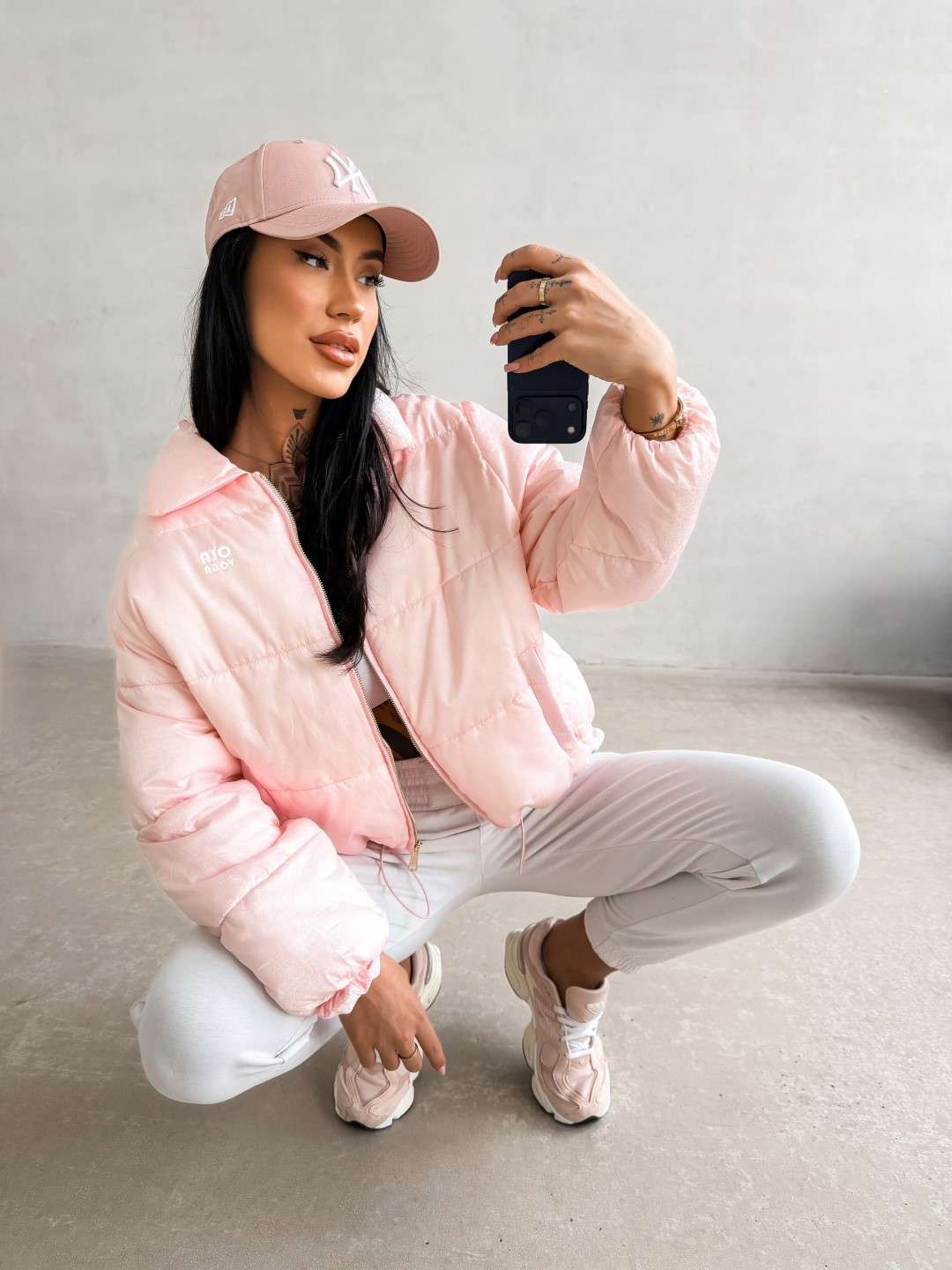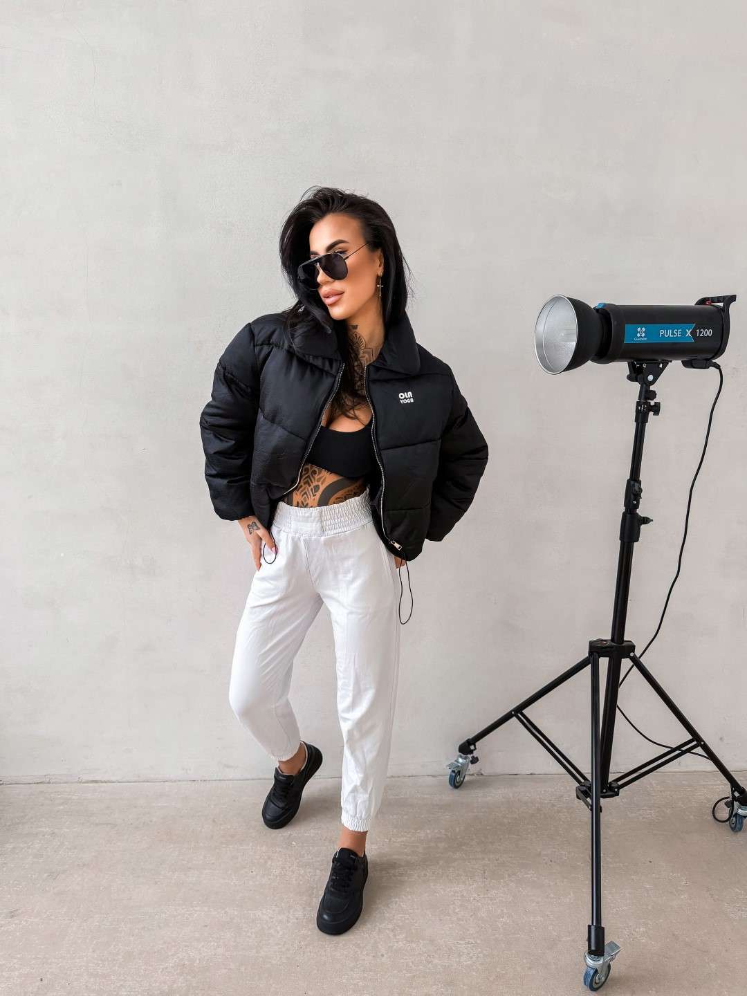 Pikowana kurtka o nowoczesnym, casualowym charakterze,. Model wykonany z lekkiego materiału o subtelnej, satynowej strukturze, zdobionego delikatnym, tonalnym monogramem z logo marki OLAVOGA na całej powierzchni. Kurtka zapinana na solidny suwak. Wysoki, miękko wyprofilowany kołnierz. Model wyposażony w praktyczne, boczne kieszenie. Dół kurtki regulowany za pomocą troków. Na przodzie minimalistyczne, kontrastowe logo marki OLAVOGA.