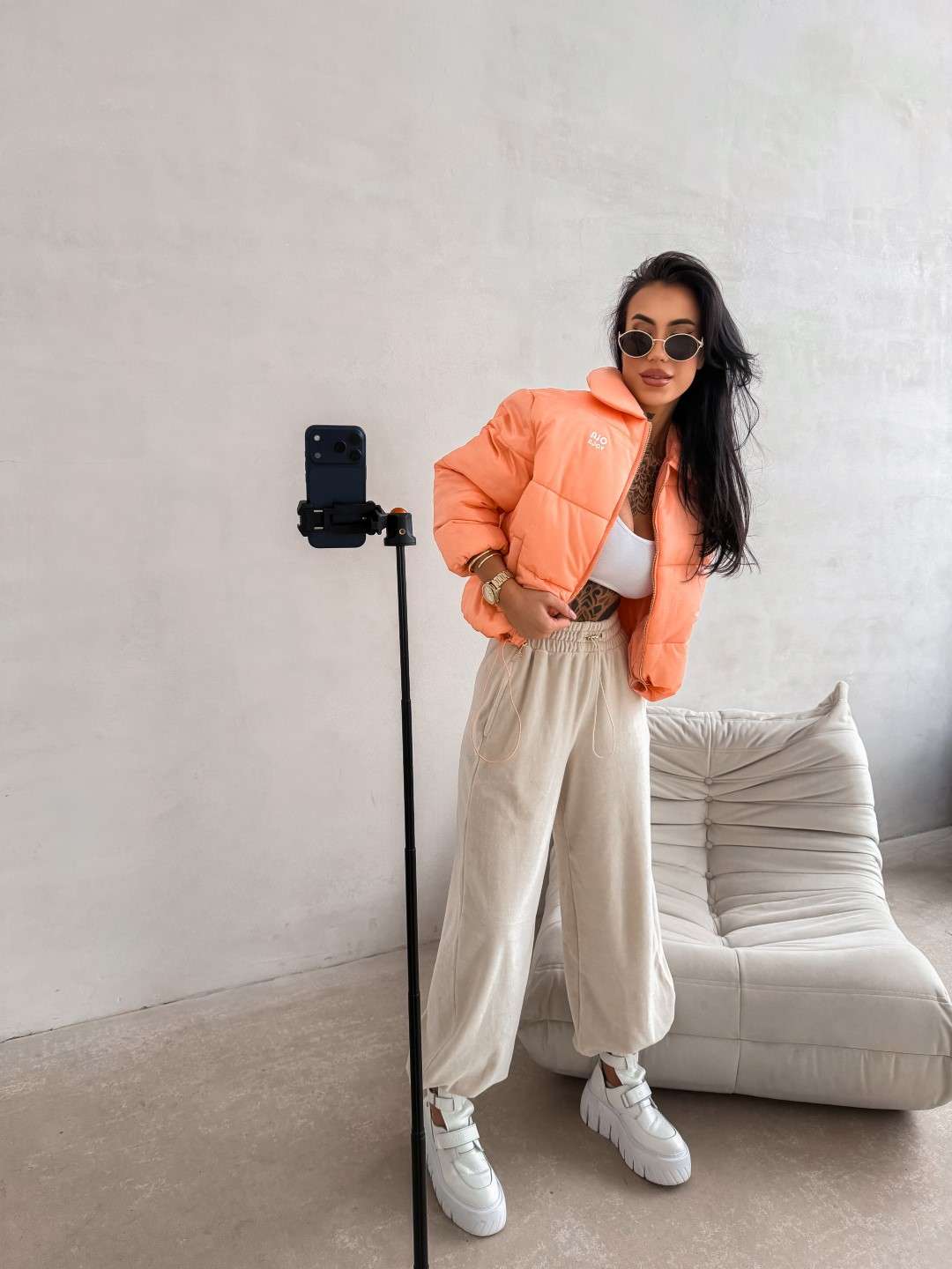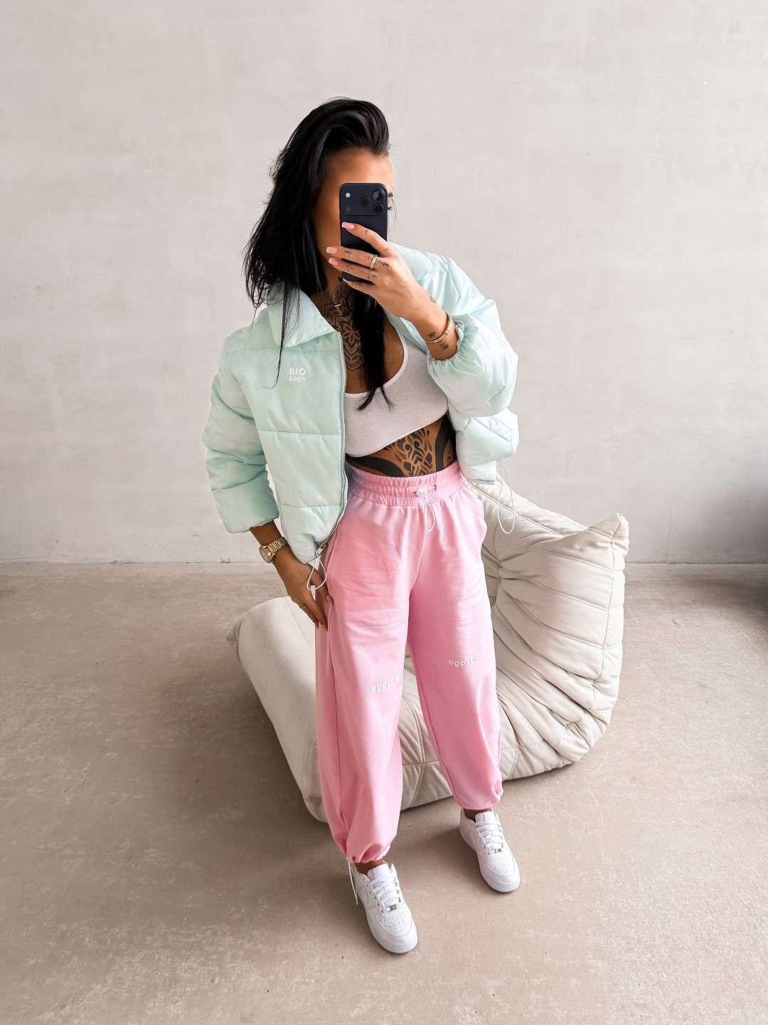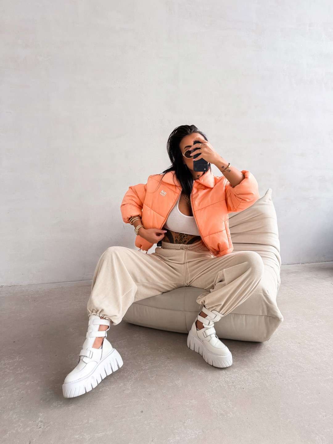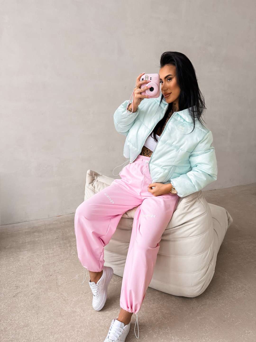 Pikowana kurtka o nowoczesnym, casualowym charakterze,. Model wykonany z lekkiego materiału o subtelnej, satynowej strukturze, zdobionego delikatnym, tonalnym monogramem z logo marki OLAVOGA na całej powierzchni. Kurtka zapinana na solidny suwak. Wysoki, miękko wyprofilowany kołnierz. Model wyposażony w praktyczne, boczne kieszenie. Dół kurtki regulowany za pomocą troków. Na przodzie minimalistyczne, kontrastowe logo marki OLAVOGA.