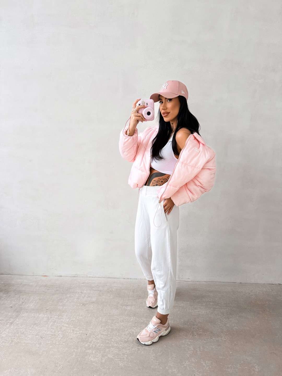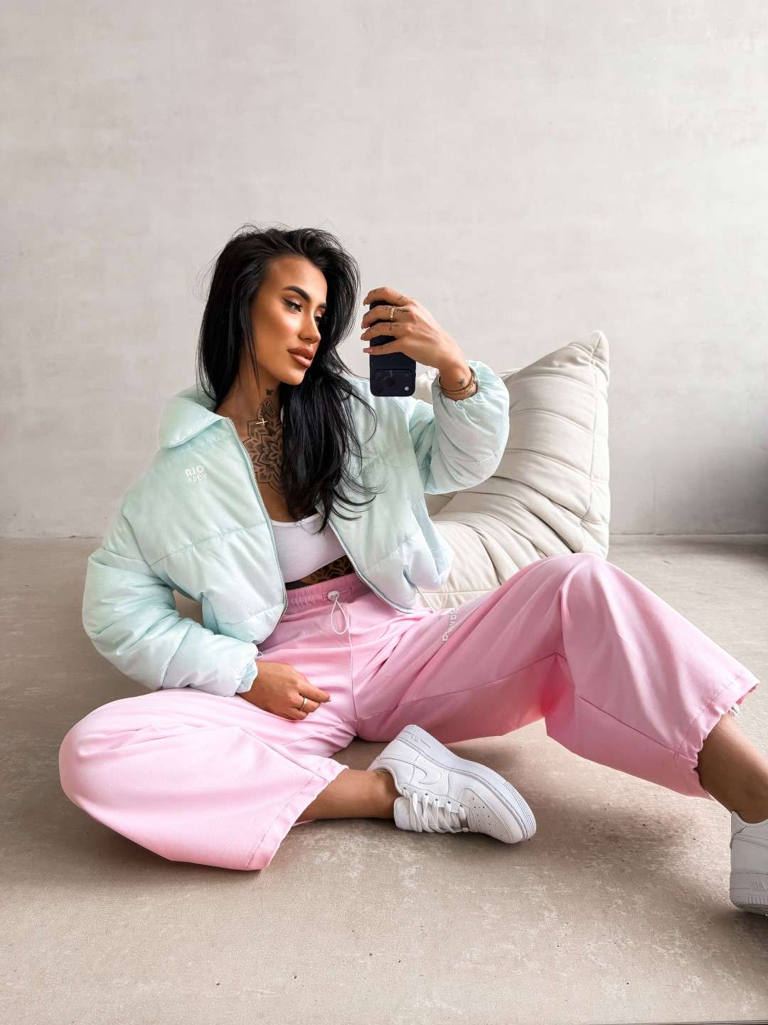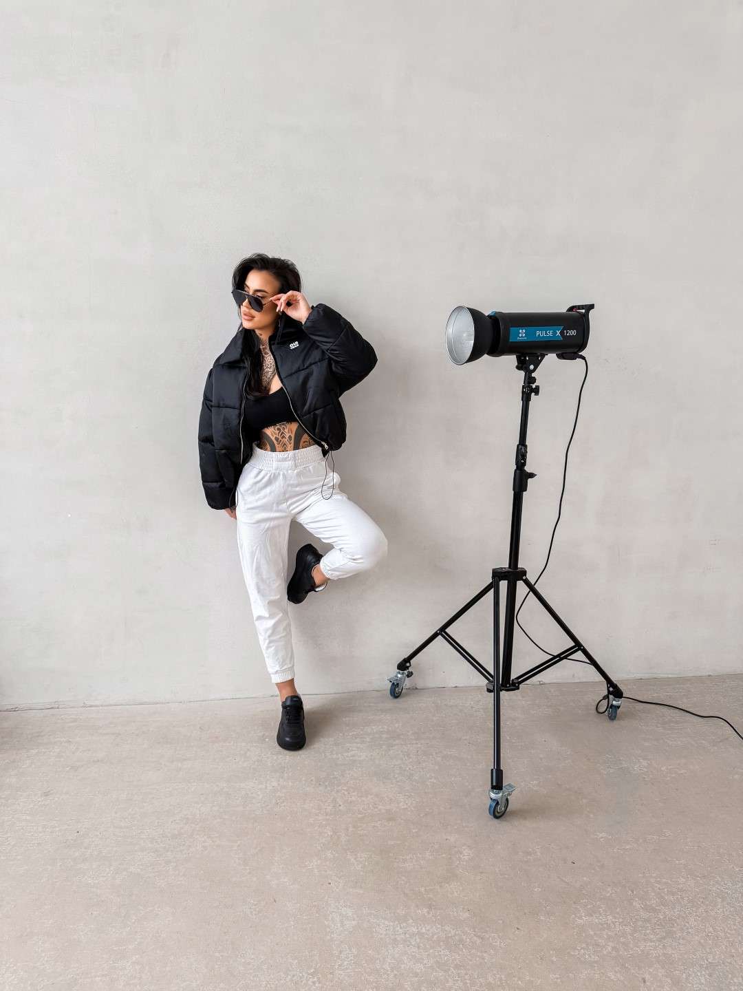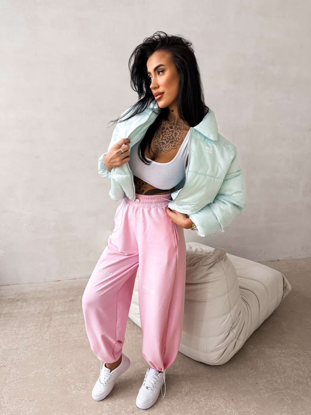 Pikowana kurtka o nowoczesnym, casualowym charakterze,. Model wykonany z lekkiego materiału o subtelnej, satynowej strukturze, zdobionego delikatnym, tonalnym monogramem z logo marki OLAVOGA na całej powierzchni. Kurtka zapinana na solidny suwak. Wysoki, miękko wyprofilowany kołnierz. Model wyposażony w praktyczne, boczne kieszenie. Dół kurtki regulowany za pomocą troków. Na przodzie minimalistyczne, kontrastowe logo marki OLAVOGA.